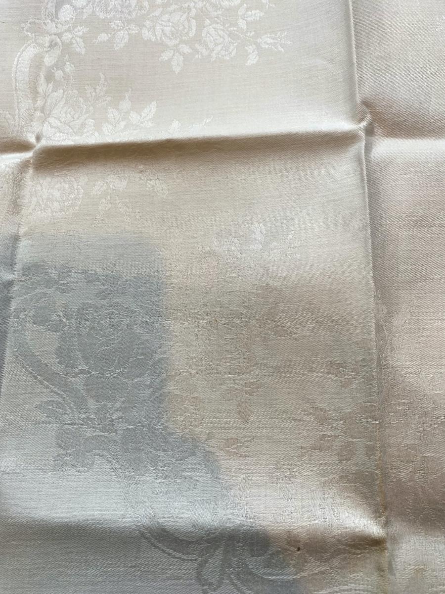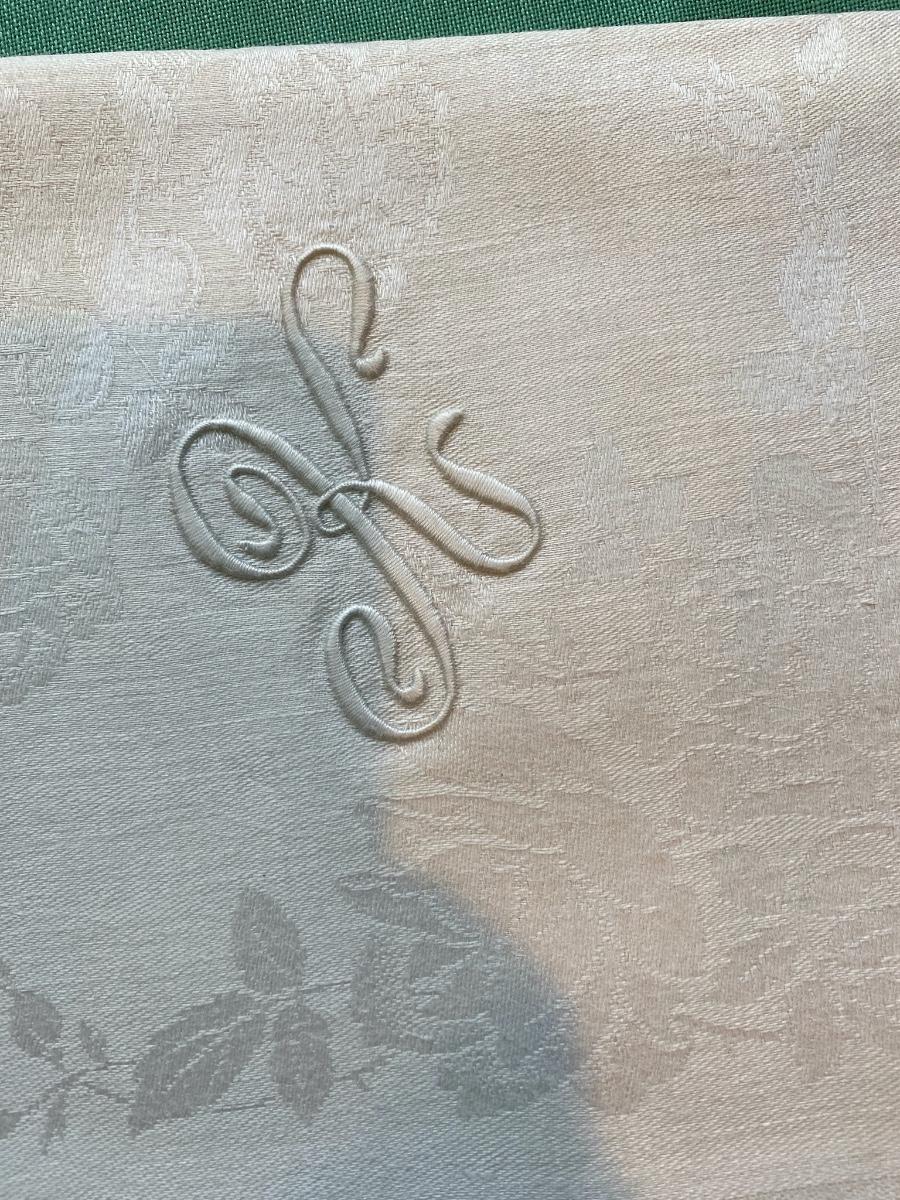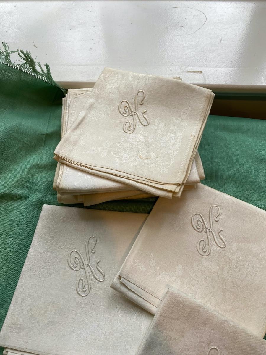 This Set of 12 damask dinner napkins are from the home of Dr. Paul Francis Kerr, Beautiful rose motif with the monogram K. Own a piece of history from a renoun mineral geologist. 25" X 27" Some yellowing on corners and minimal show of use.