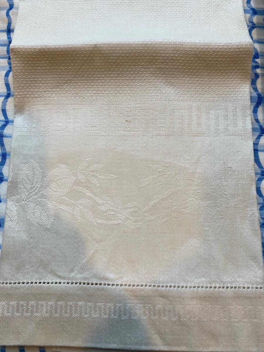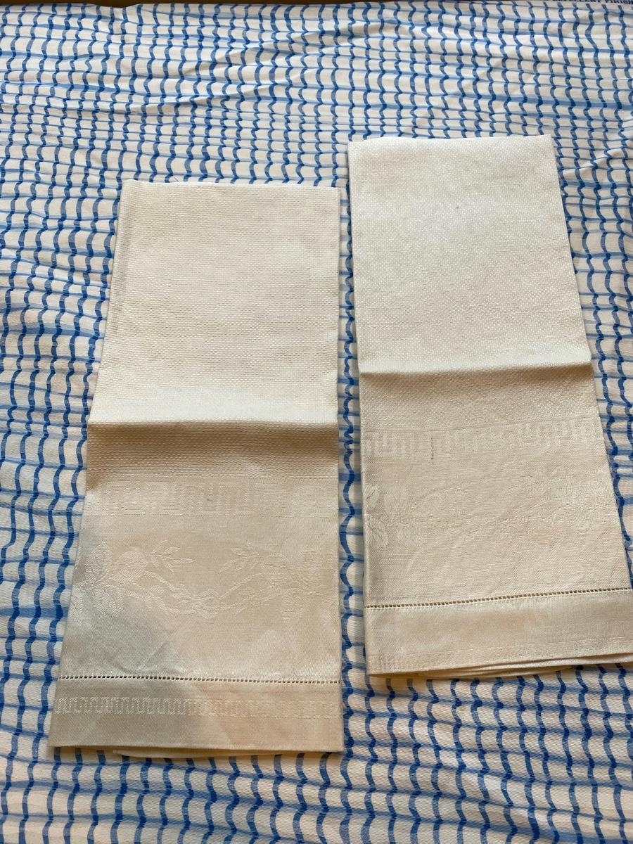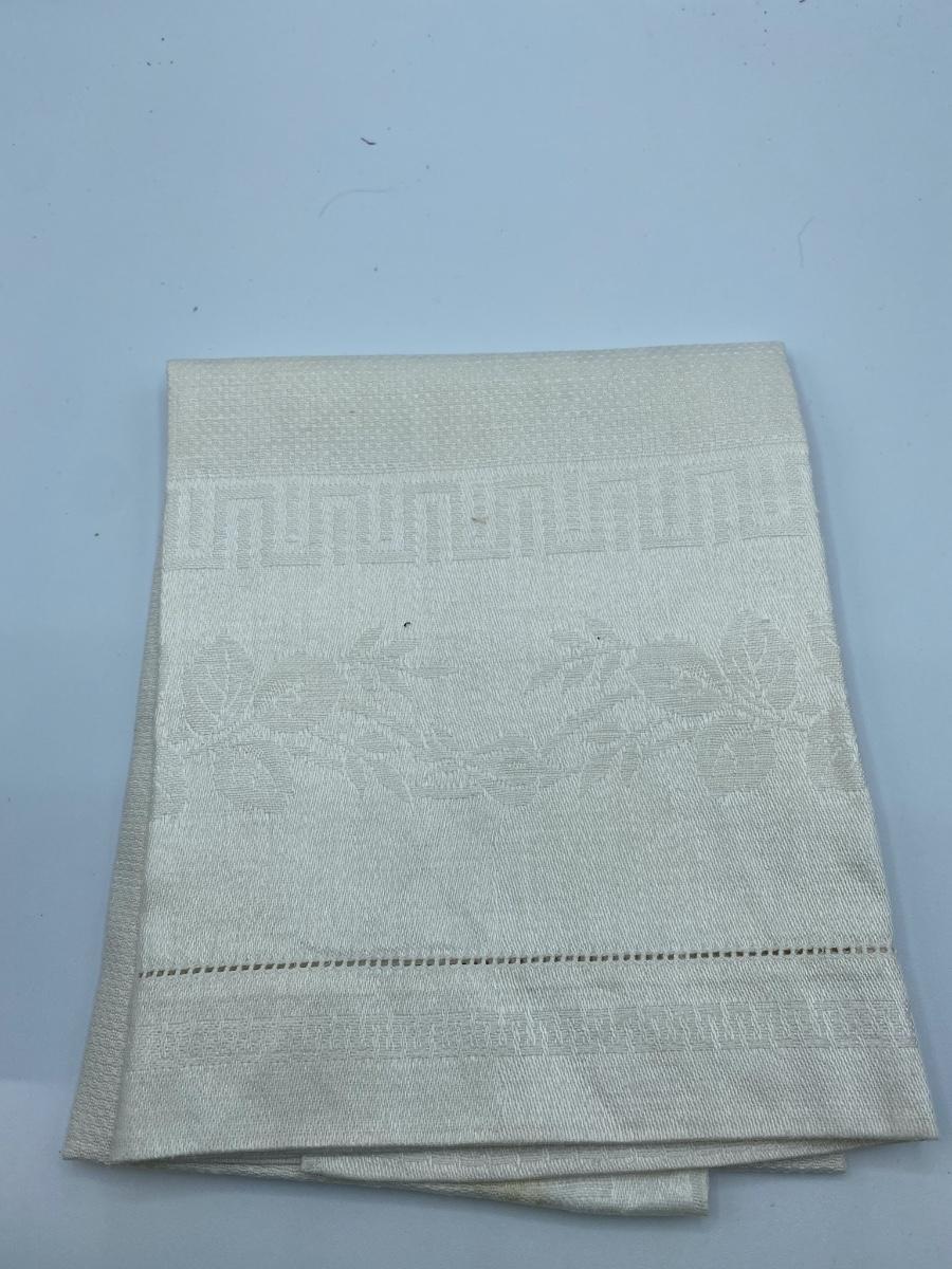 Pair of pretty damask hand towels with greek key and trellis rose motif. Some wear. 18" X 32"