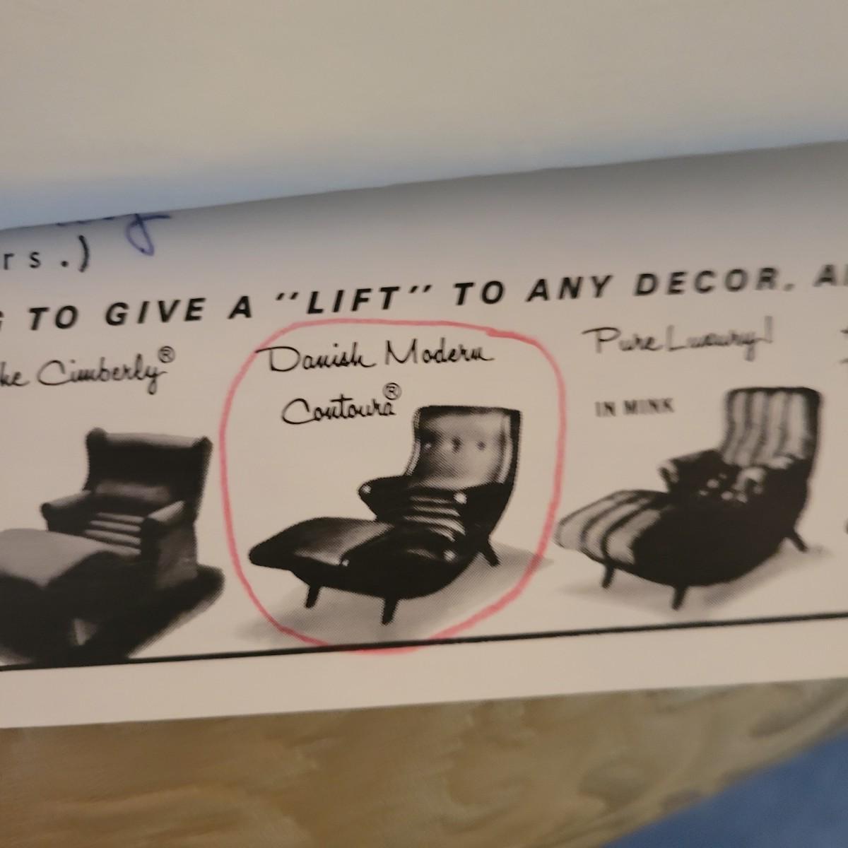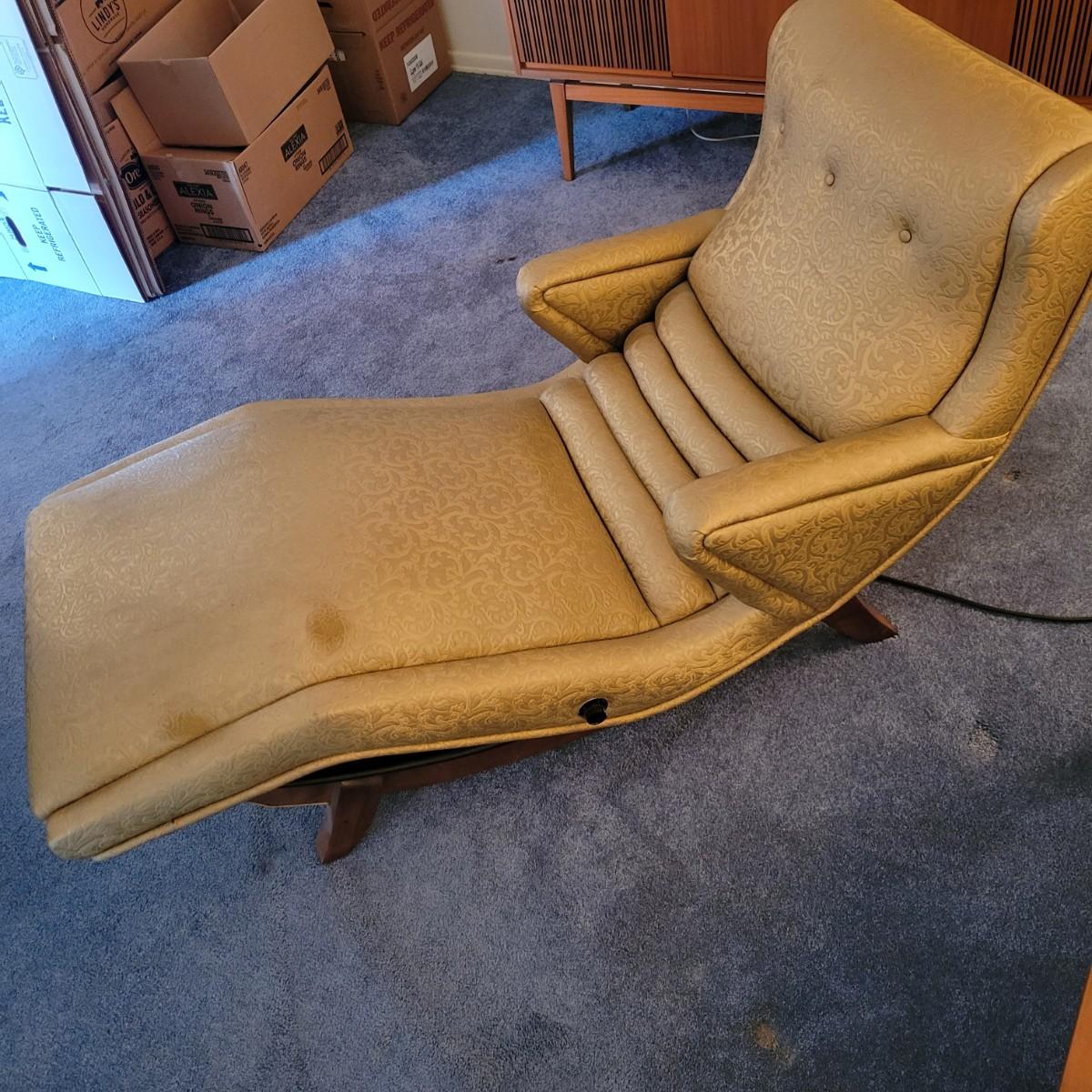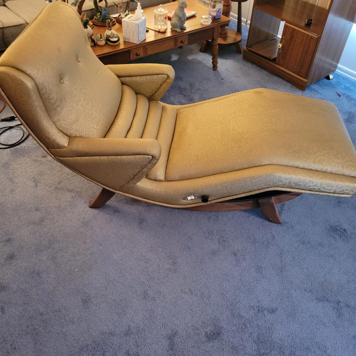A vintage Contour Lounge Chair in the Danish Modern Style that has an embossed vinyl upholstery and powered on when plugged in. It pivots on its frame from an upright position to a position where the feet are higher than the head. It features powerslide, vibration and heated back. It measures approximately 27" x 55" x 31"H. There are some stains on the upholstery, see attached pictures for more detail. Local pickup only. Winning bidder must bring assistance to help move and load this item due to its weight and/or size.