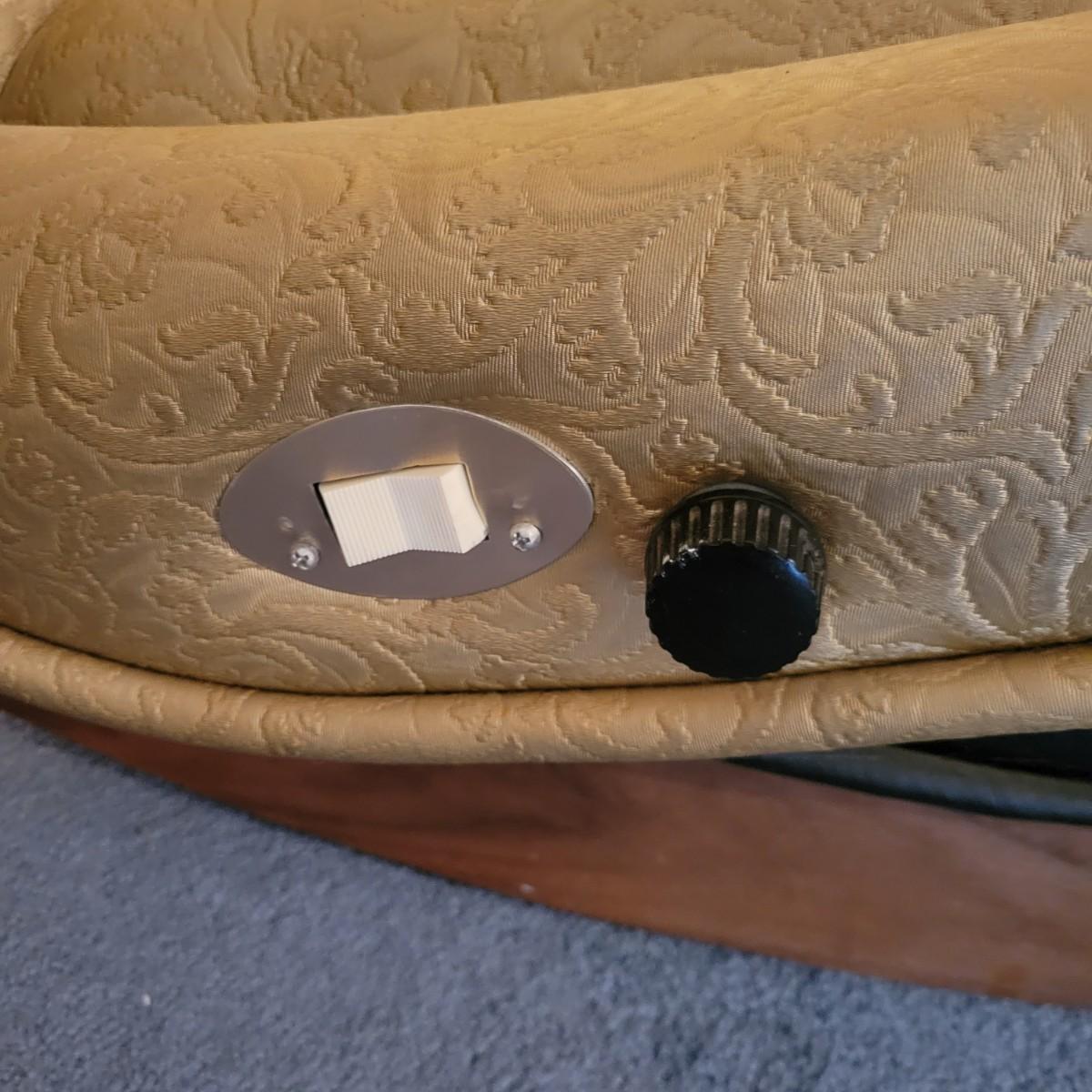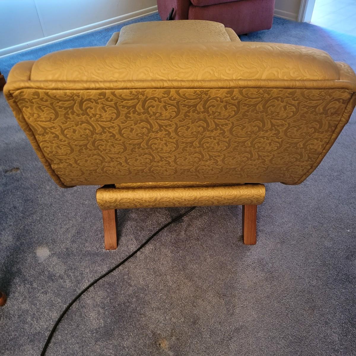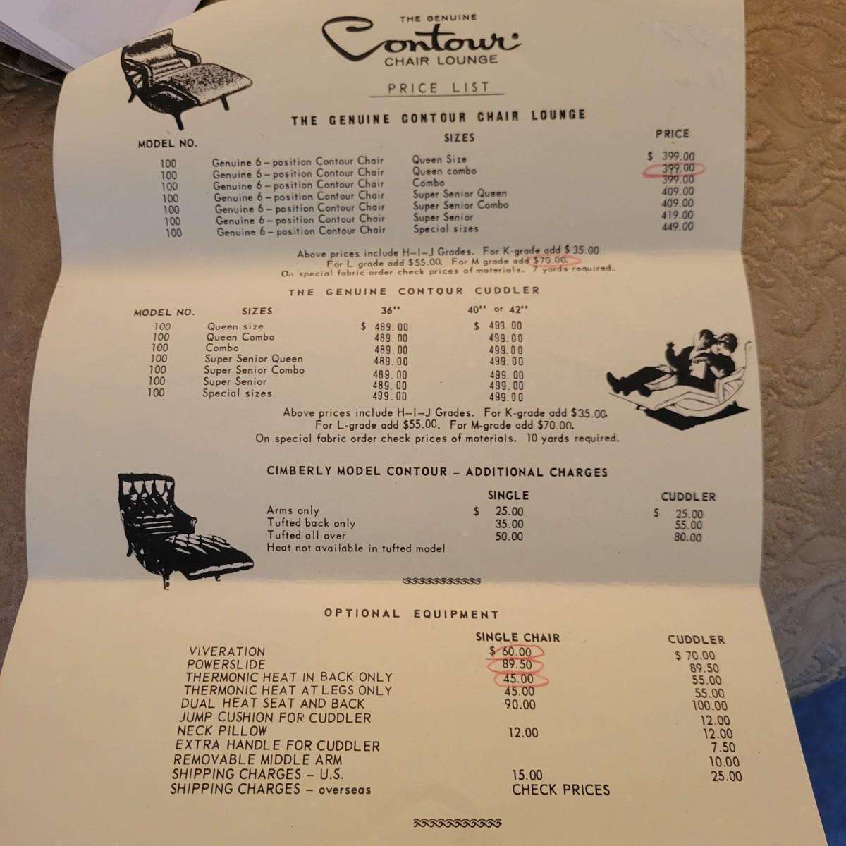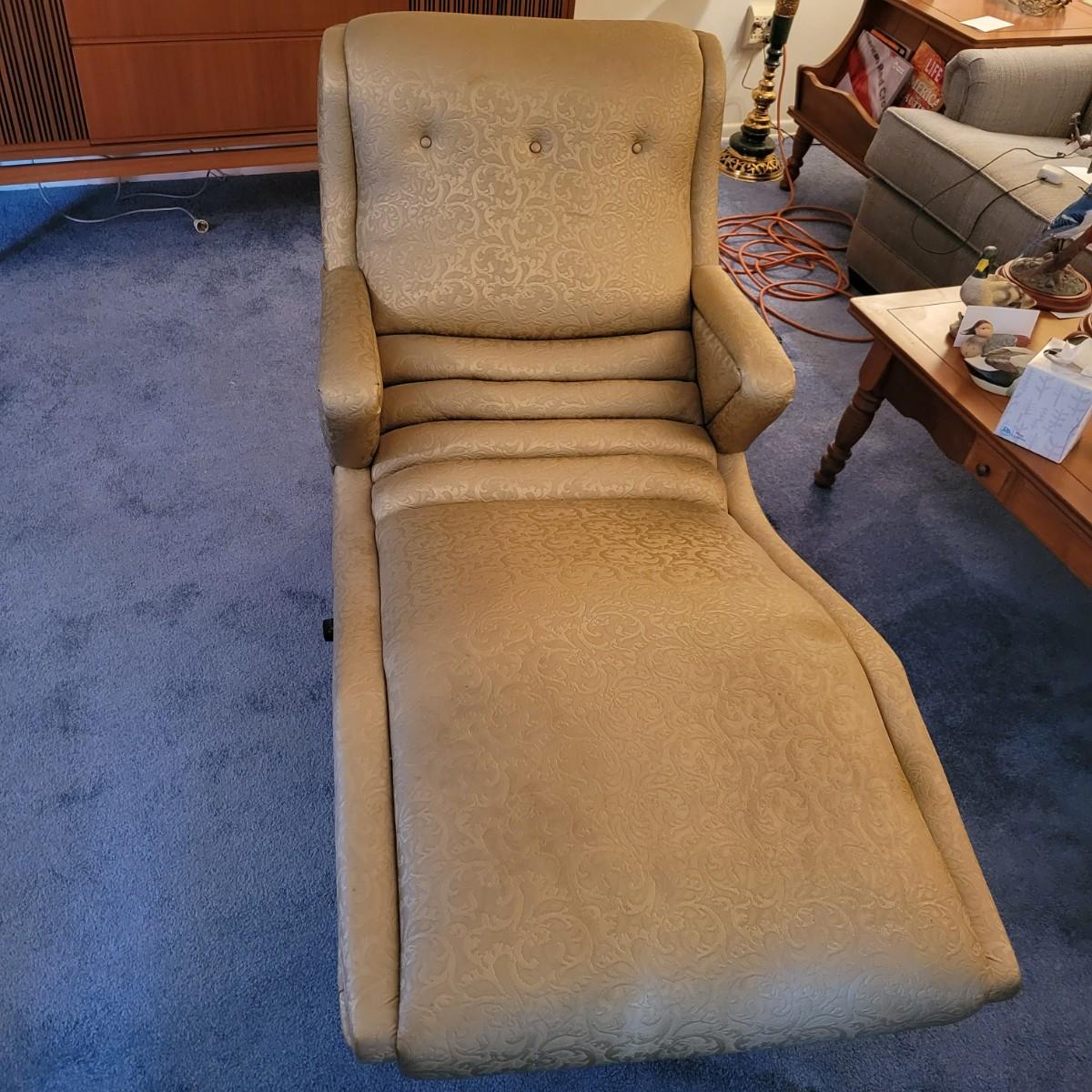 A vintage Contour Lounge Chair in the Danish Modern Style that has an embossed vinyl upholstery and powered on when plugged in. It pivots on its frame from an upright position to a position where the feet are higher than the head. It features powerslide, vibration and heated back. It measures approximately 27" x 55" x 31"H. There are some stains on the upholstery, see attached pictures for more detail. Local pickup only. Winning bidder must bring assistance to help move and load this item due to its weight and/or size.