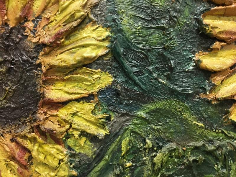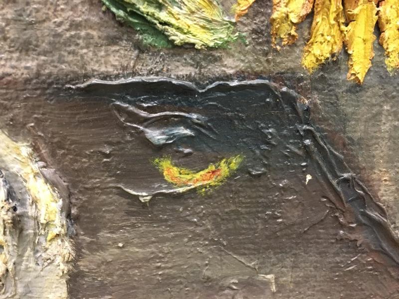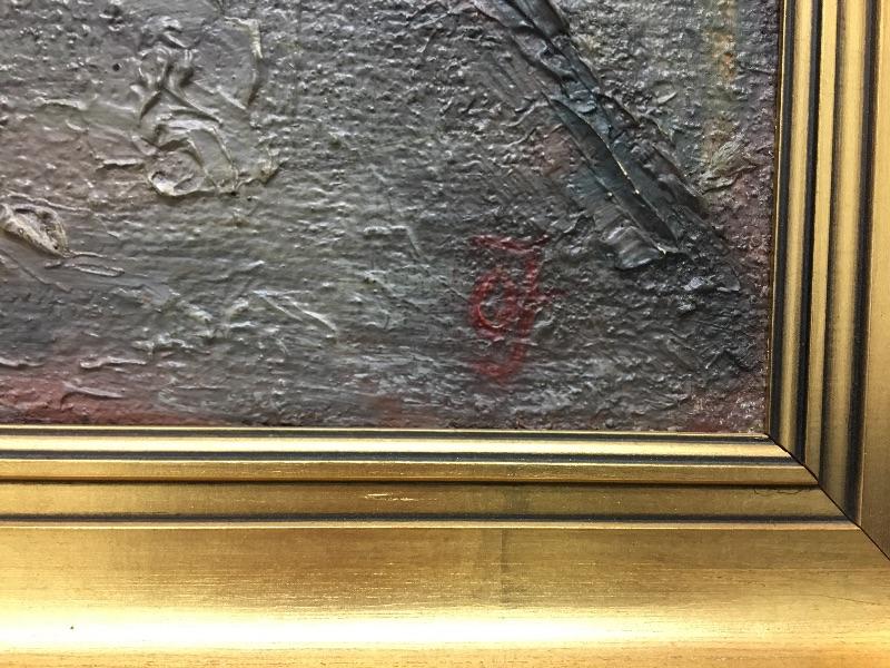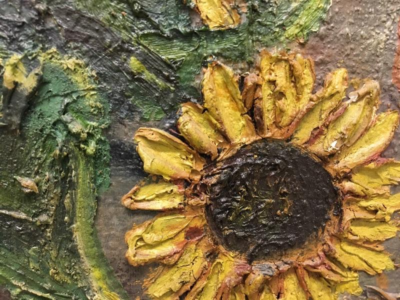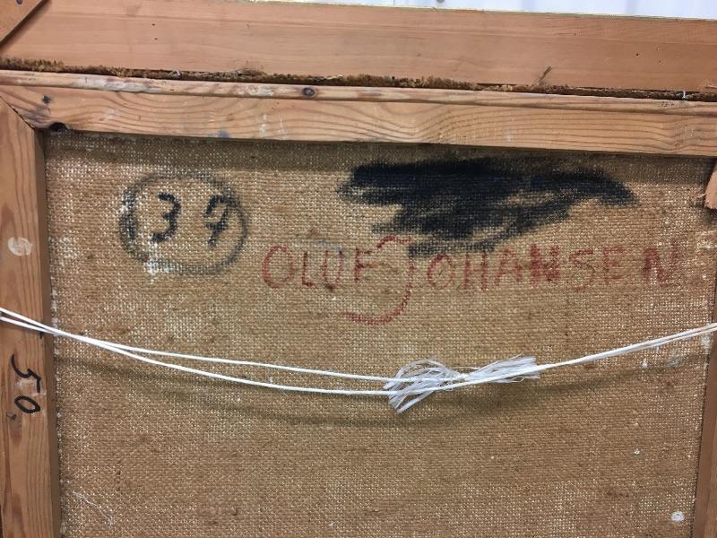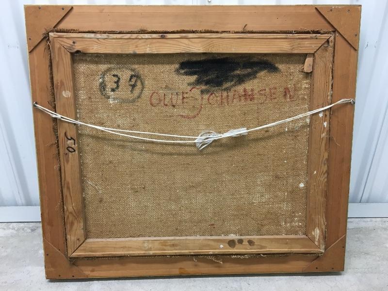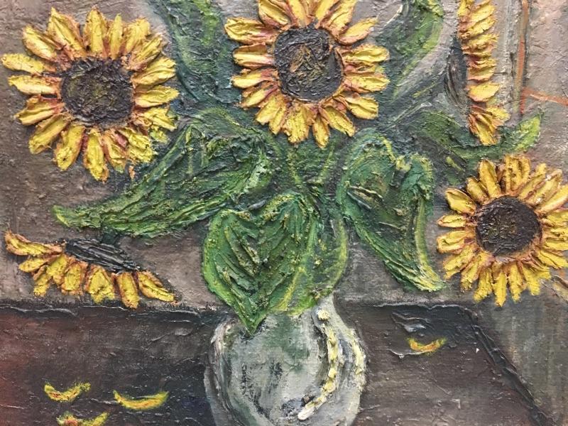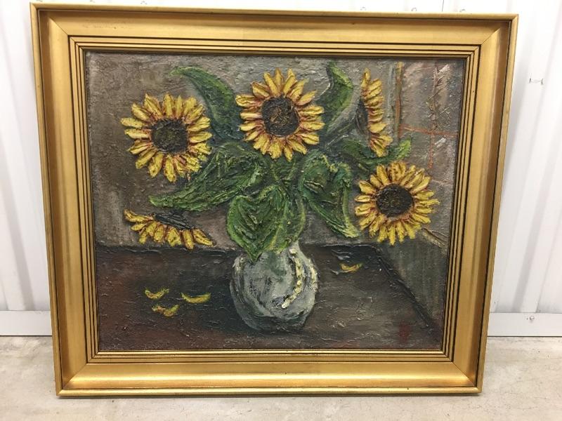 Oil on canvas still life with sunflowers. Heavy pastels and in original frame. Some minor loss to paint as shown in pictures. Signed with initials in lower right. Signed Johansen on the back. Measures 24”w by 22.5”h. Overall measurements with the frame are 28”w by 25”h. Delivery and shipping services available. Please contact us to request a quote.