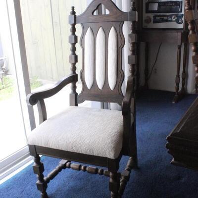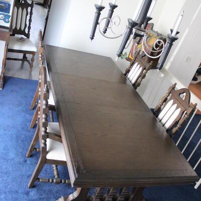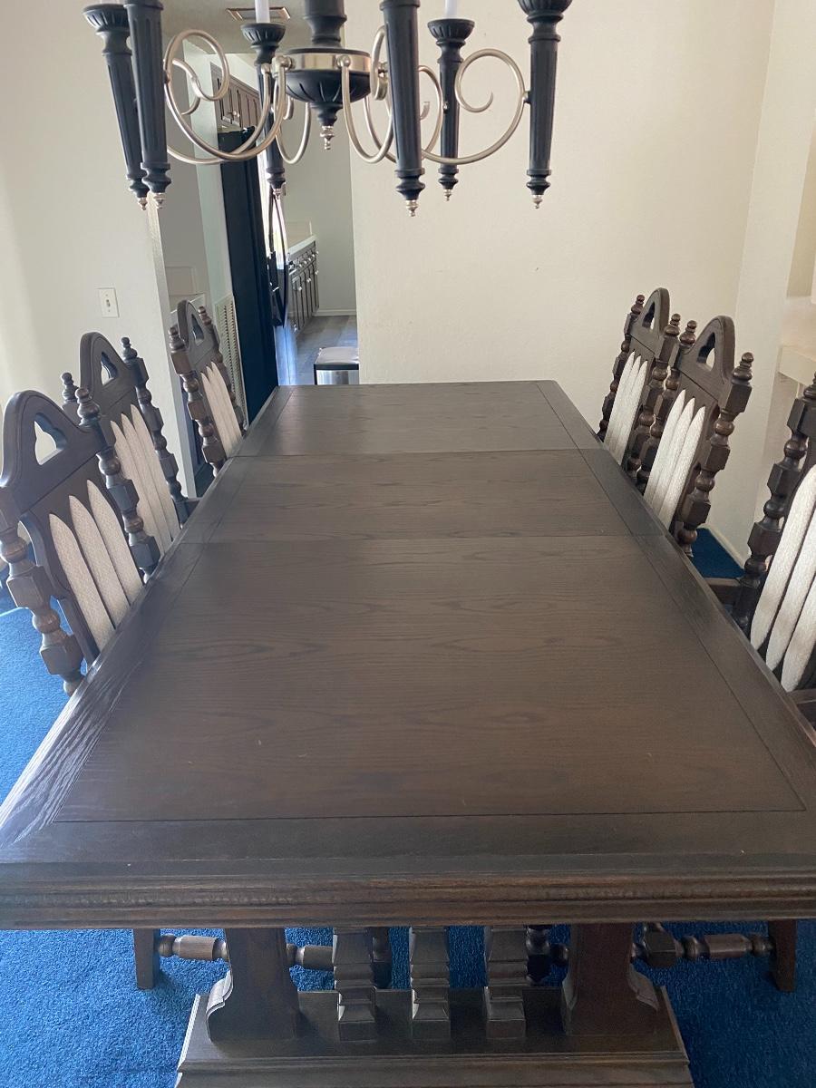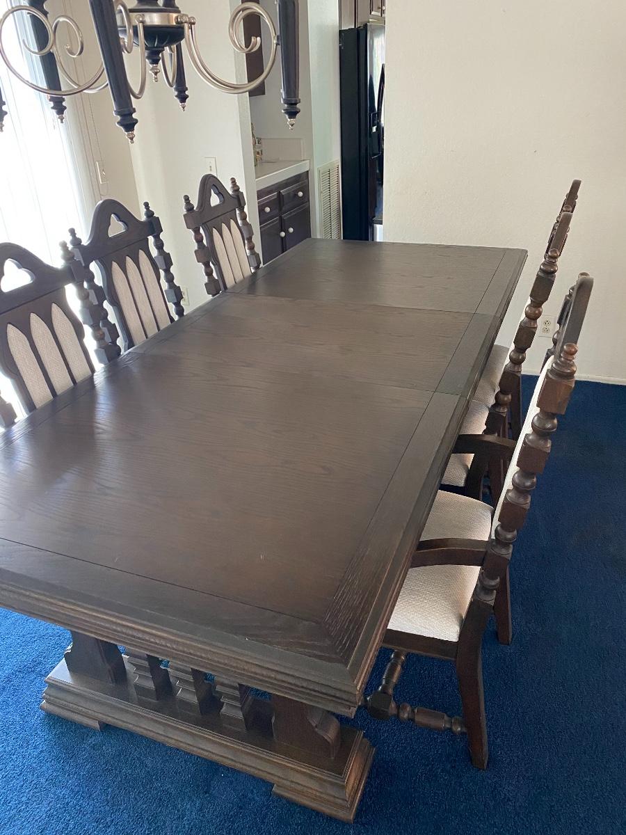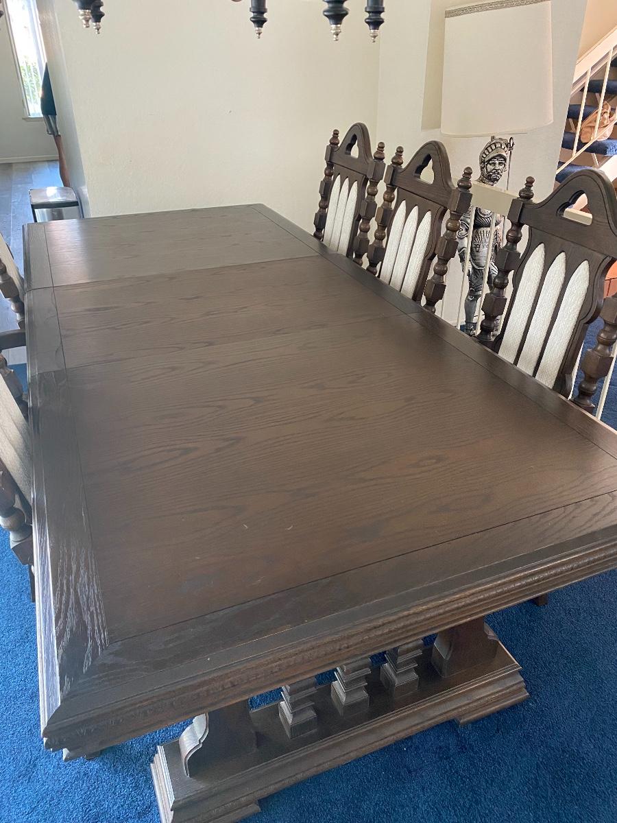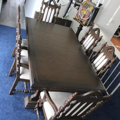 Vintage dining room table and chairs set. Dark finish Spanish style from the 1960s. White fabric backs and seats. Comes with 6 chairs total, 4 side and 2 arm chairs. Does have one leaf extension. In good condition.