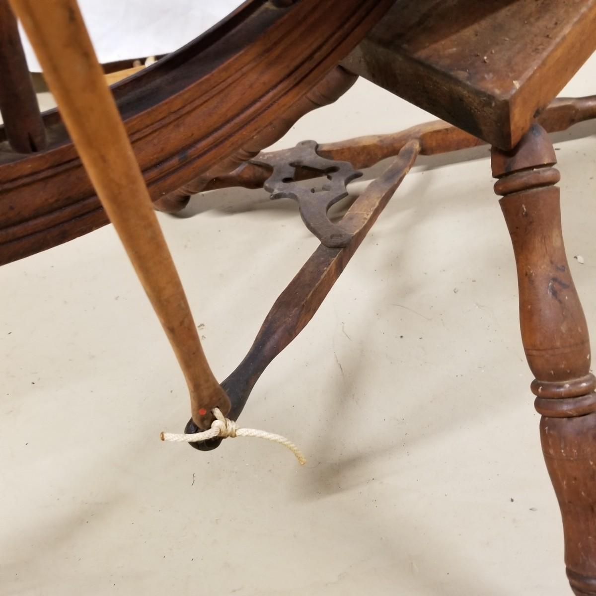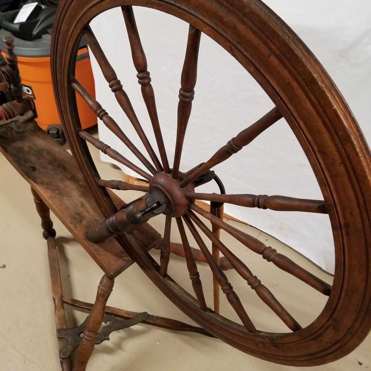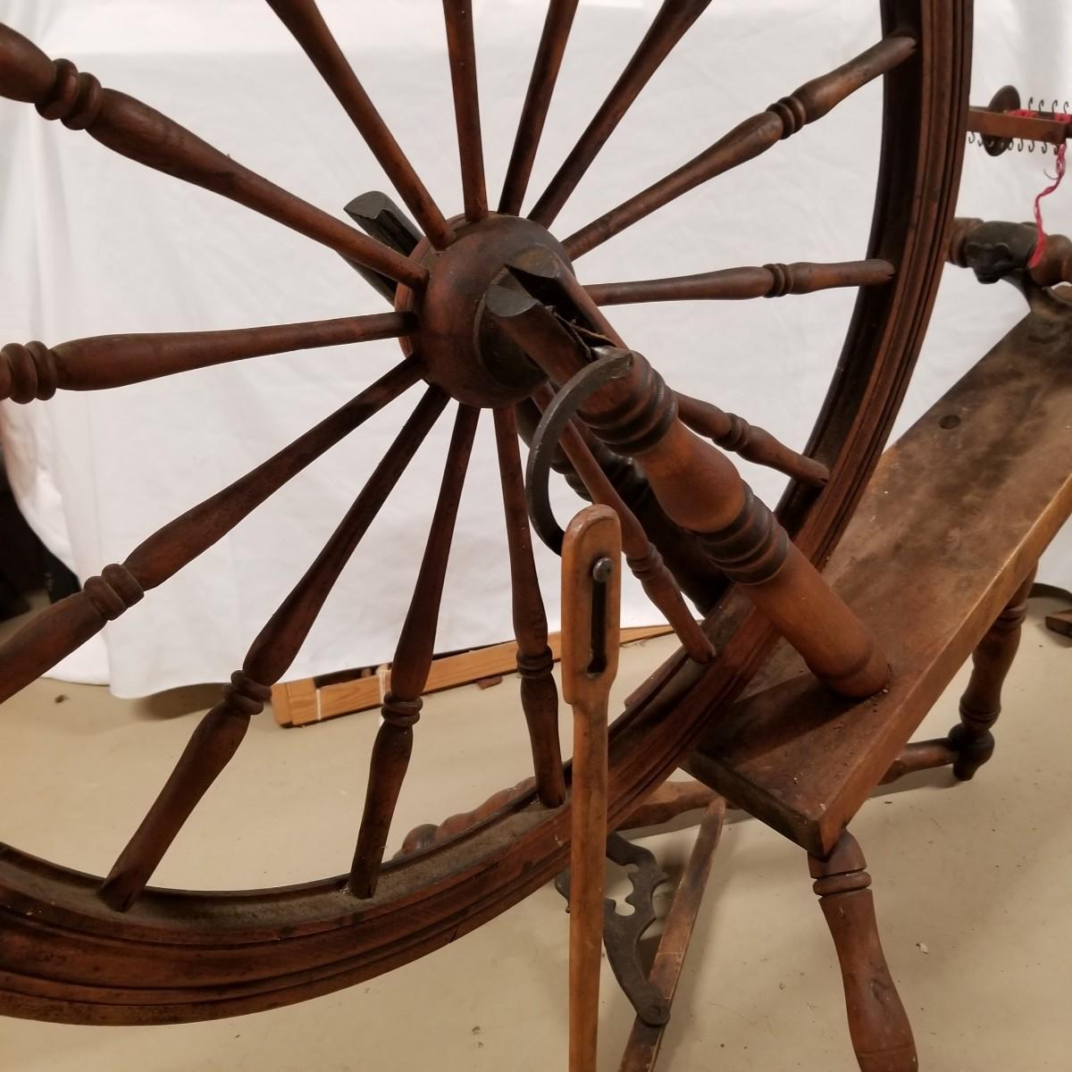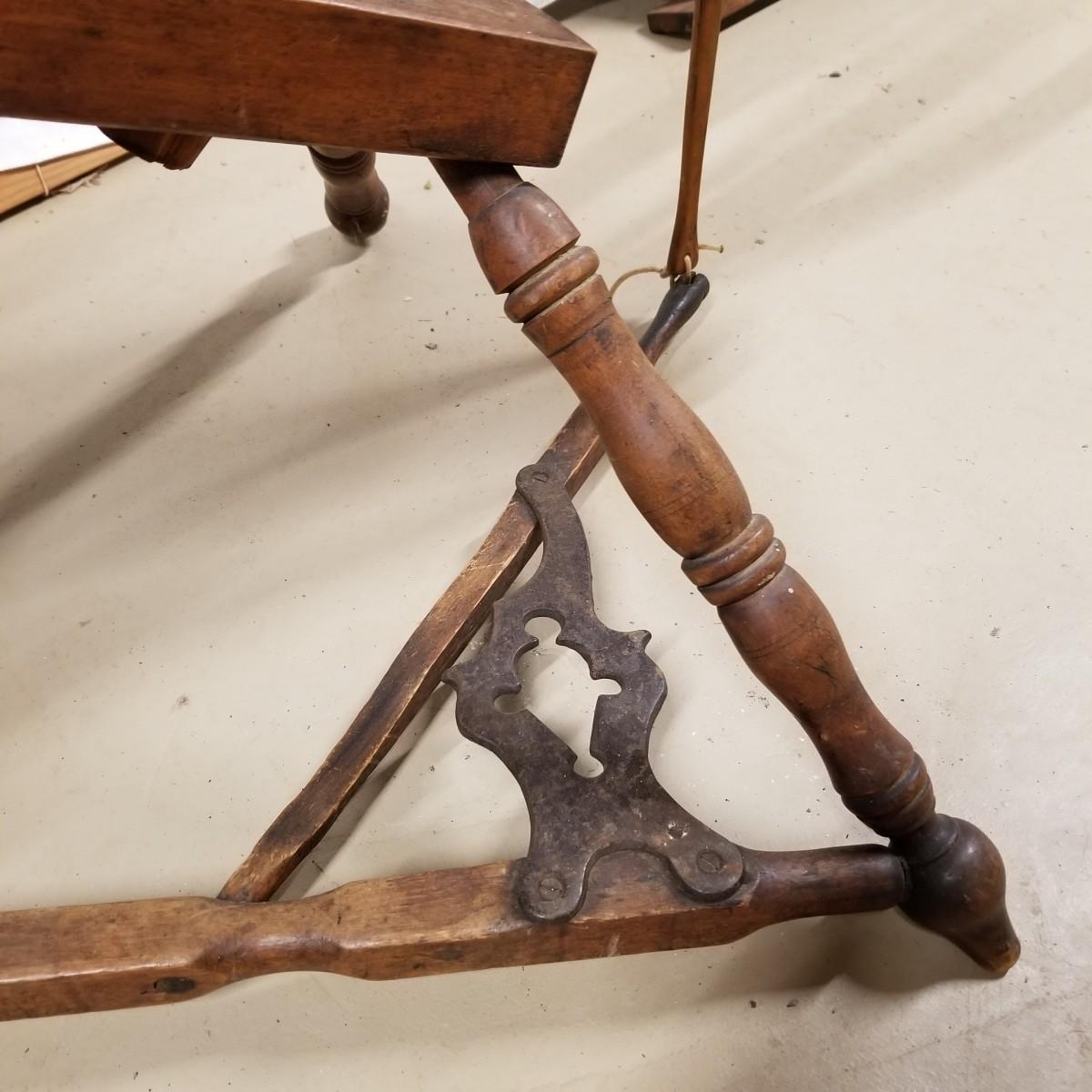 Fine crafted treadle style spinning wheel. Turned spokes, legs and supports. Adjustable head is held with forged iron bracket. Double grooved main wheel is 30" d. Item measures 48" x 27"x 42". No drive bands. Local pickup only.