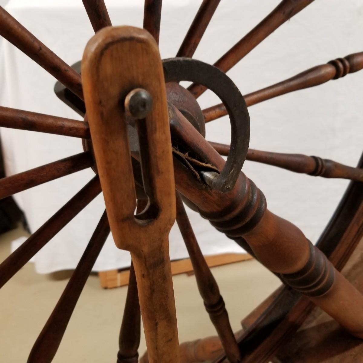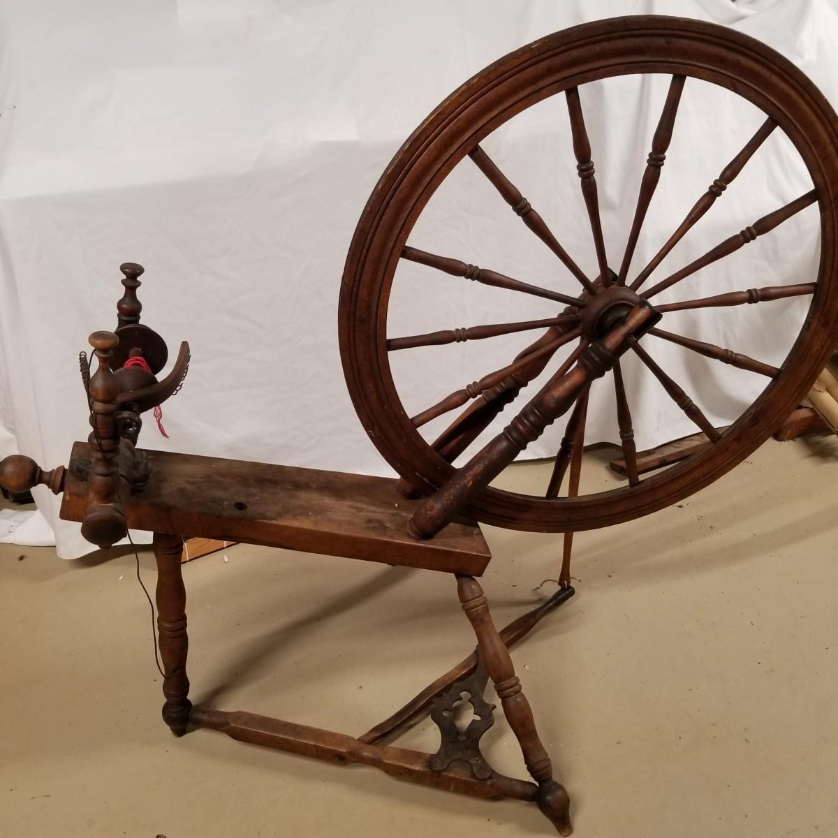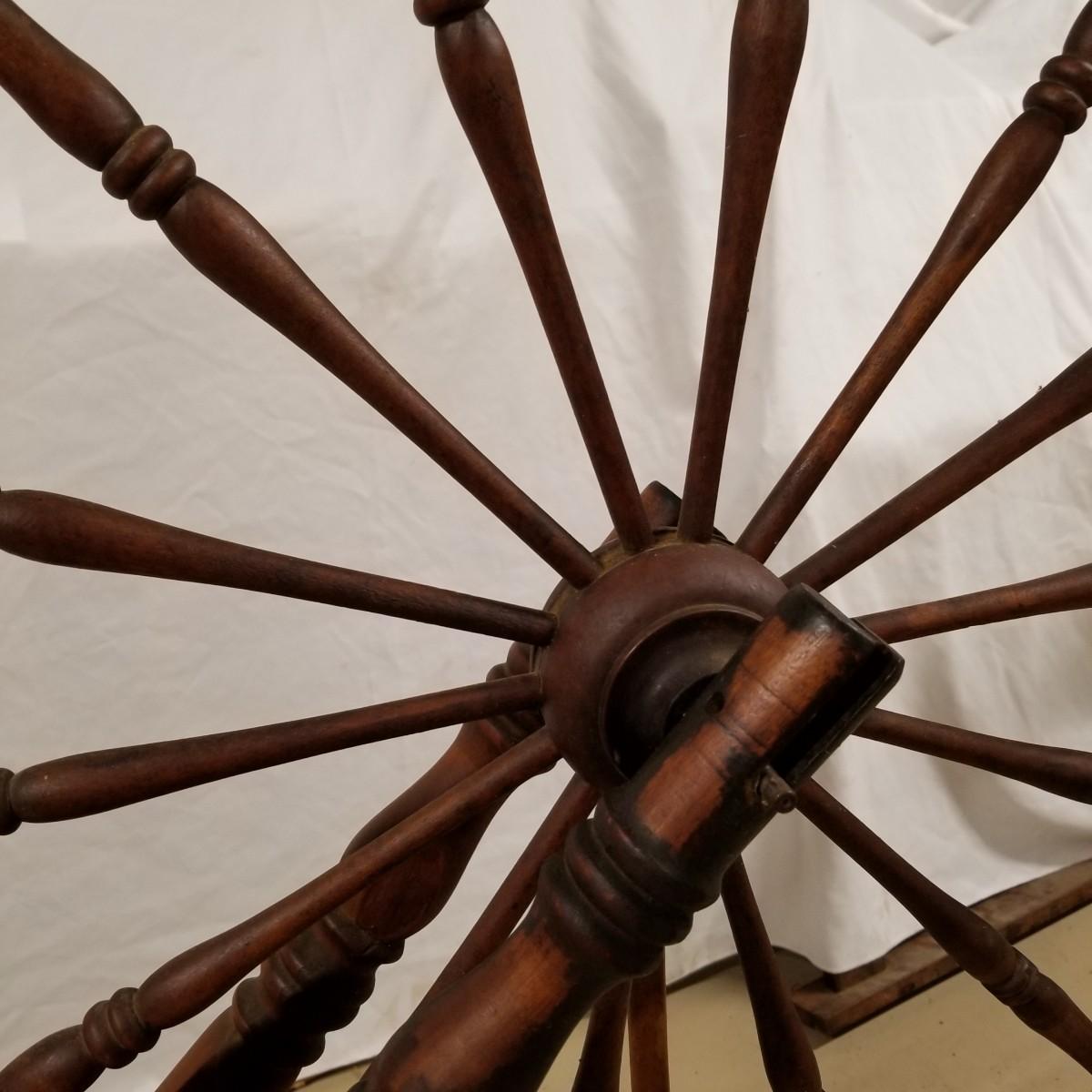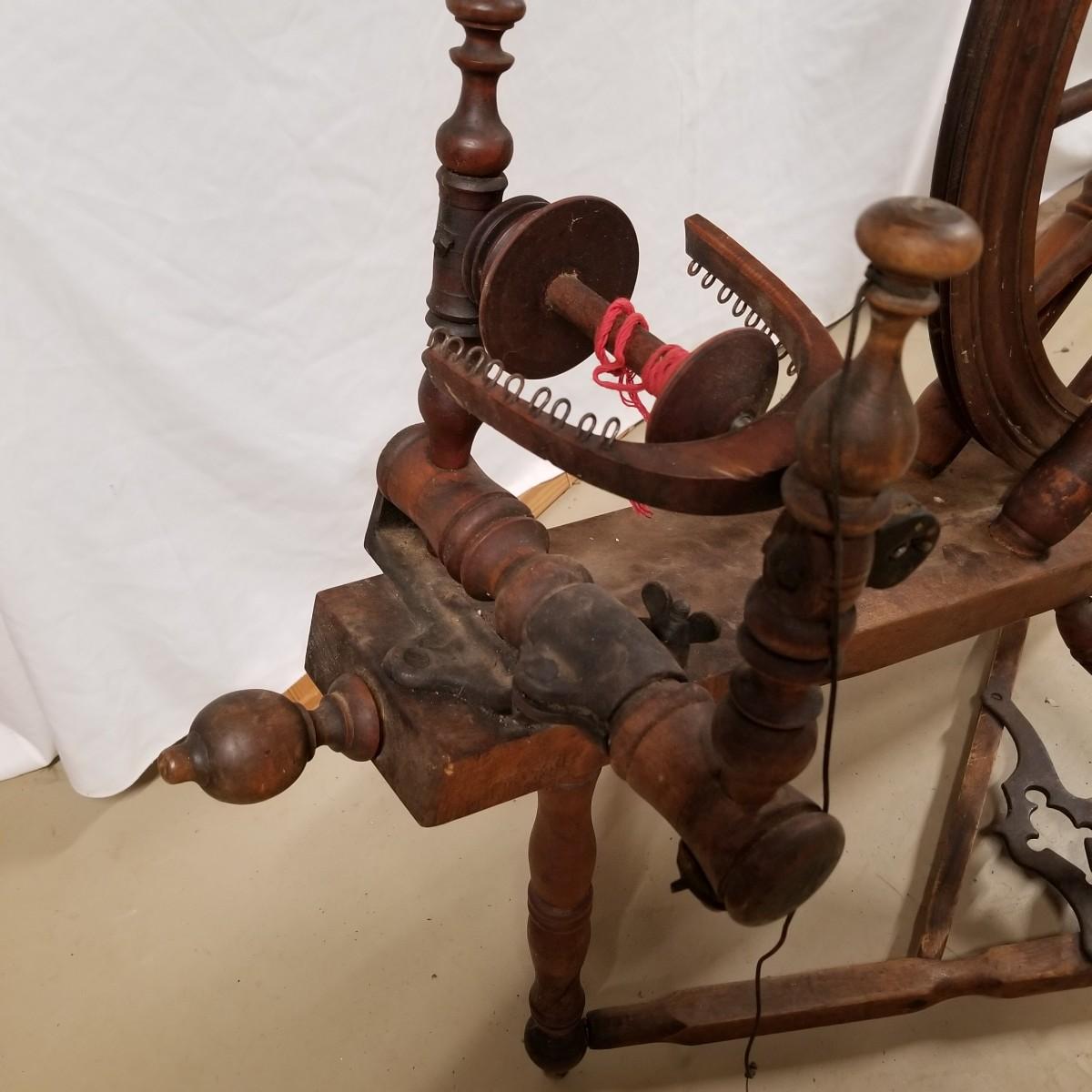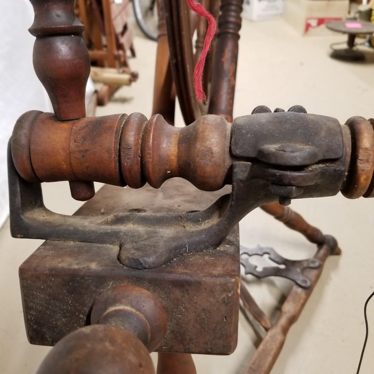 Fine crafted treadle style spinning wheel. Turned spokes, legs and supports. Adjustable head is held with forged iron bracket. Double grooved main wheel is 30" d. Item measures 48" x 27"x 42". No drive bands. Local pickup only.