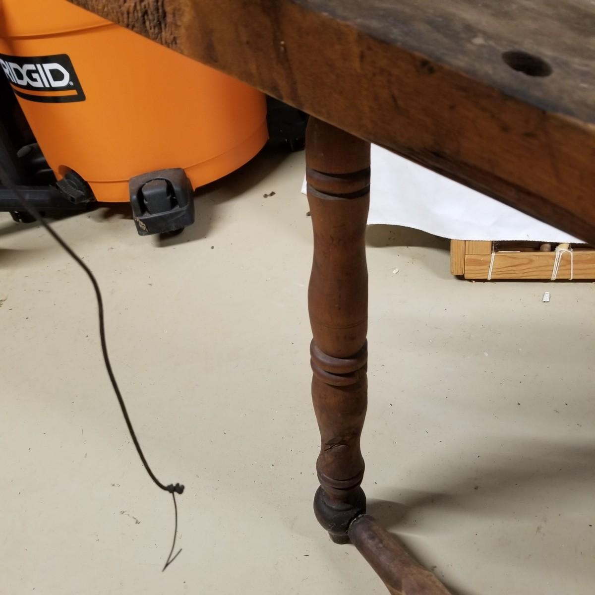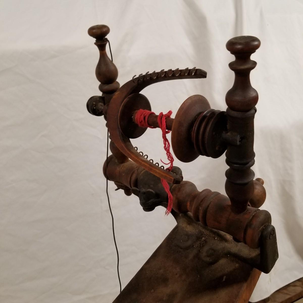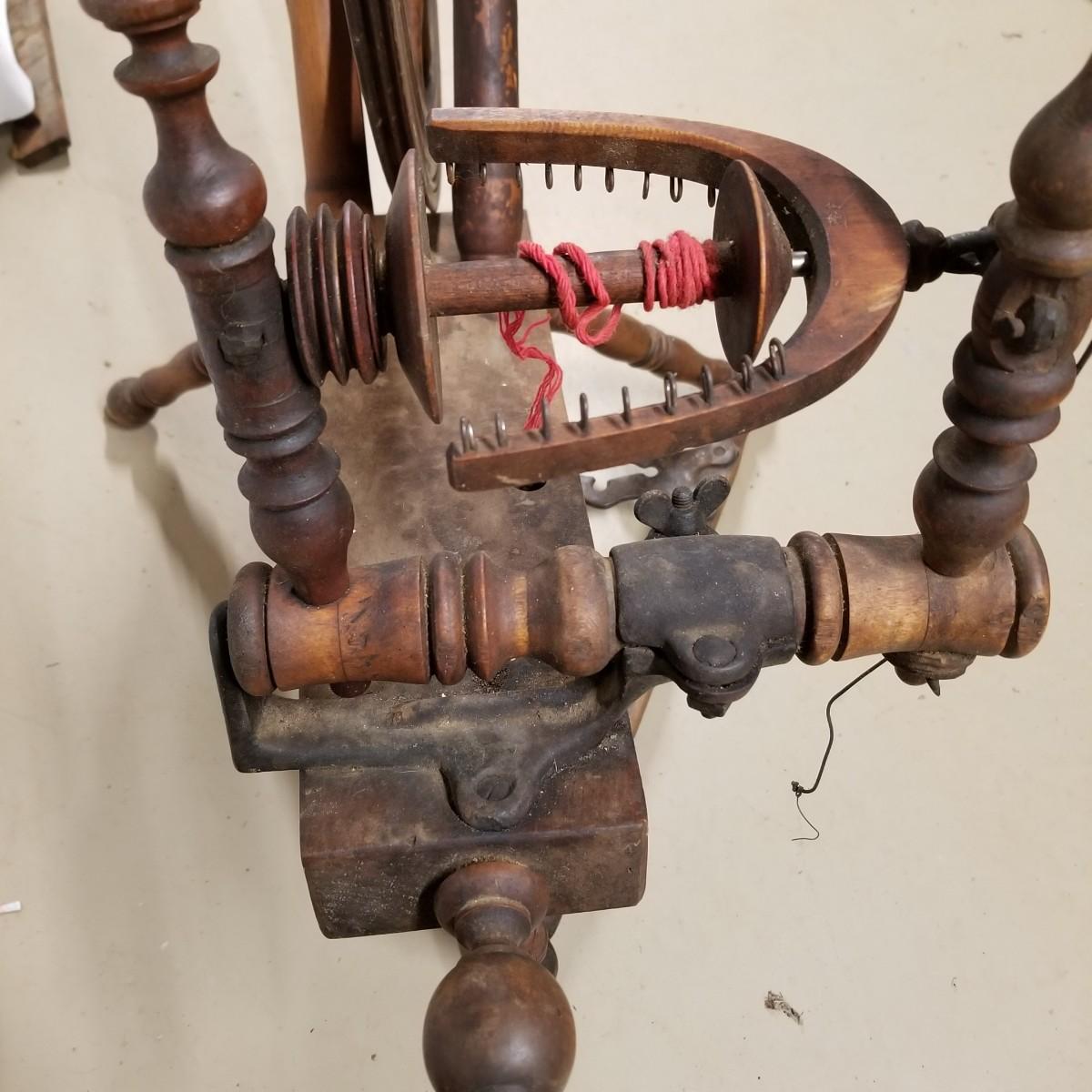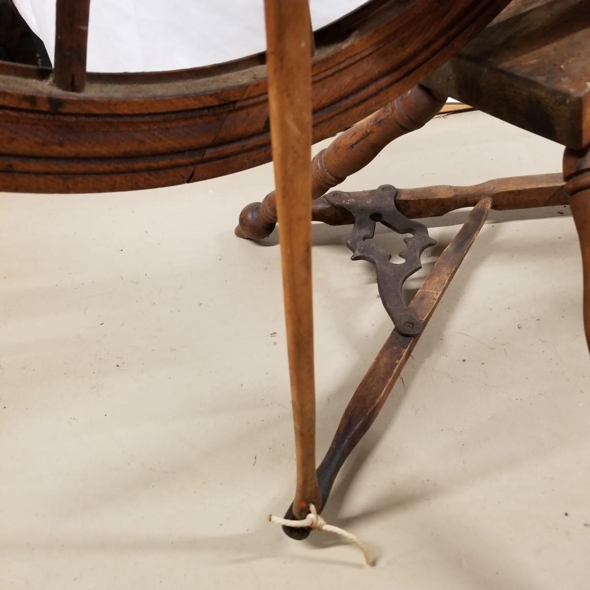Fine crafted treadle style spinning wheel. Turned spokes, legs and supports. Adjustable head is held with forged iron bracket. Double grooved main wheel is 30" d. Item measures 48" x 27"x 42". No drive bands. Local pickup only.