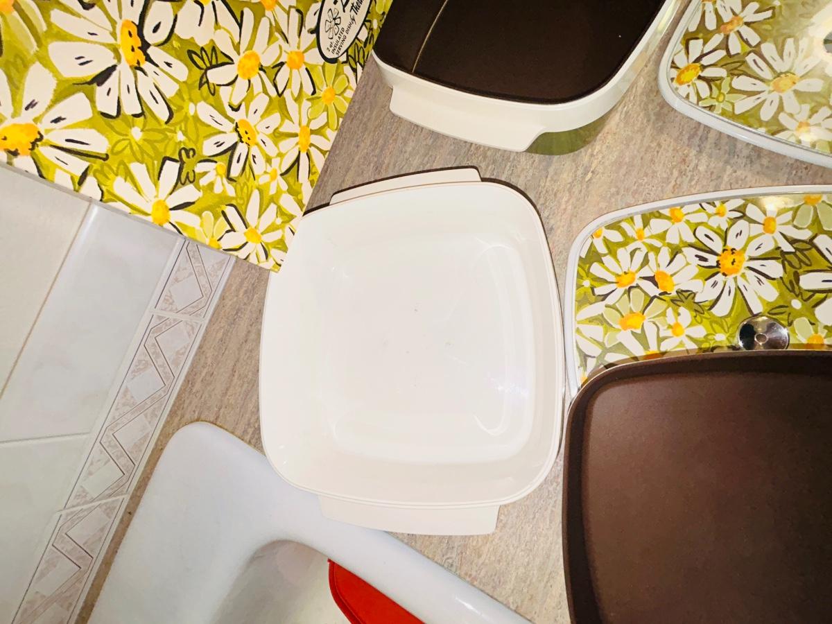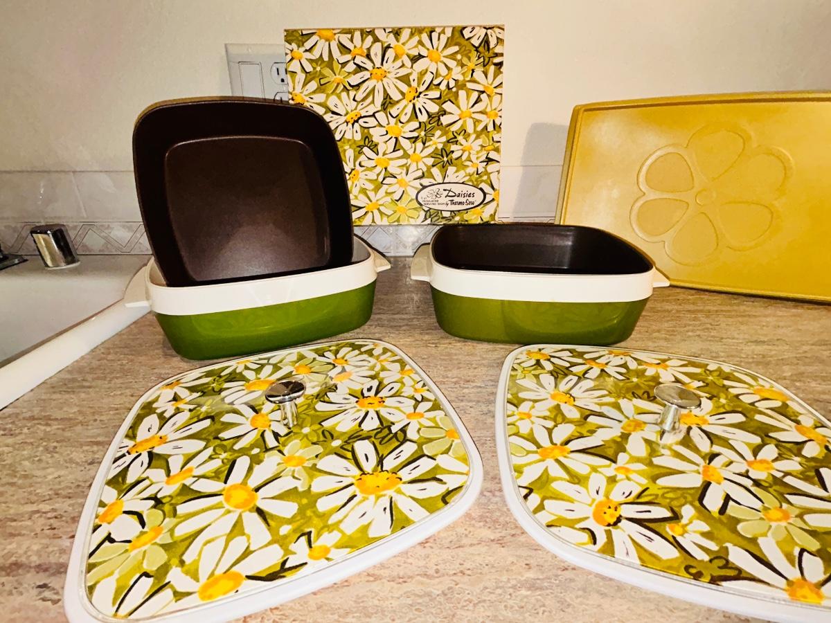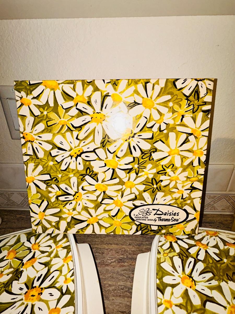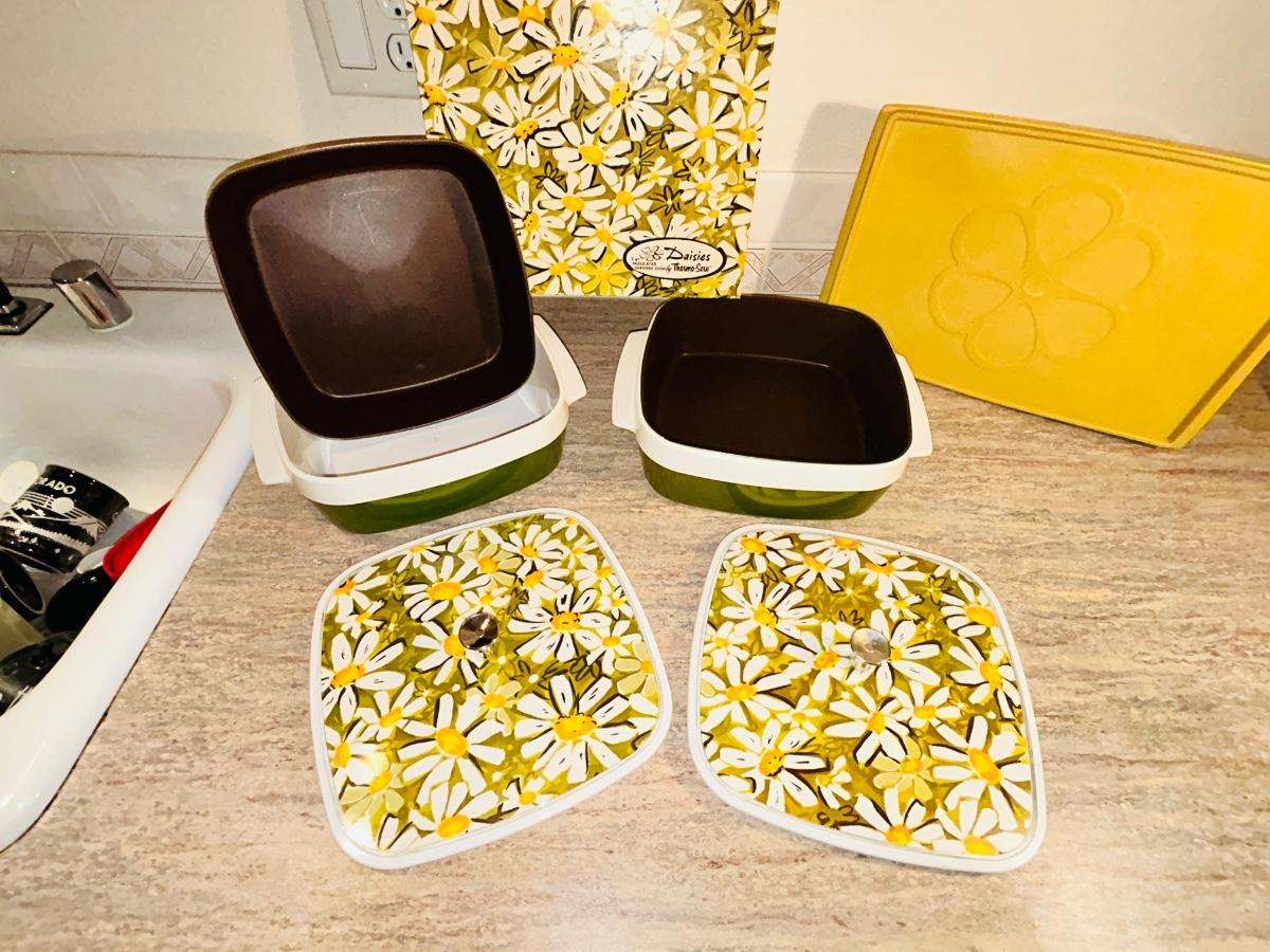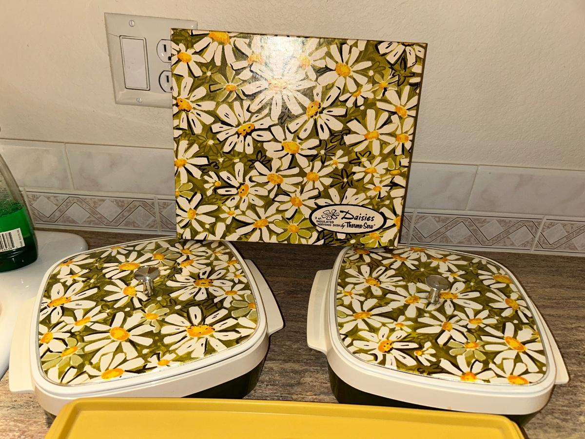 VINTAGE DASIES BY THERMO-SERVE 2qt INSULATED SERVING DISHES AND RUBBERMAID CONTAINER
