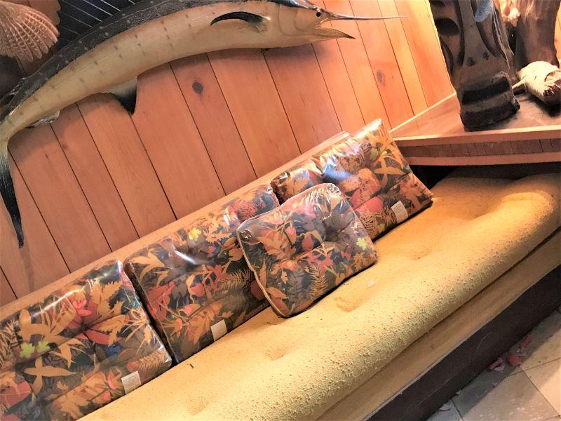 The pillows are still covered in plastic! Seats are a little "nubby" but are comfortable. Comes with corner table. I do not see a brand name.