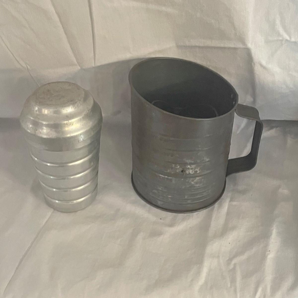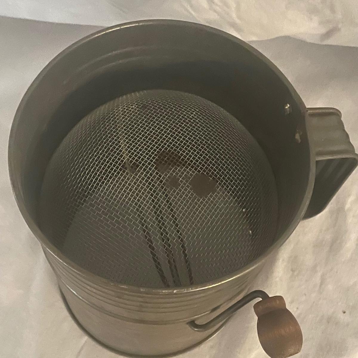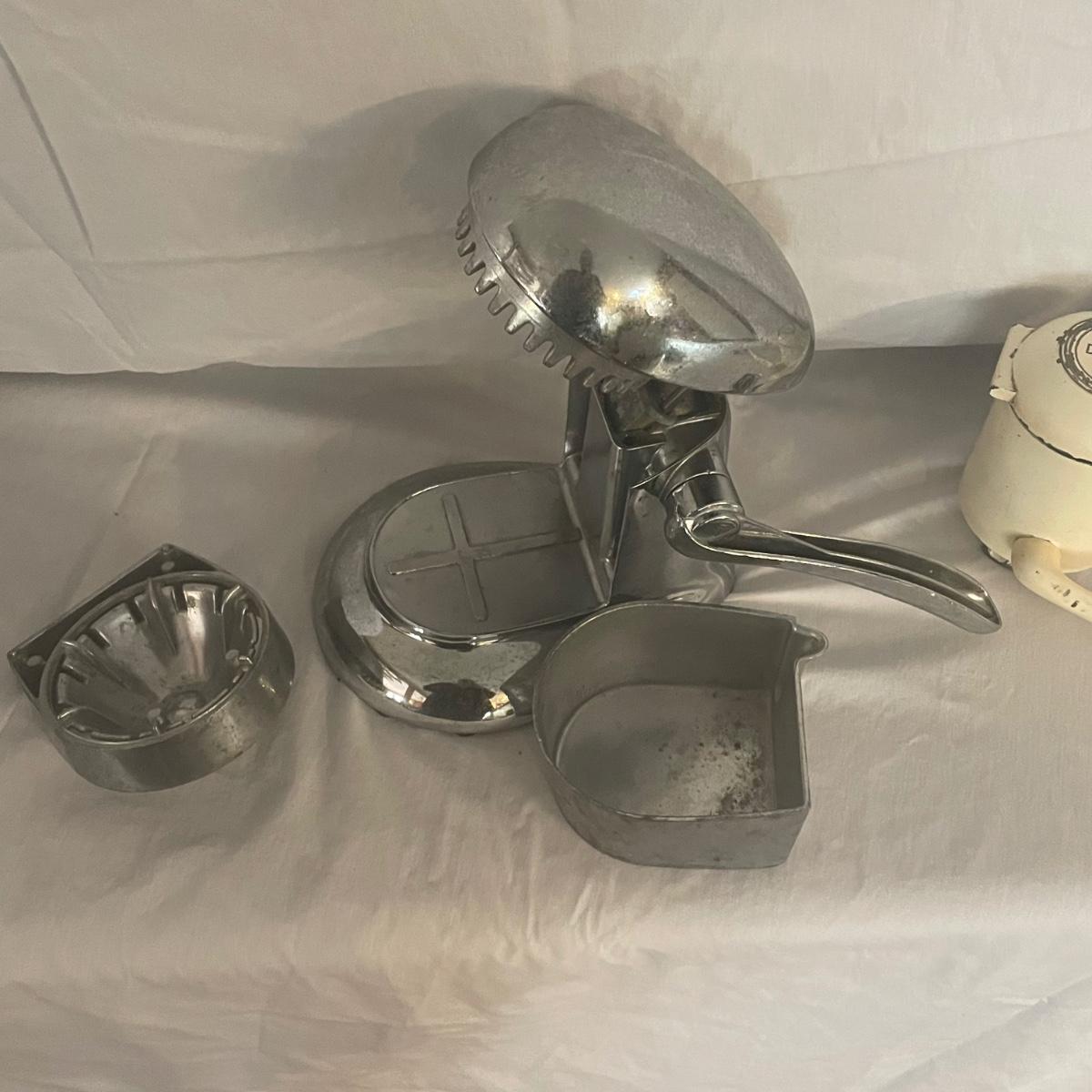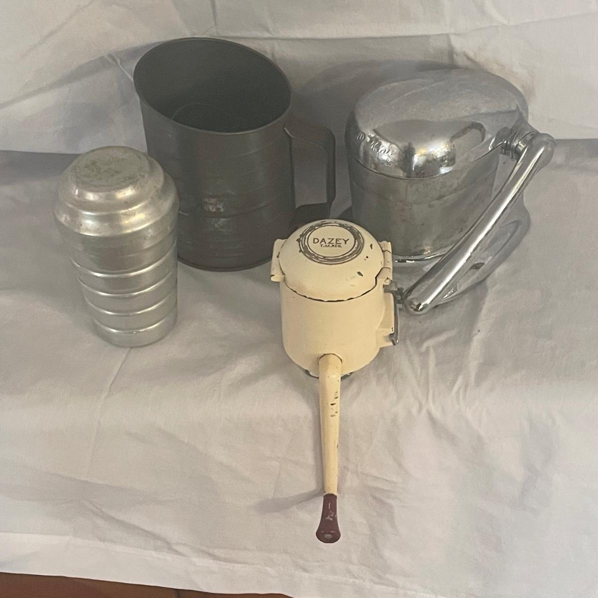 These four vintage items include a Dazey ice crusher, Juice O Mat, flour sieve, and a metal canister.