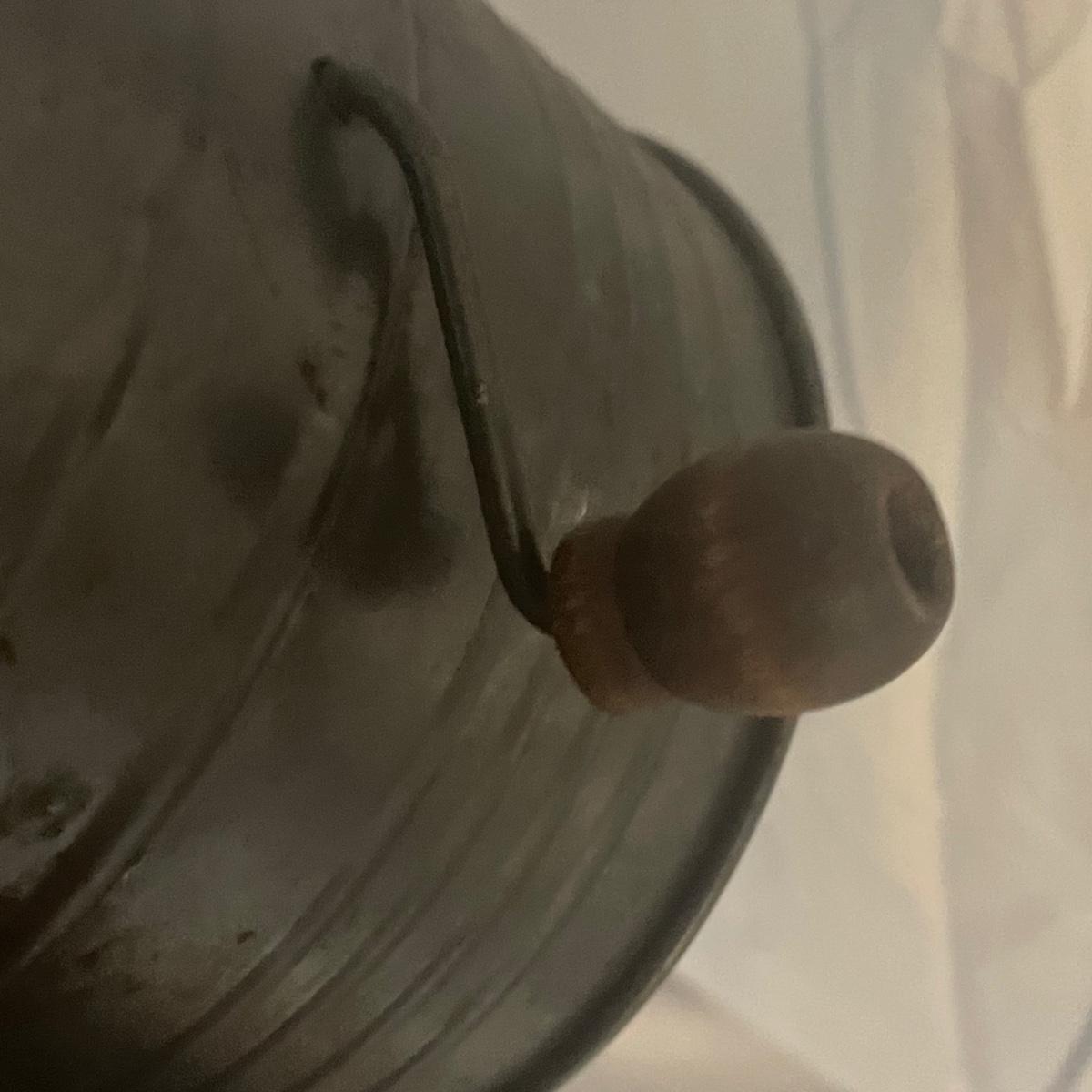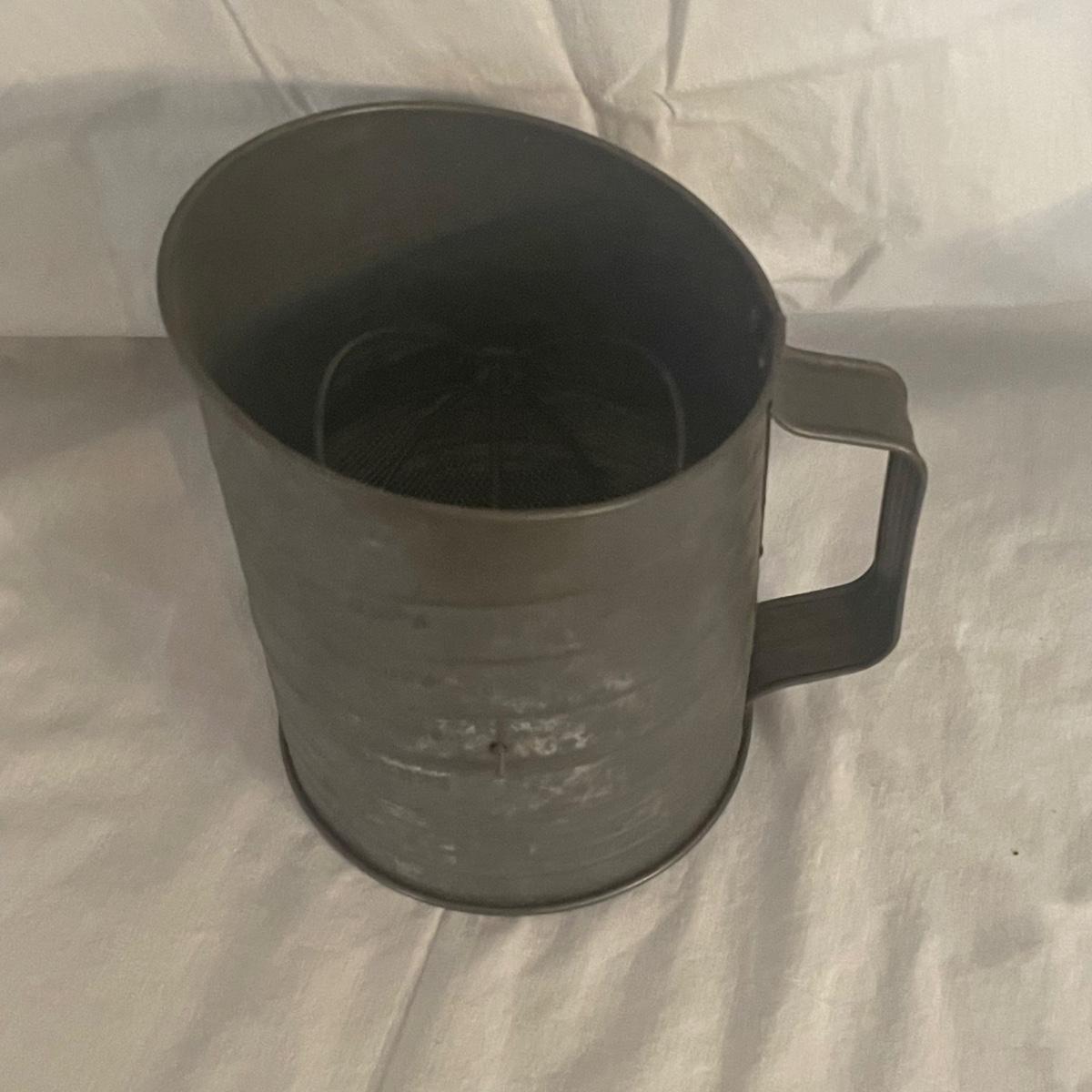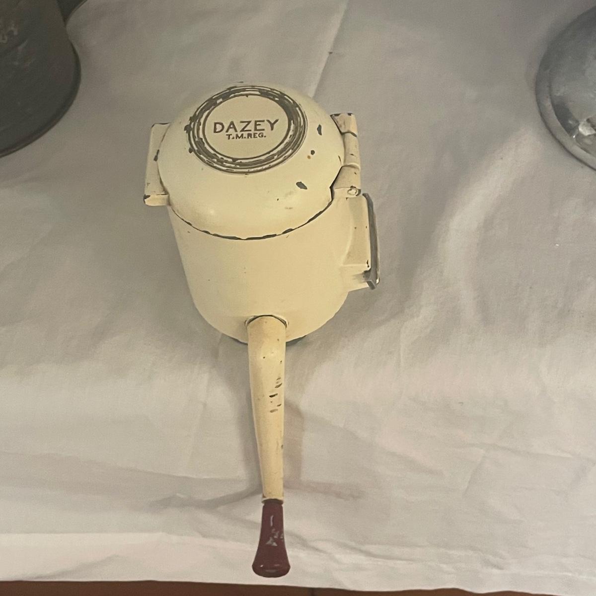 These four vintage items include a Dazey ice crusher, Juice O Mat, flour sieve, and a metal canister.