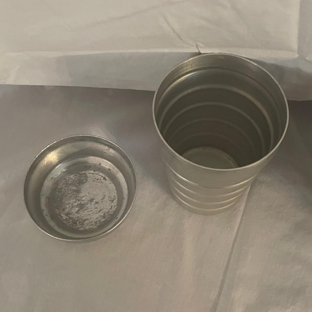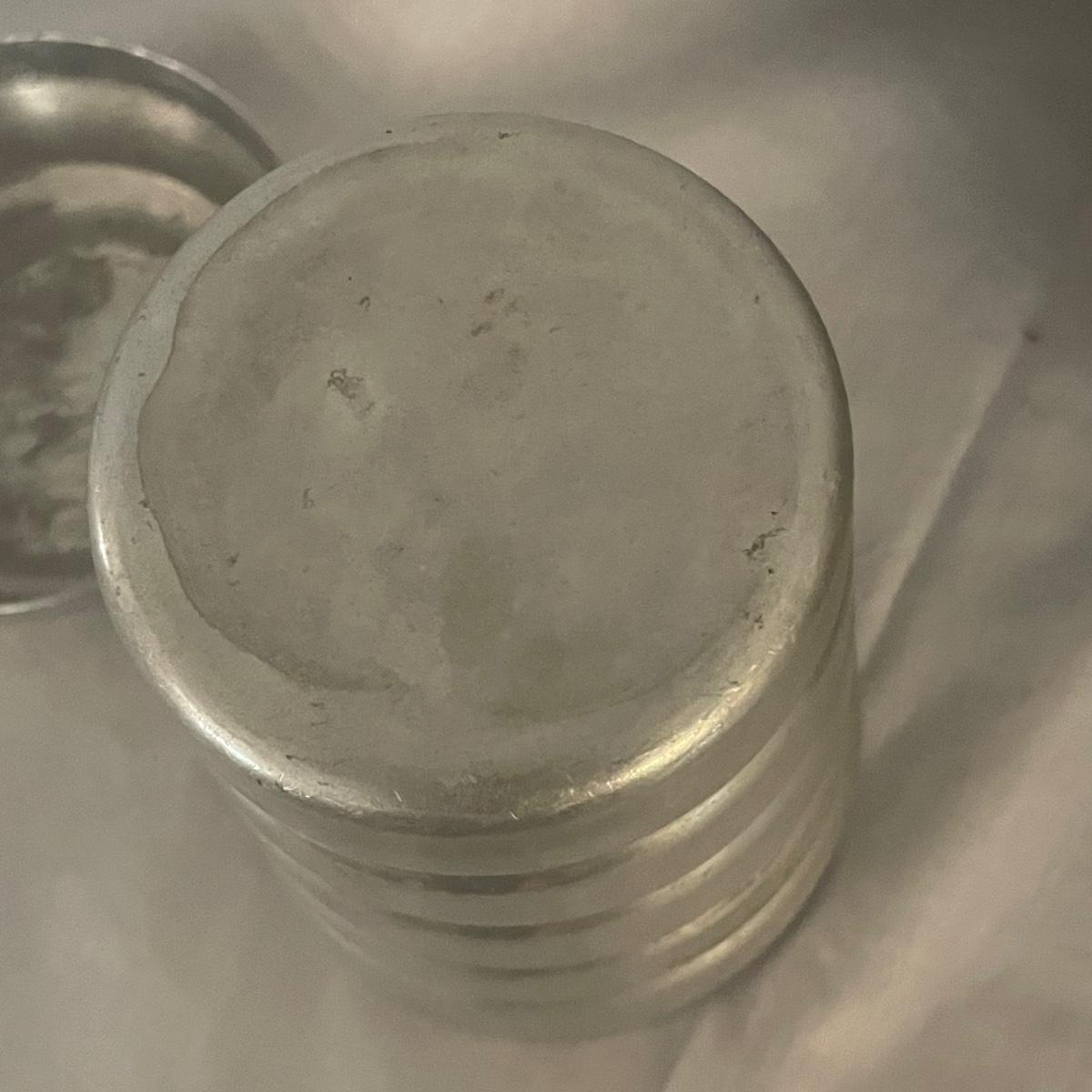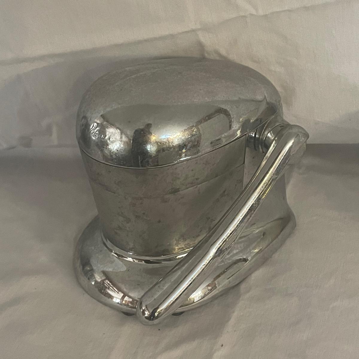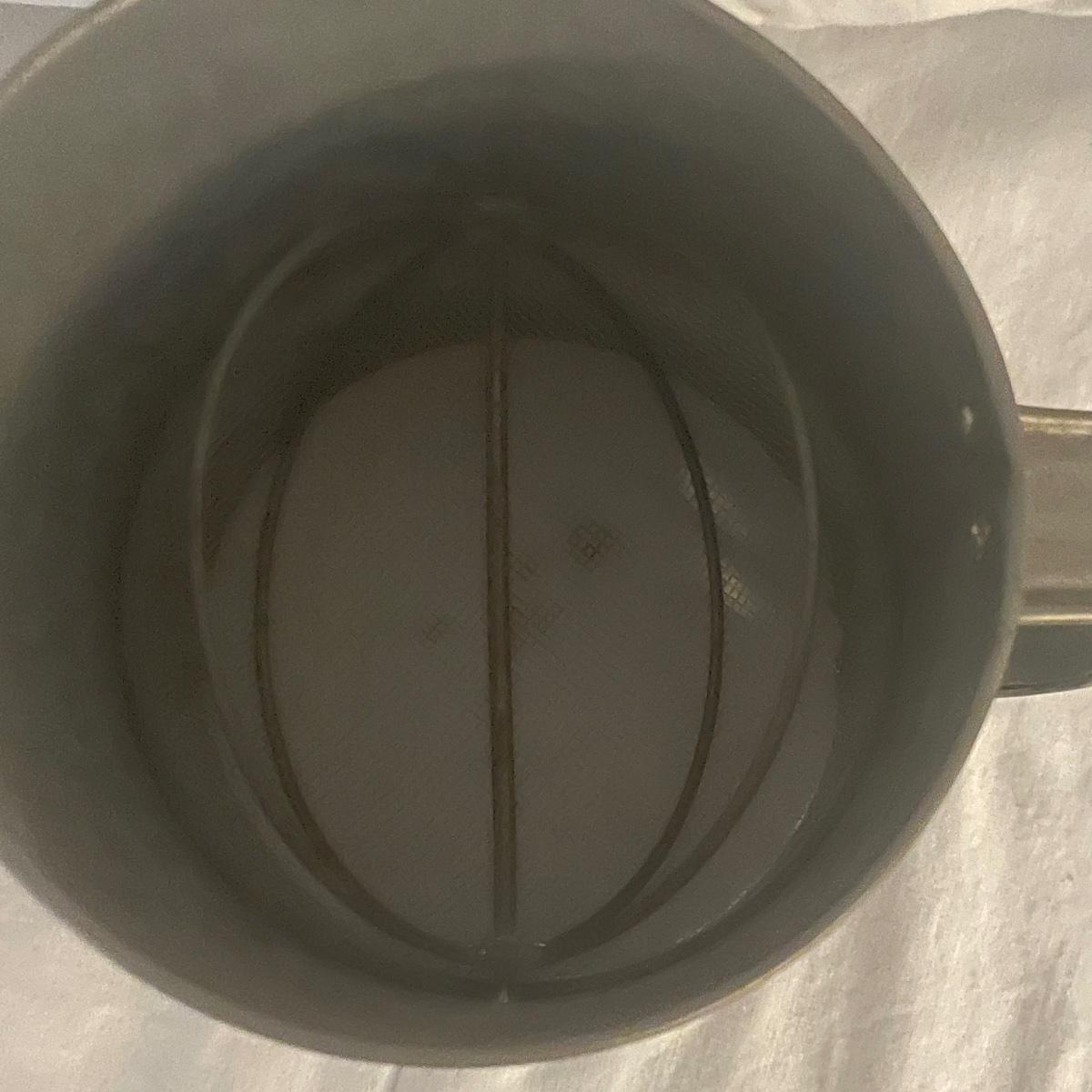 These four vintage items include a Dazey ice crusher, Juice O Mat, flour sieve, and a metal canister.