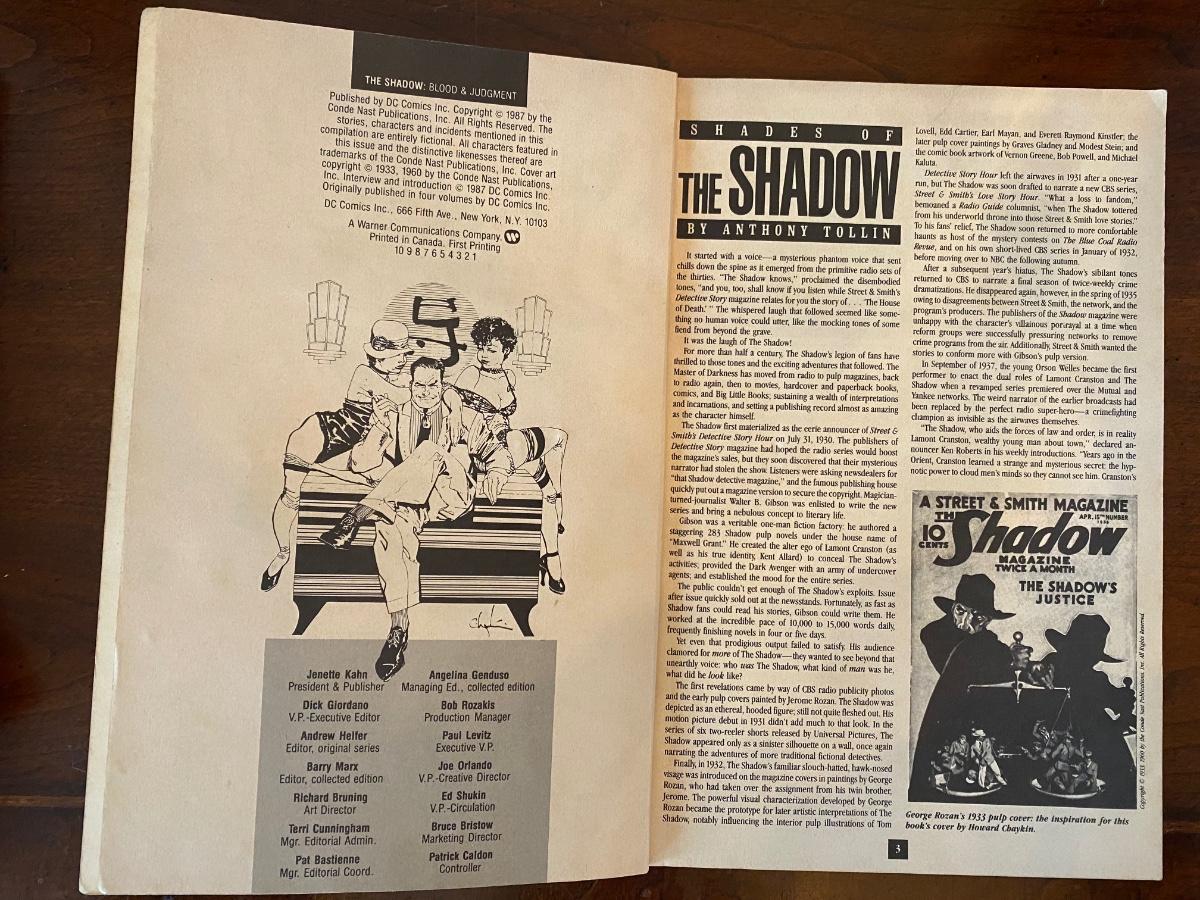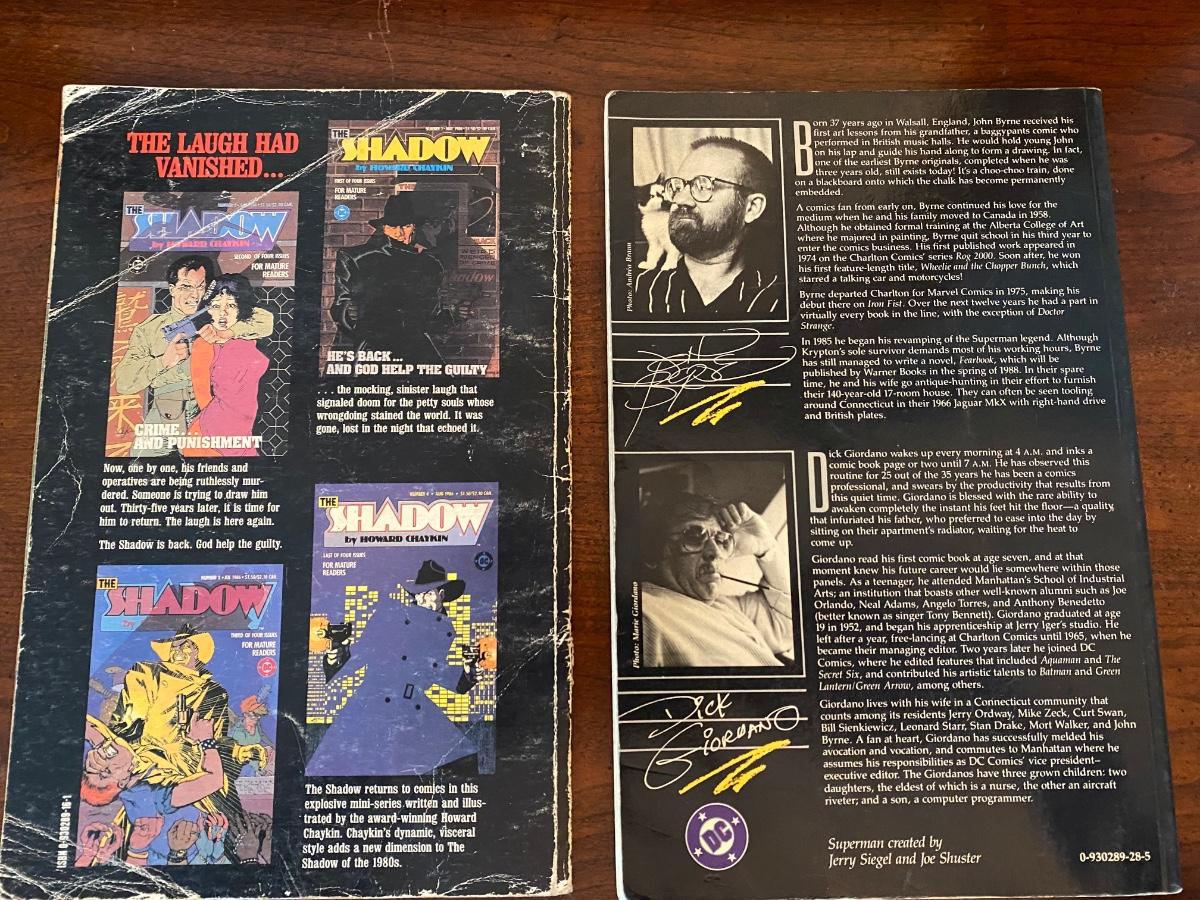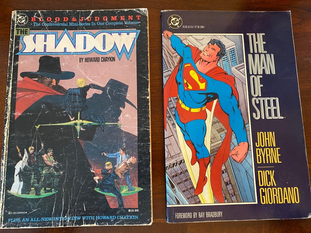 Vintage DC Comic Book Lot: “The Shadow” by Howard Chaykin, The Controversial Mini-Series in One Complete Volume, cr 1987. Some damage to cover; and “The Man of Steel” by John Byrne & Dick Giordano, cr 1987, in good condition
