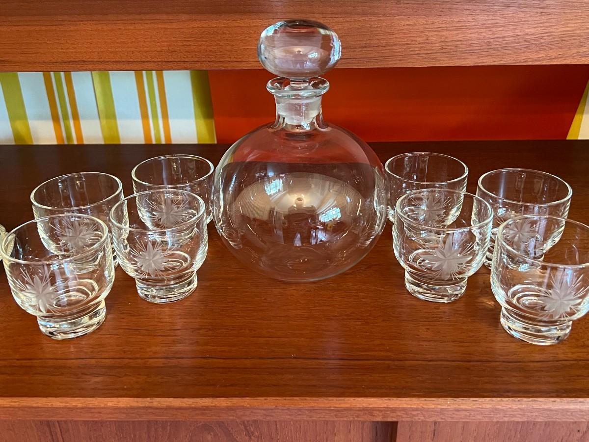 Vintage Decanter and Etched Whiskey Glasses- 9 piece set