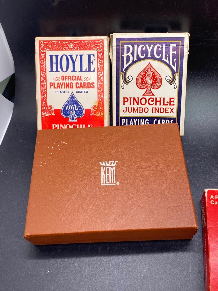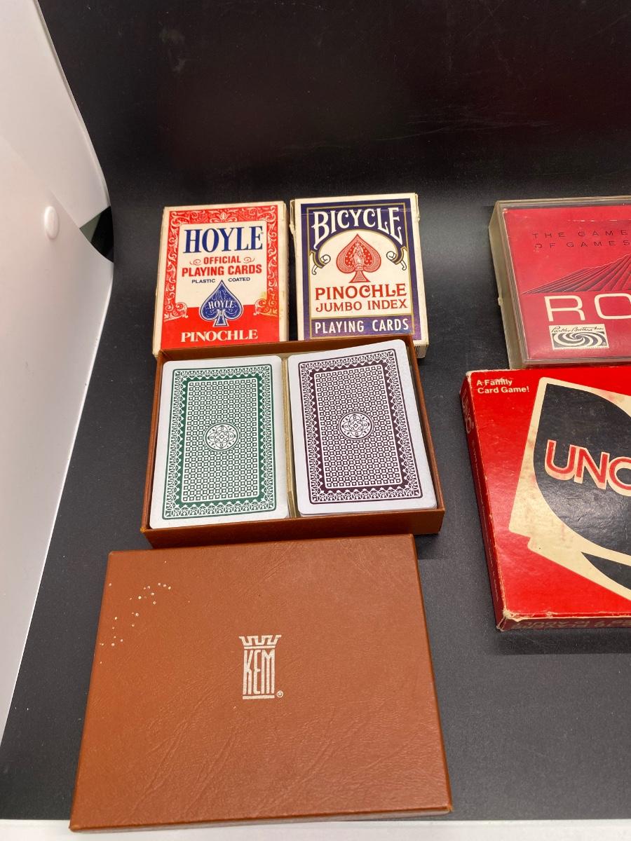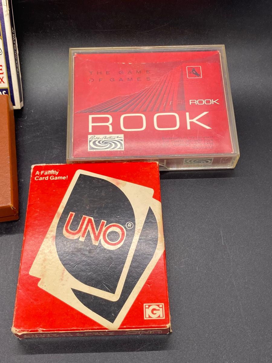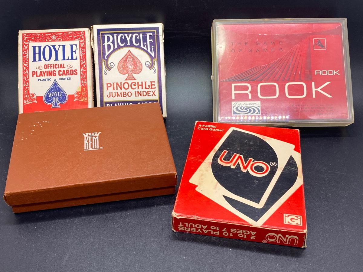 Lot of vintage playing card sets. Plating cards, Uno, and Rook. All have been opened and used, Rook has instruction booklet.