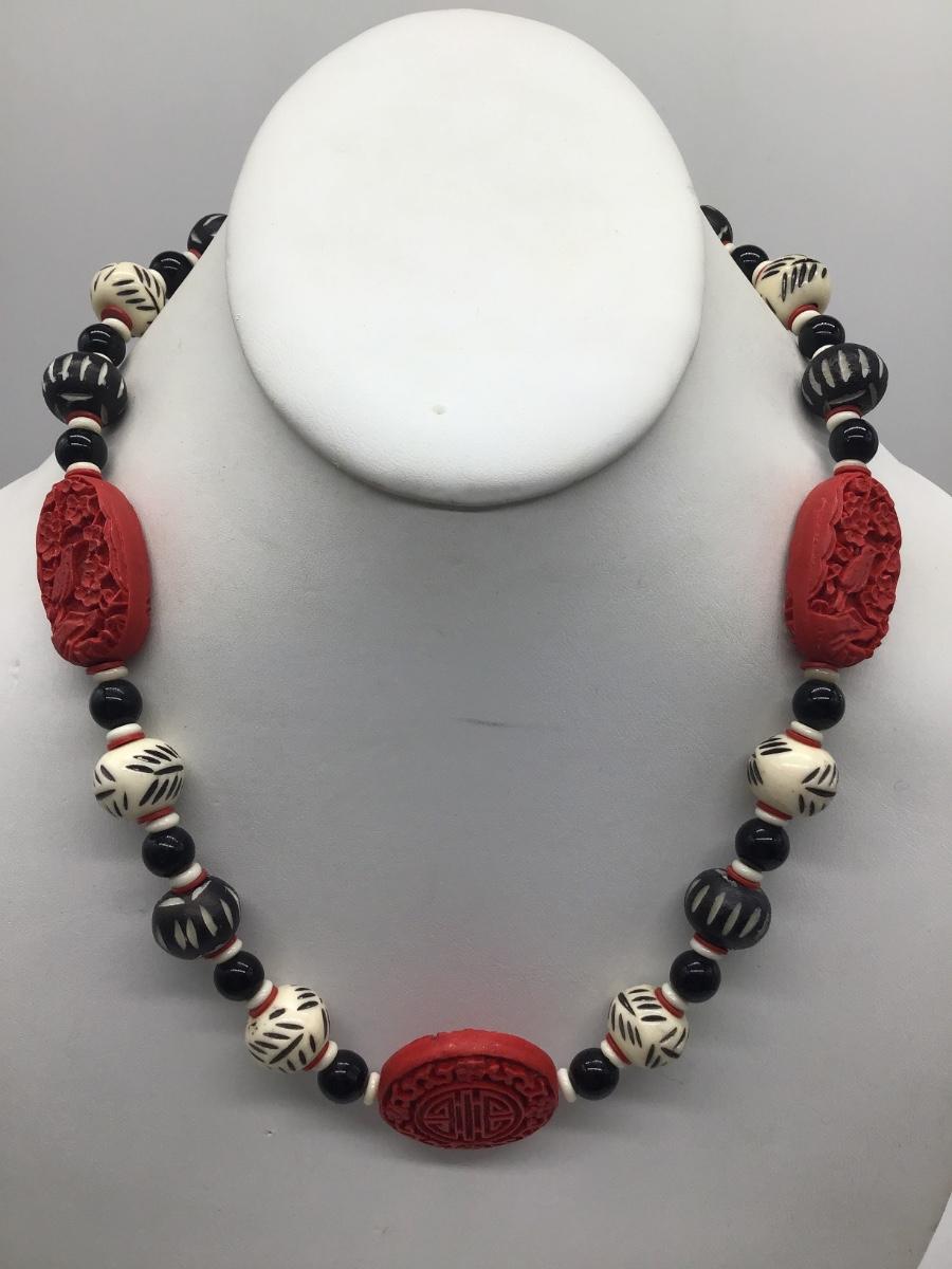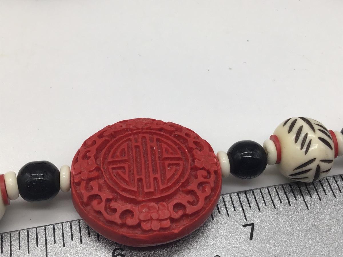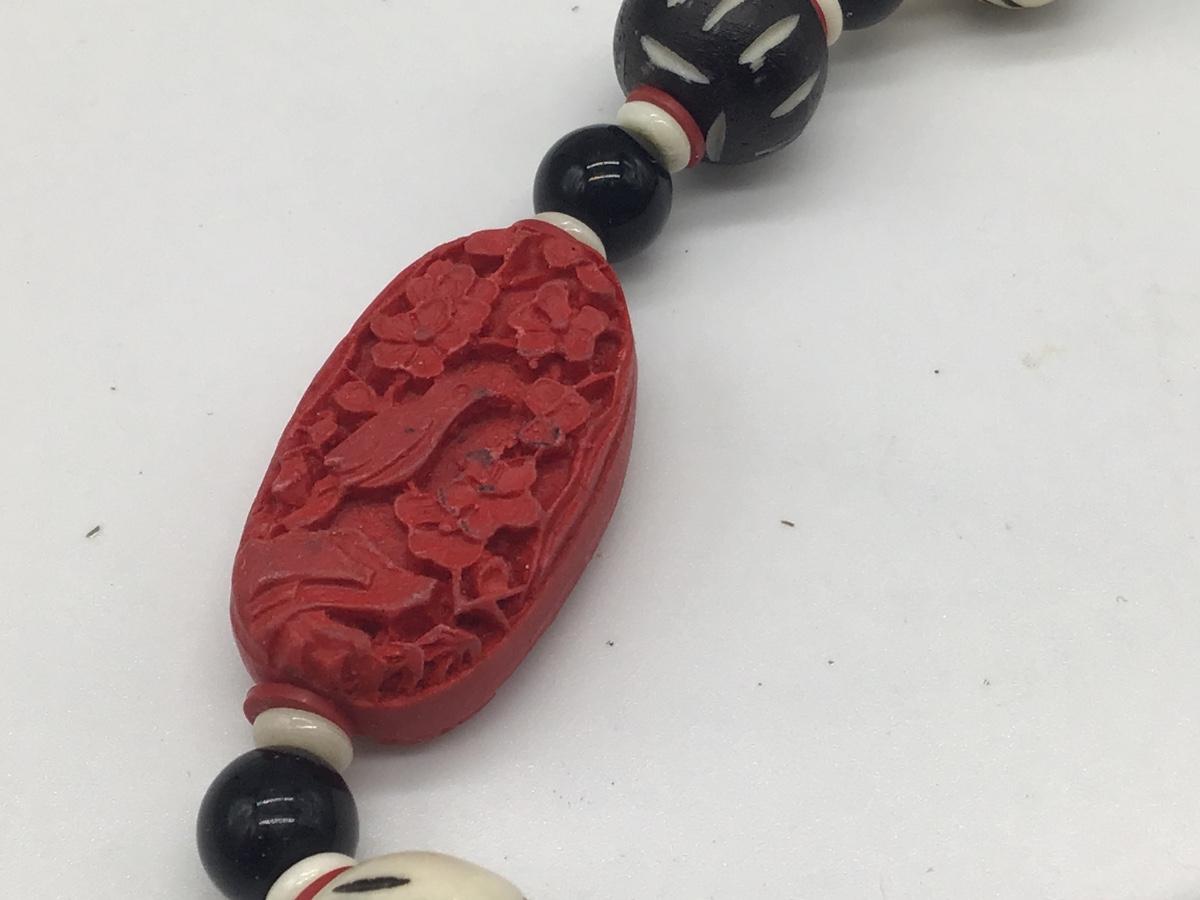 VINTAGE DECO CHINESE CARVED CINNABAR Type RED BLACK BEADS NECKLACE