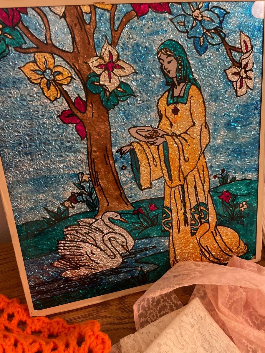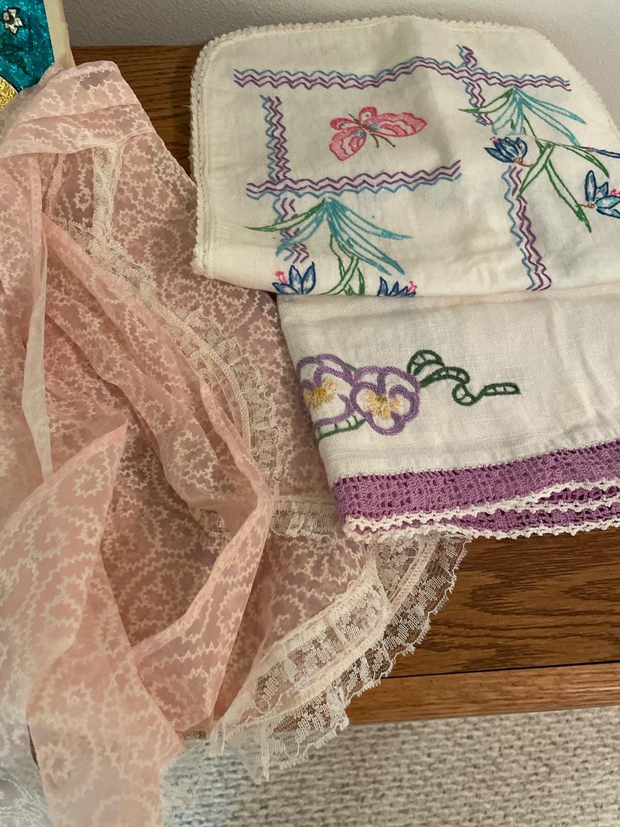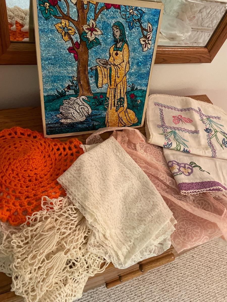 Doilies, pink lace, apron, table, runners, and foil art