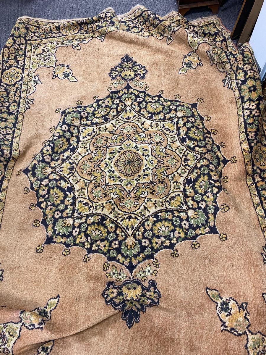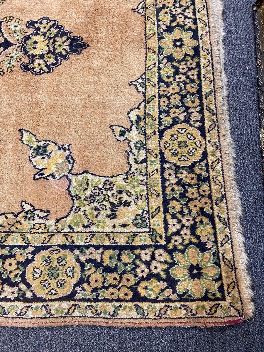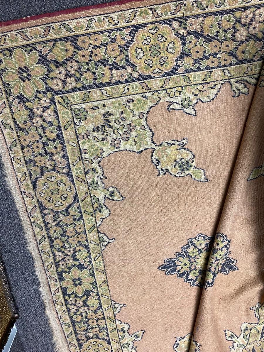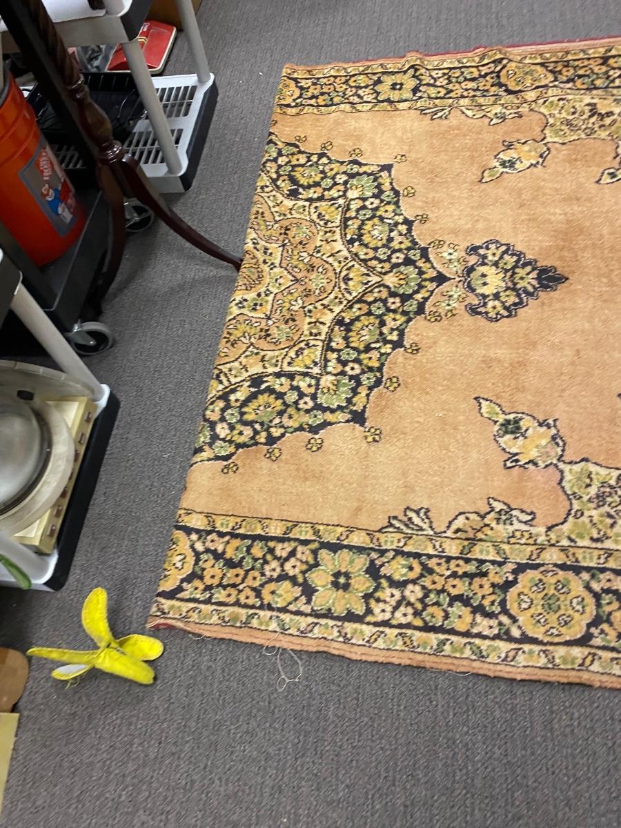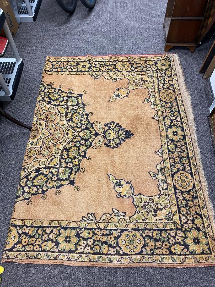 Vintage Decorative Pattern Carpet, there are no significant rips to the carpet and is in good useable condition. Check pictures for more details and for sizing. About 5'x8' size.