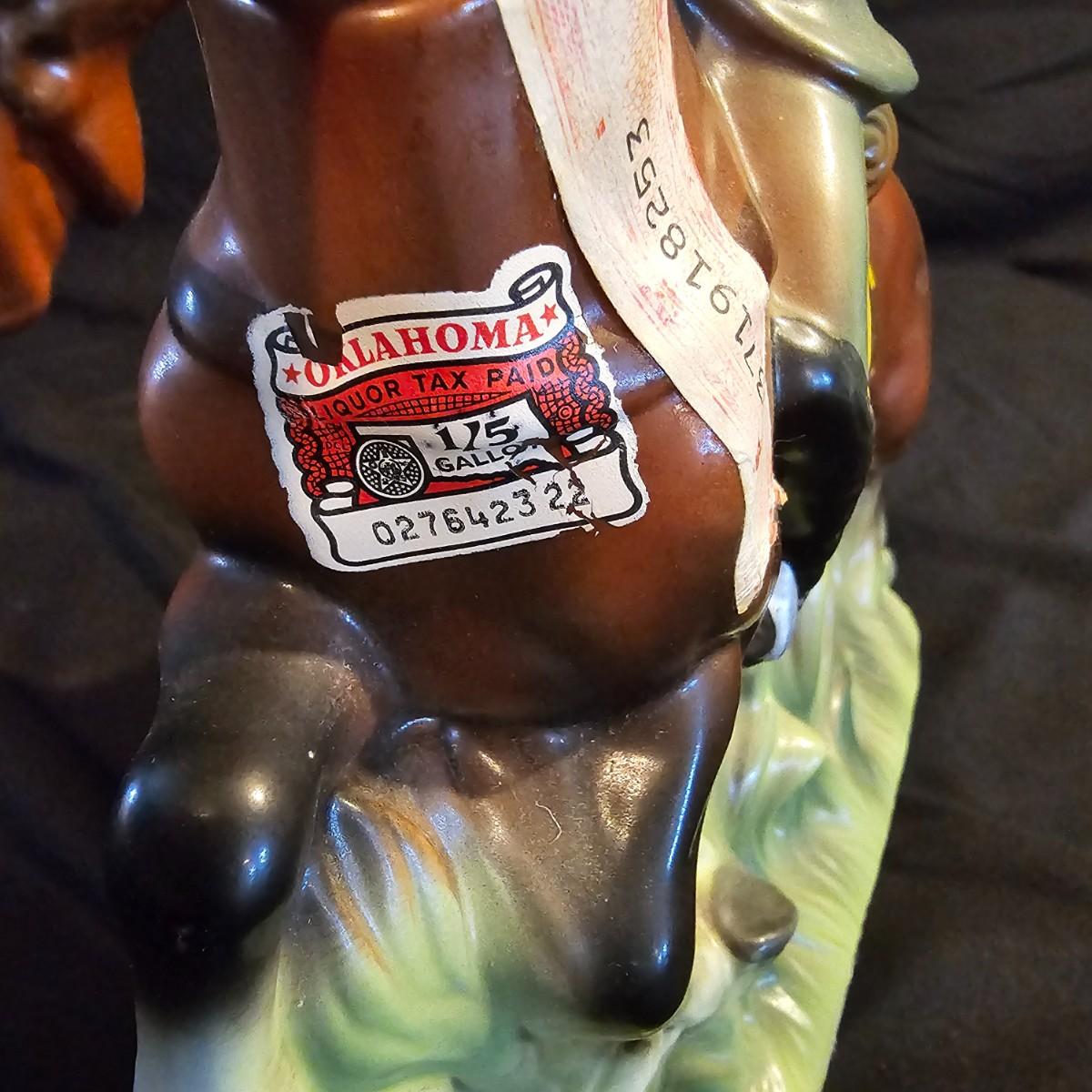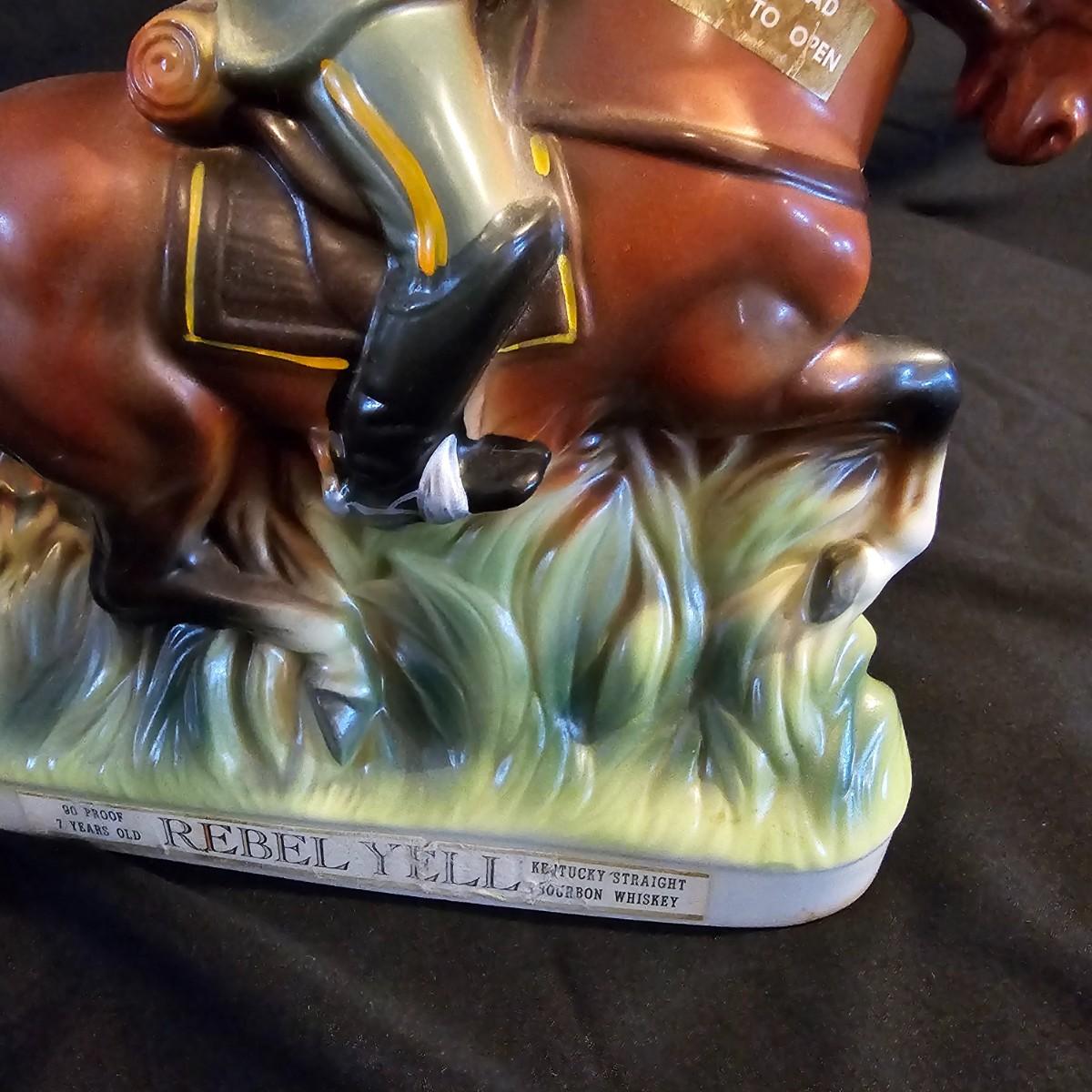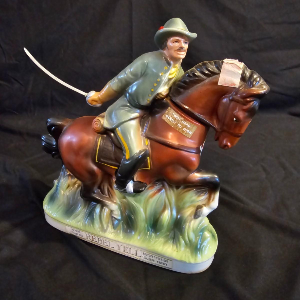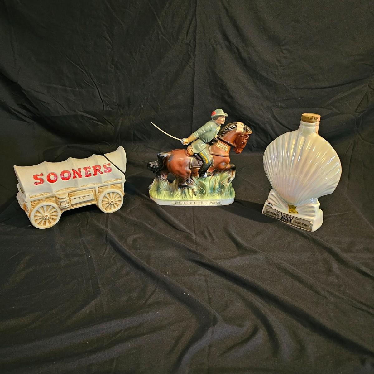 Three very distinctive commemorative whiskey decanters. Rebel Yell is soldier on horseback with saber, measures 10" x 3.5" x 9"H. Oklahoma Sooners wagon is 9.5" x 4" x 5.5"H. Pearlized shell is 7" x 3" x 9.75"H. All decanters are empty. See photos for details. Shipping available.