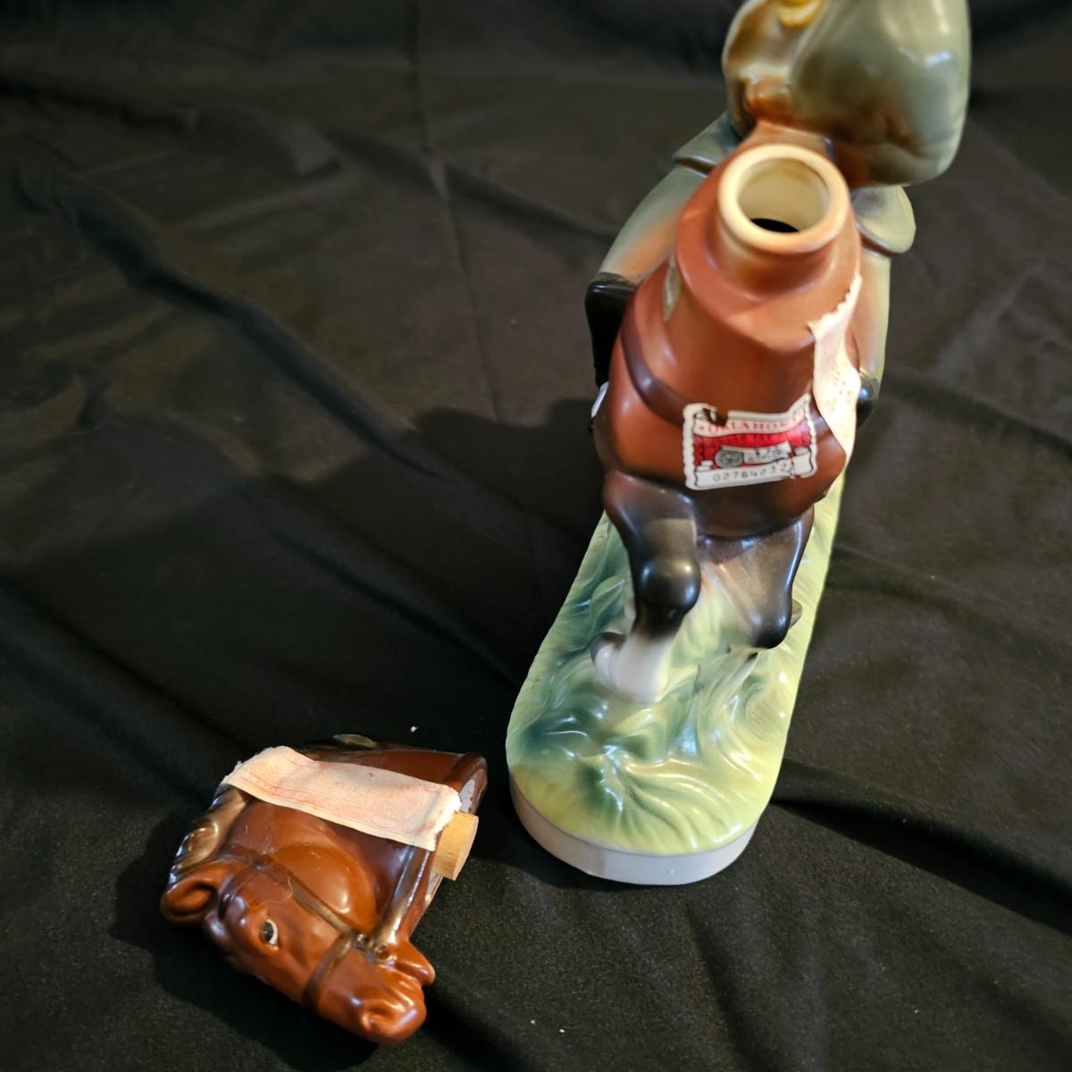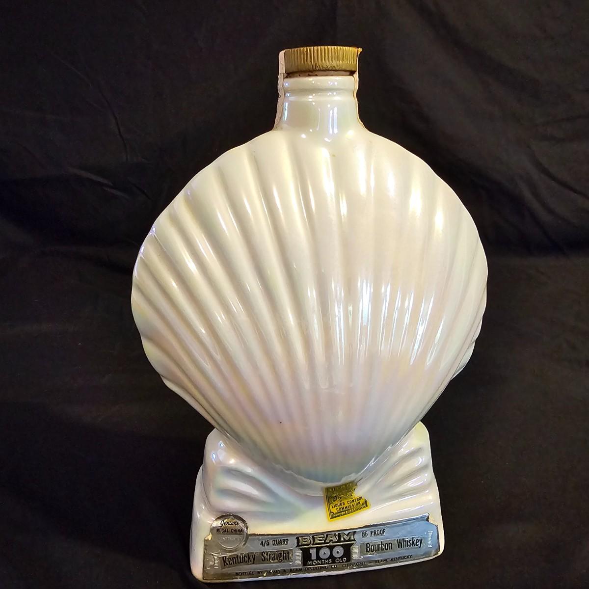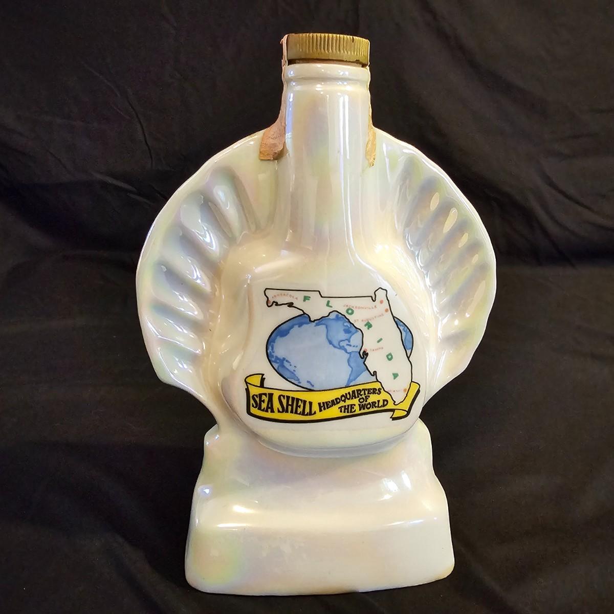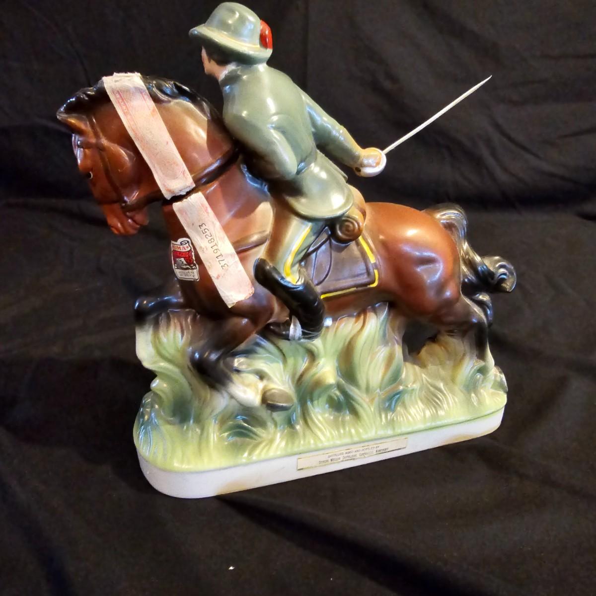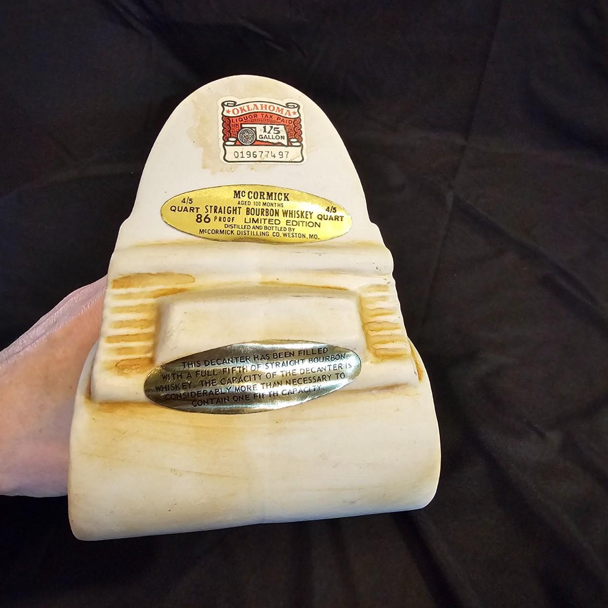Three very distinctive commemorative whiskey decanters. Rebel Yell is soldier on horseback with saber, measures 10" x 3.5" x 9"H. Oklahoma Sooners wagon is 9.5" x 4" x 5.5"H. Pearlized shell is 7" x 3" x 9.75"H. All decanters are empty. See photos for details. Shipping available.