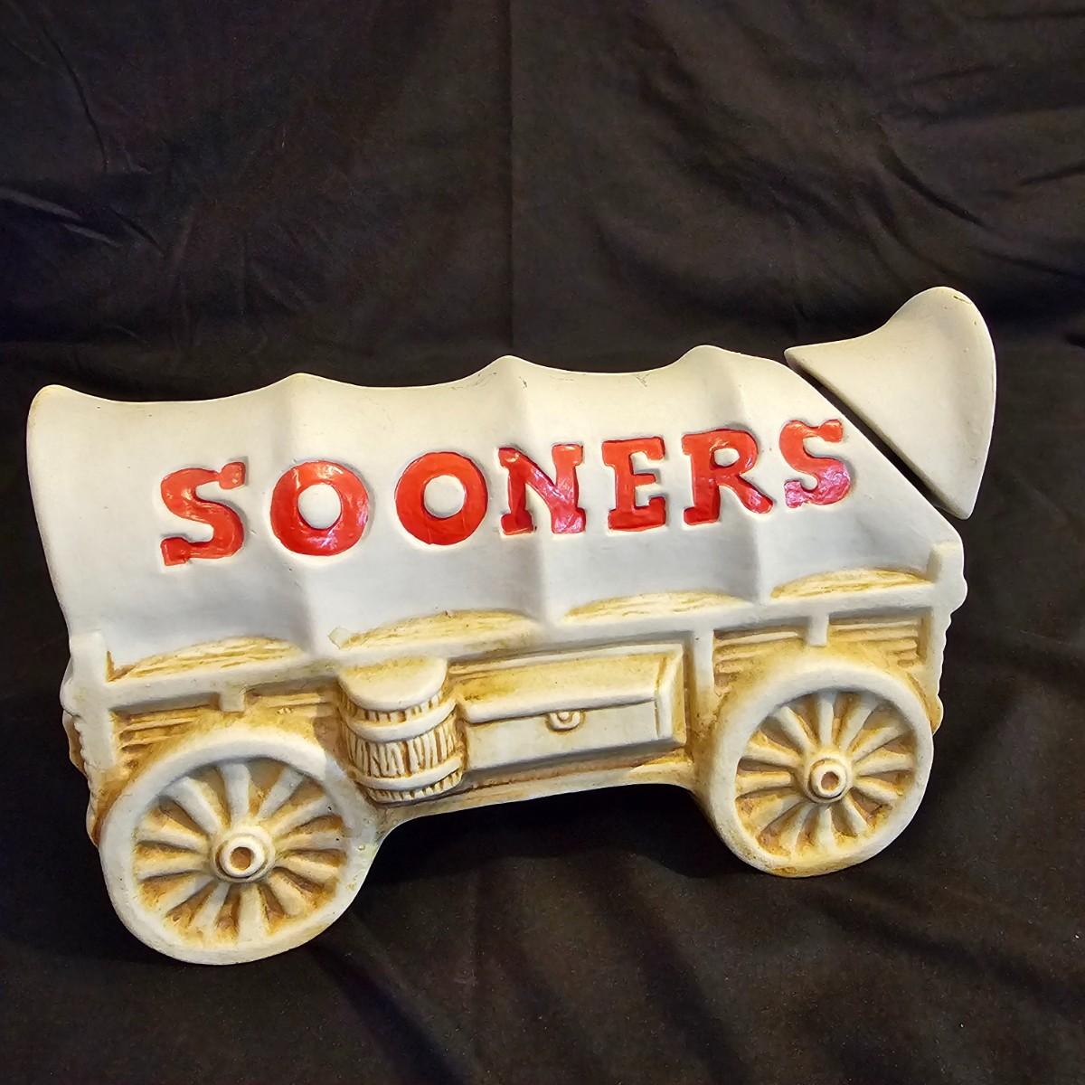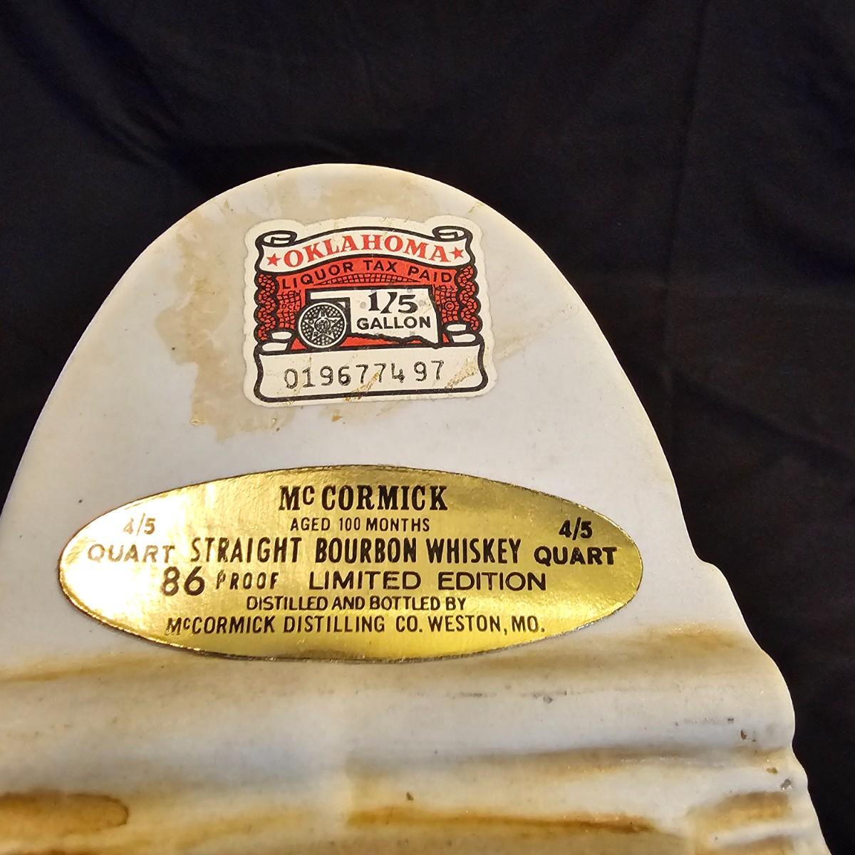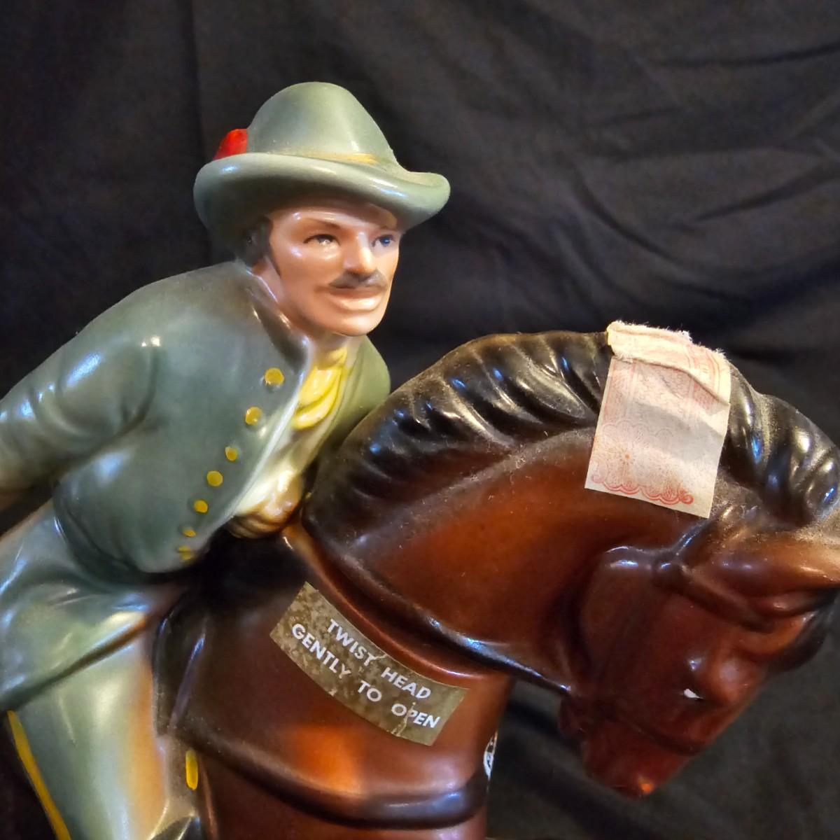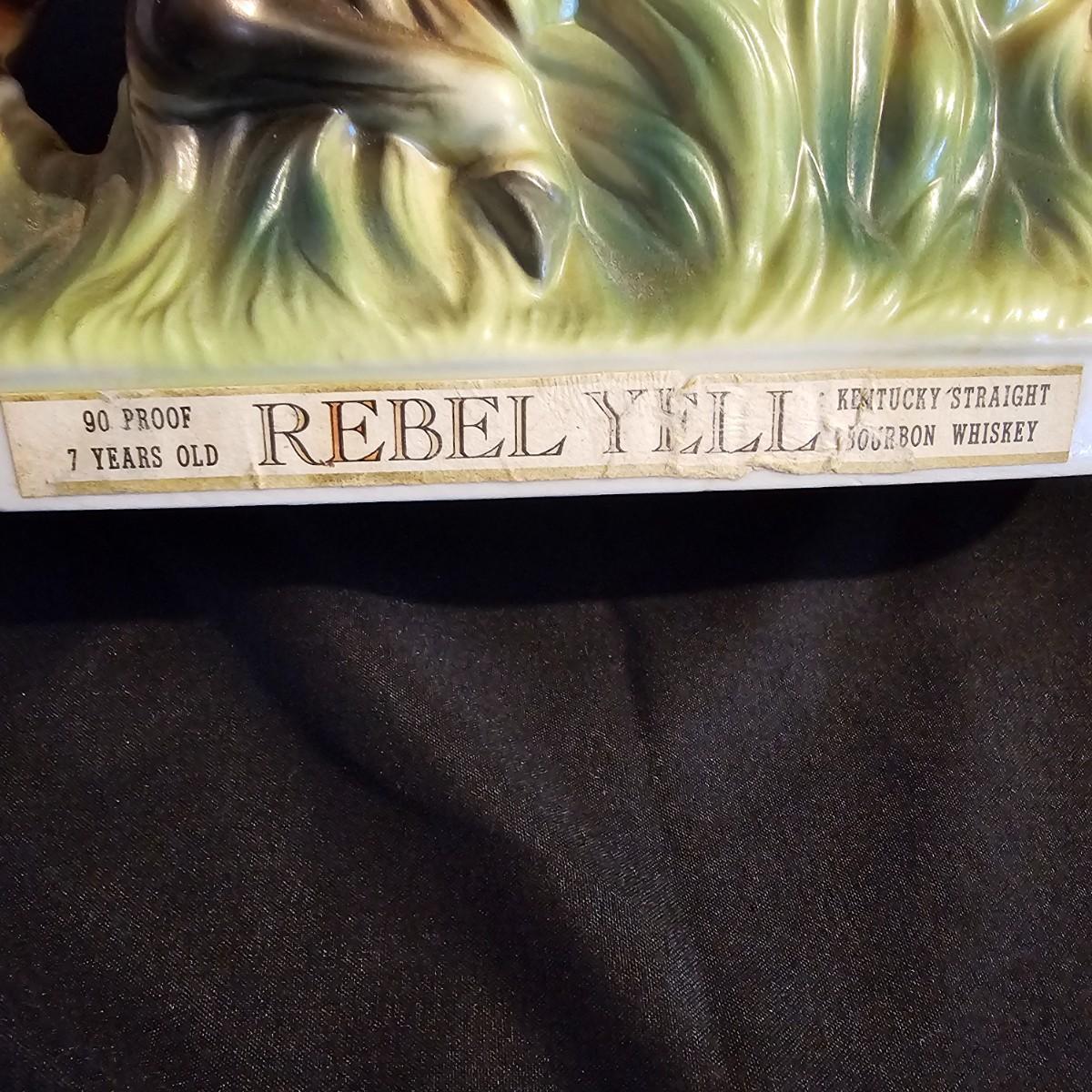 Three very distinctive commemorative whiskey decanters. Rebel Yell is soldier on horseback with saber, measures 10" x 3.5" x 9"H. Oklahoma Sooners wagon is 9.5" x 4" x 5.5"H. Pearlized shell is 7" x 3" x 9.75"H. All decanters are empty. See photos for details. Shipping available.