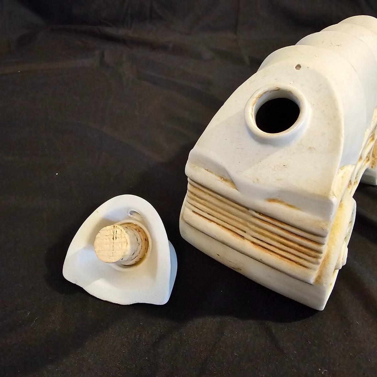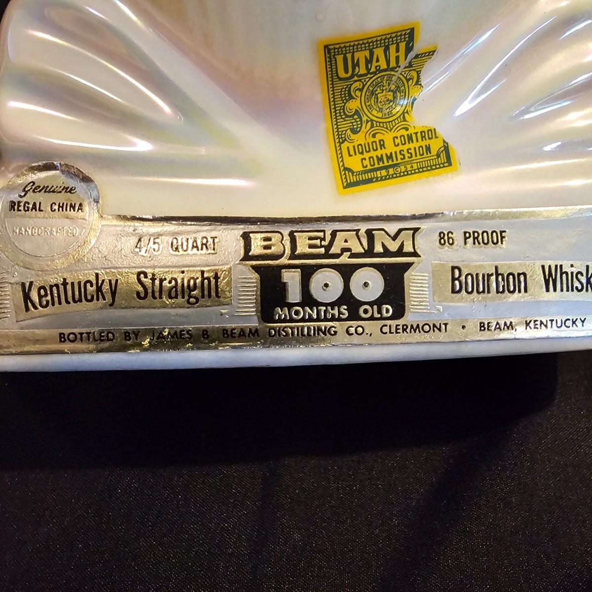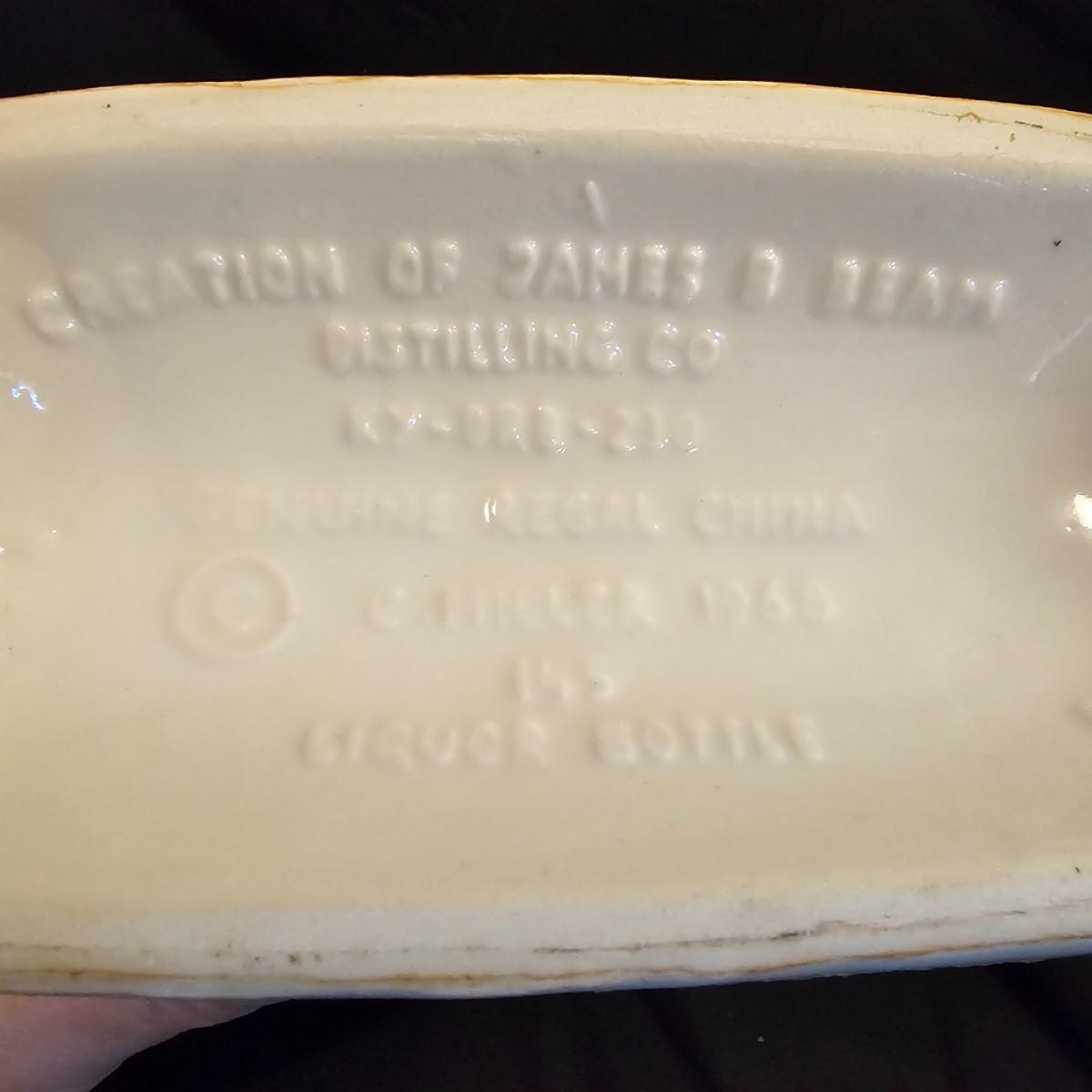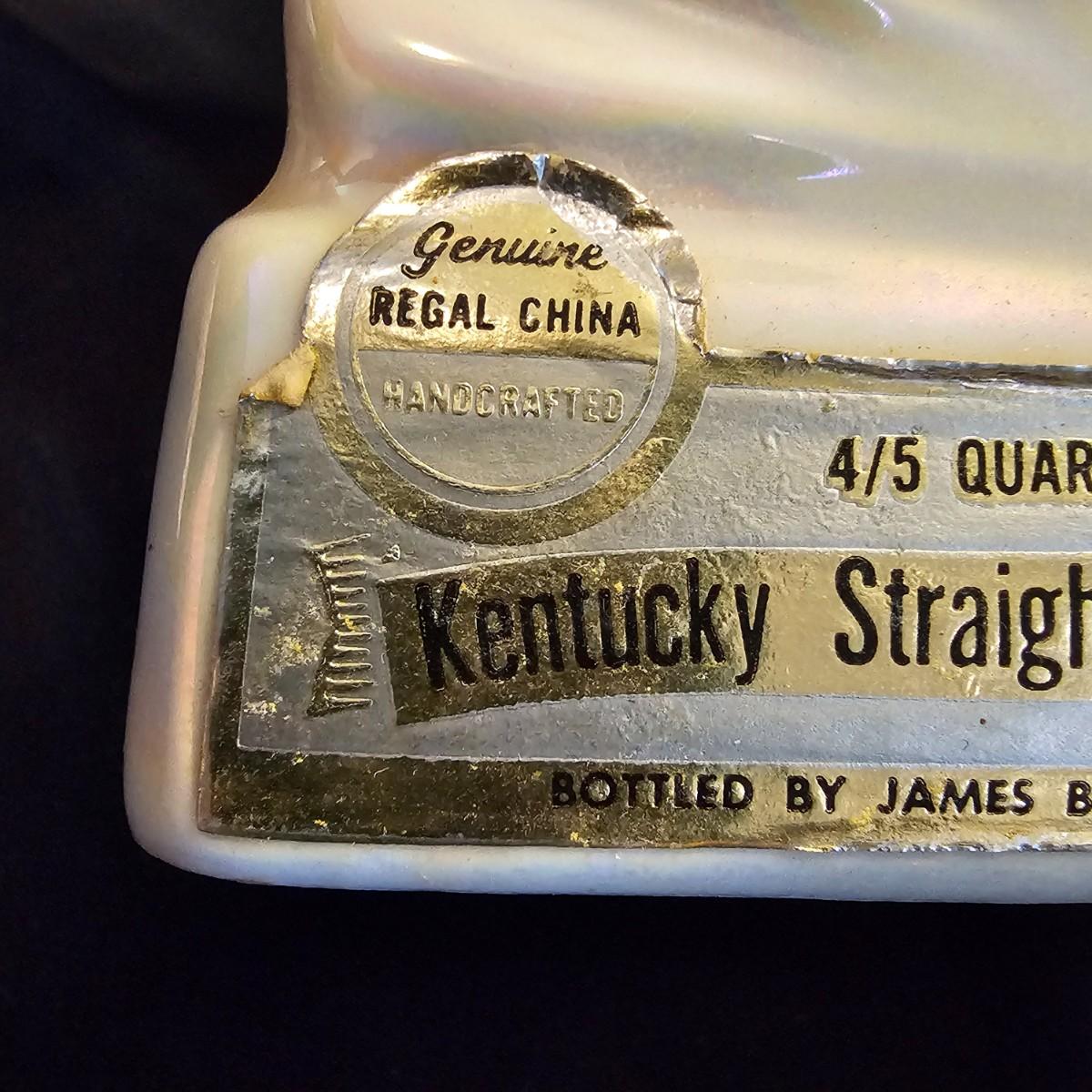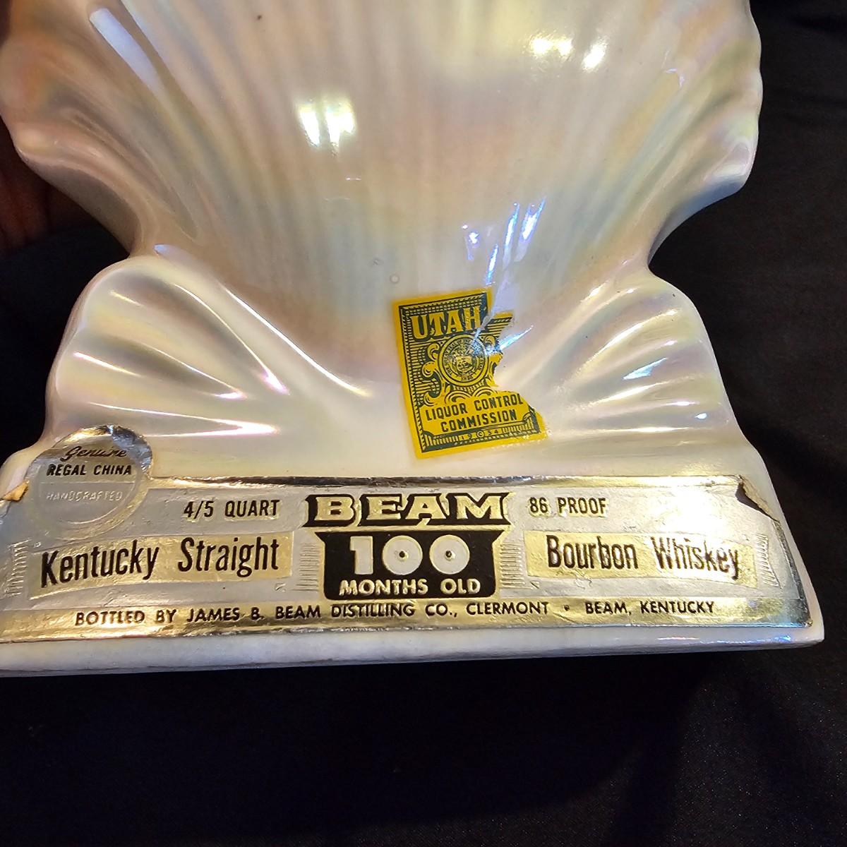 Three very distinctive commemorative whiskey decanters. Rebel Yell is soldier on horseback with saber, measures 10" x 3.5" x 9"H. Oklahoma Sooners wagon is 9.5" x 4" x 5.5"H. Pearlized shell is 7" x 3" x 9.75"H. All decanters are empty. See photos for details. Shipping available.