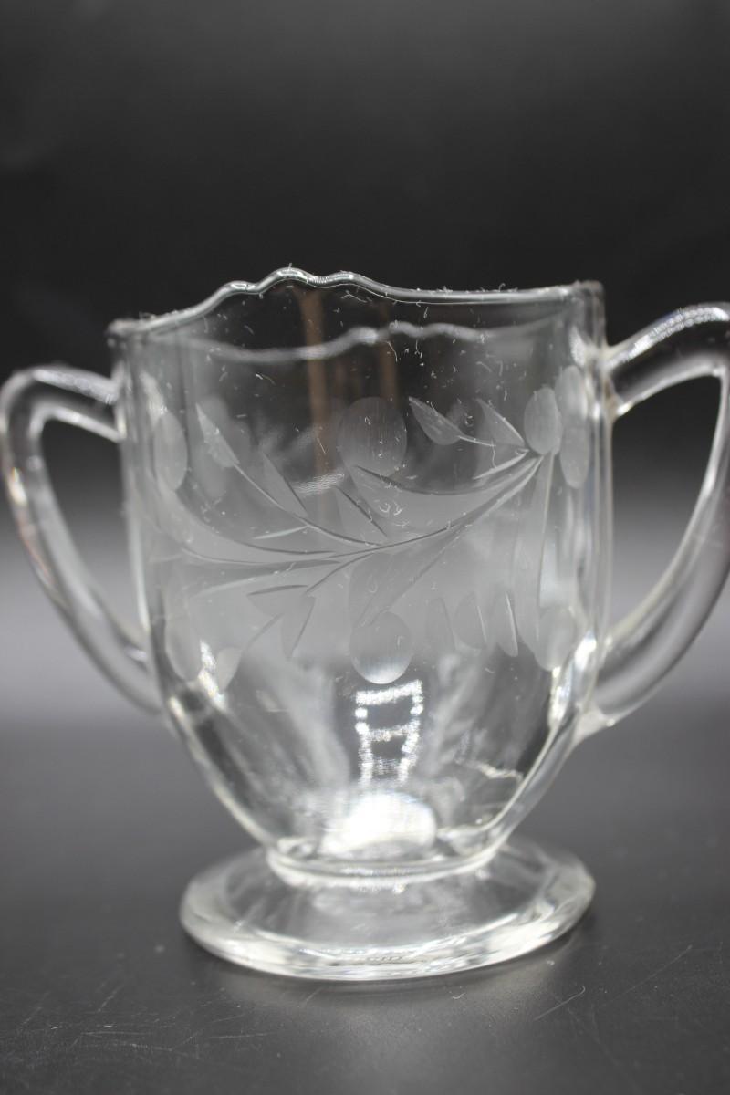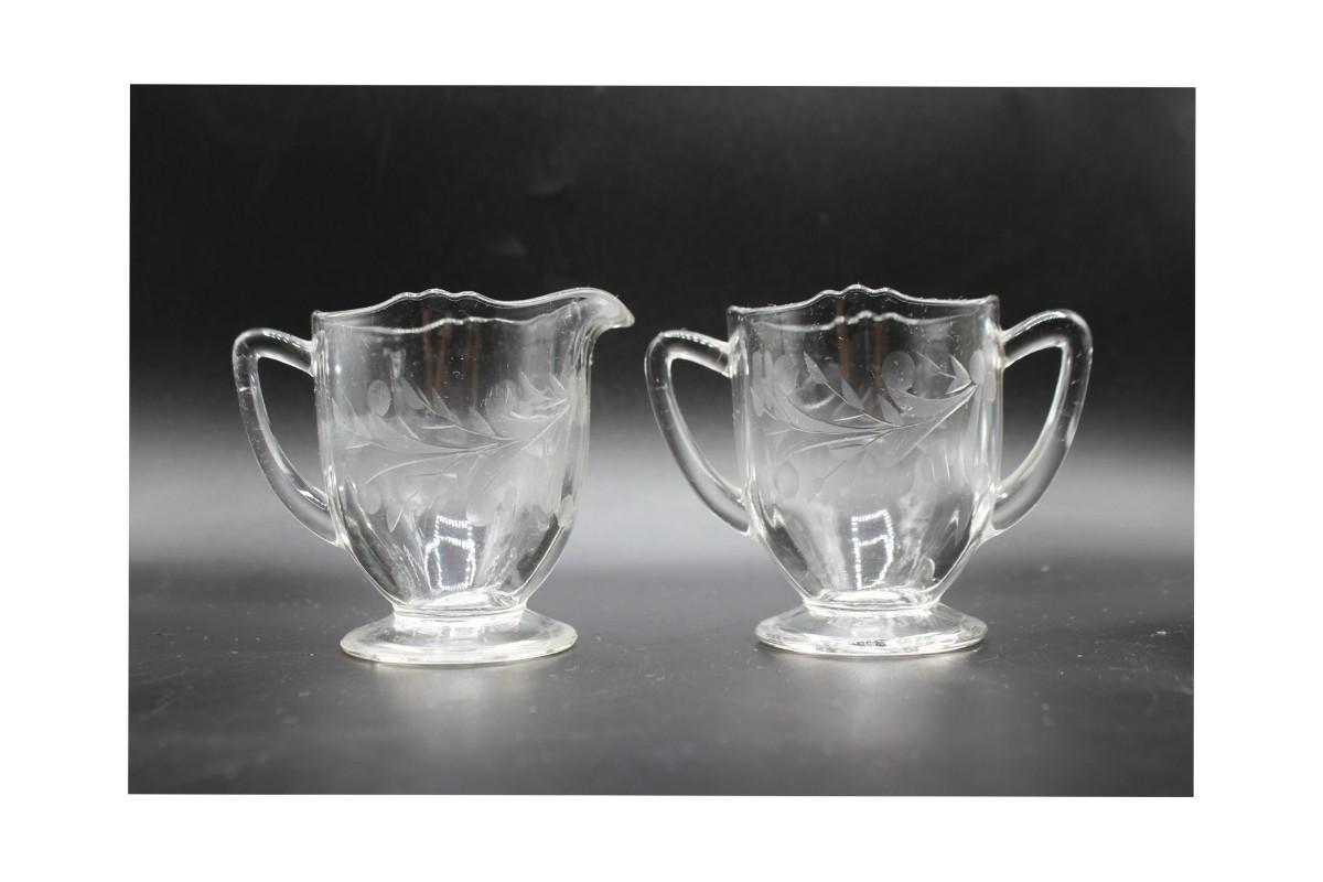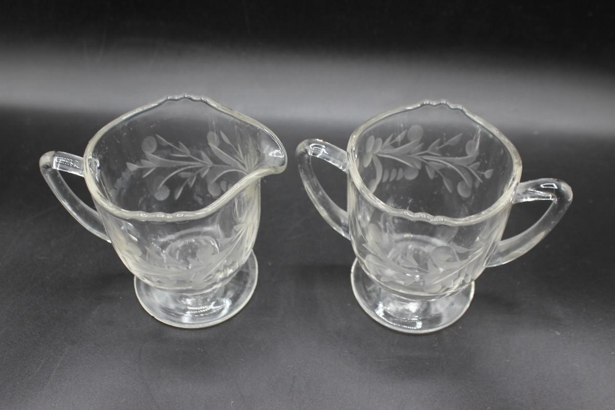Vintage Decorative Etched Clear Glass Open Sugar Bowl and Creamer Teaware