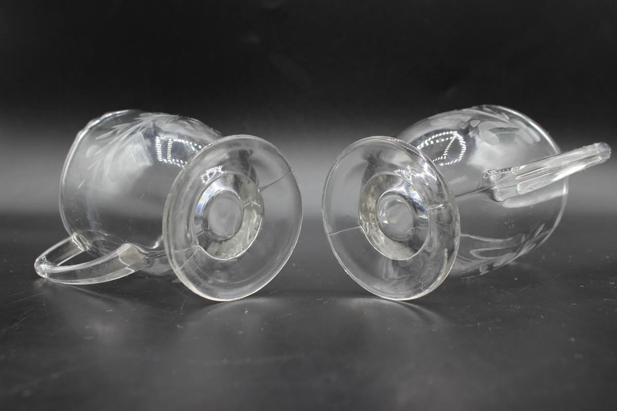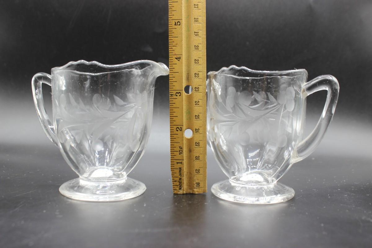 Vintage Decorative Etched Clear Glass Open Sugar Bowl and Creamer Teaware, there are no cracks or chips to either pieces and is in good condition. Check pictures for more details and for sizing.