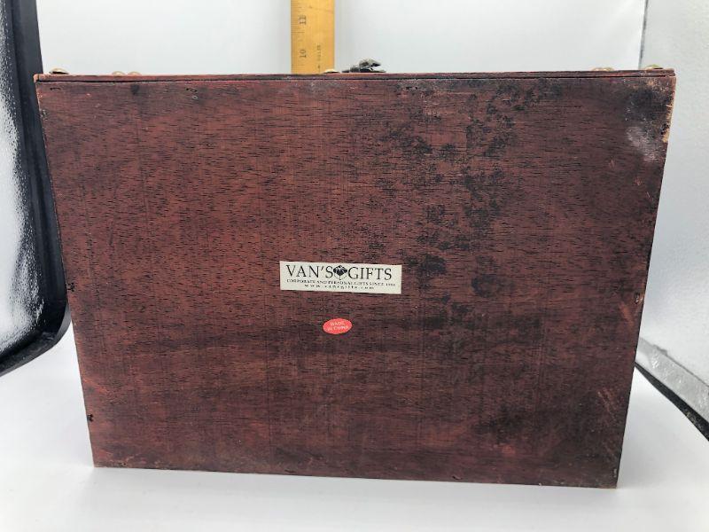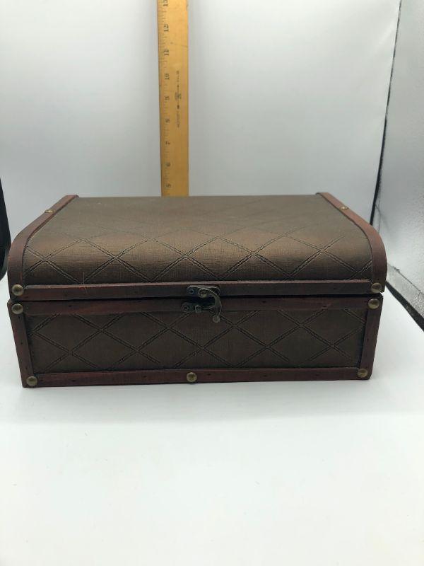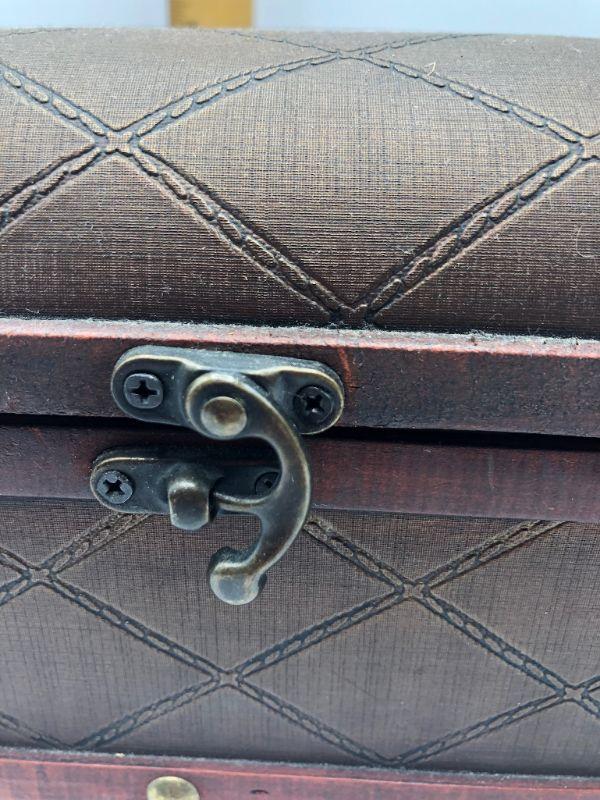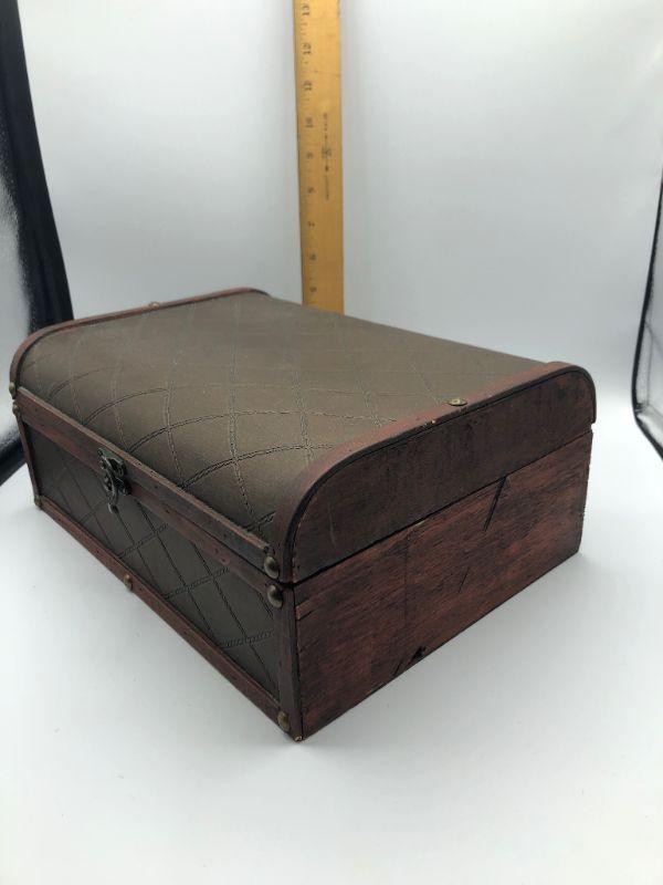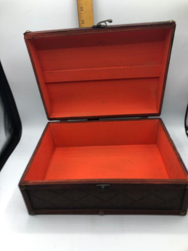 Vintage Wood Decorative Box. Lined with a red orange fabric. Simple swing hook latch. Very light wear along edges.