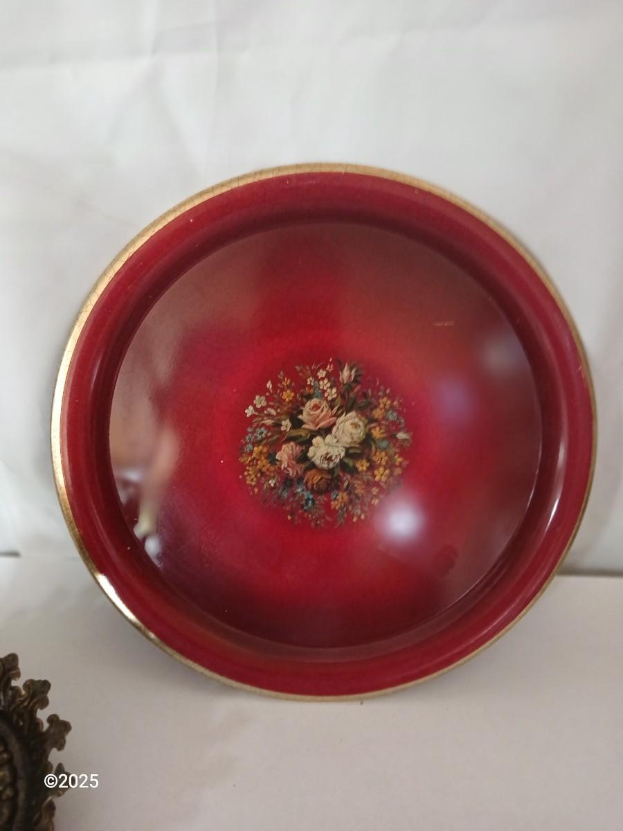 Elegant and richly hued, this set of four vintage metal wall plates brings classic Victorian charm to any room. Crafted in England, each plate features a central floral bouquet transfer design framed by a glossy enamel finish in festive red and green tones, with gilded edging.