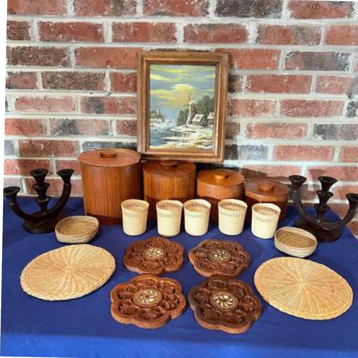 Big Lot MCM Vintage Decorative Wood & Weave Lot -Teak, Olive Wood, Oil Painting
