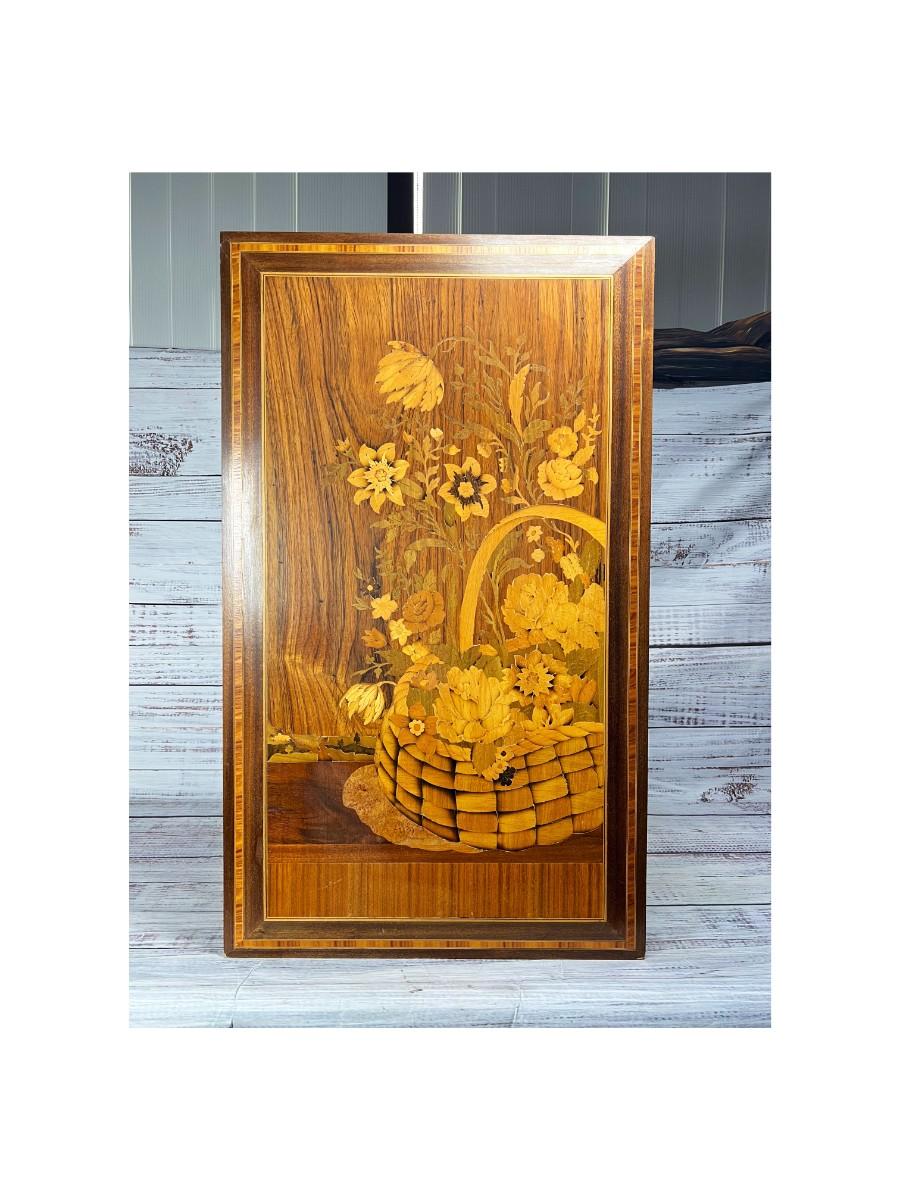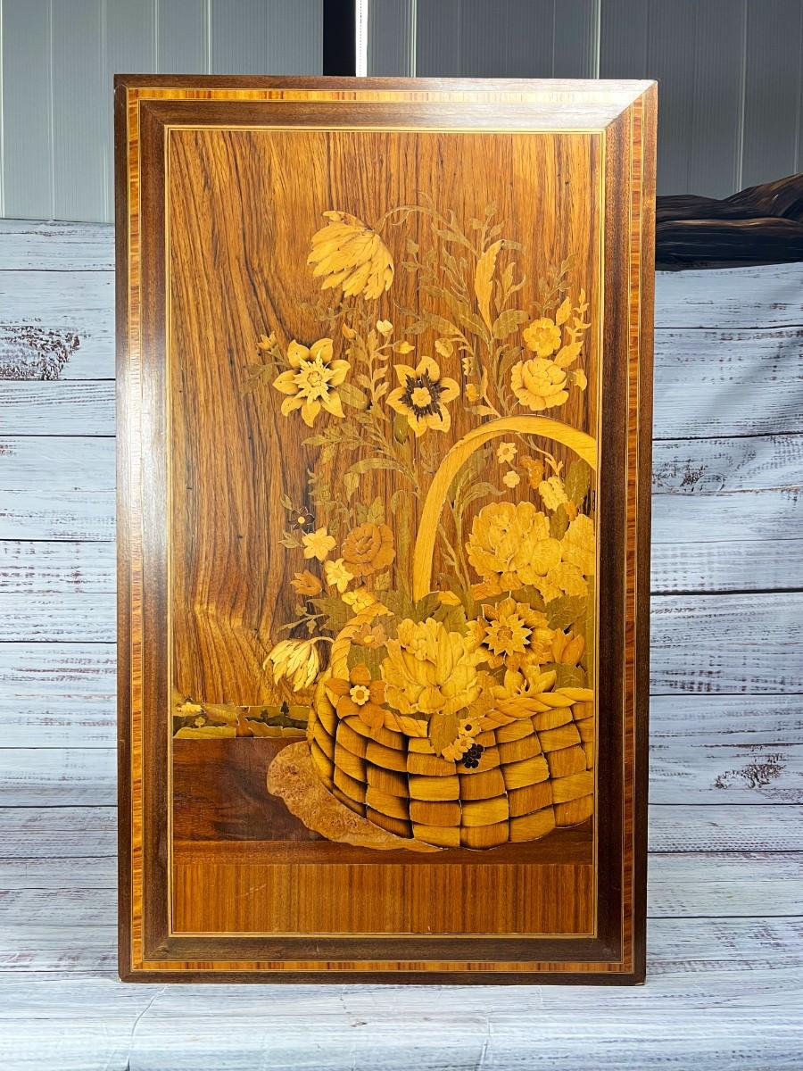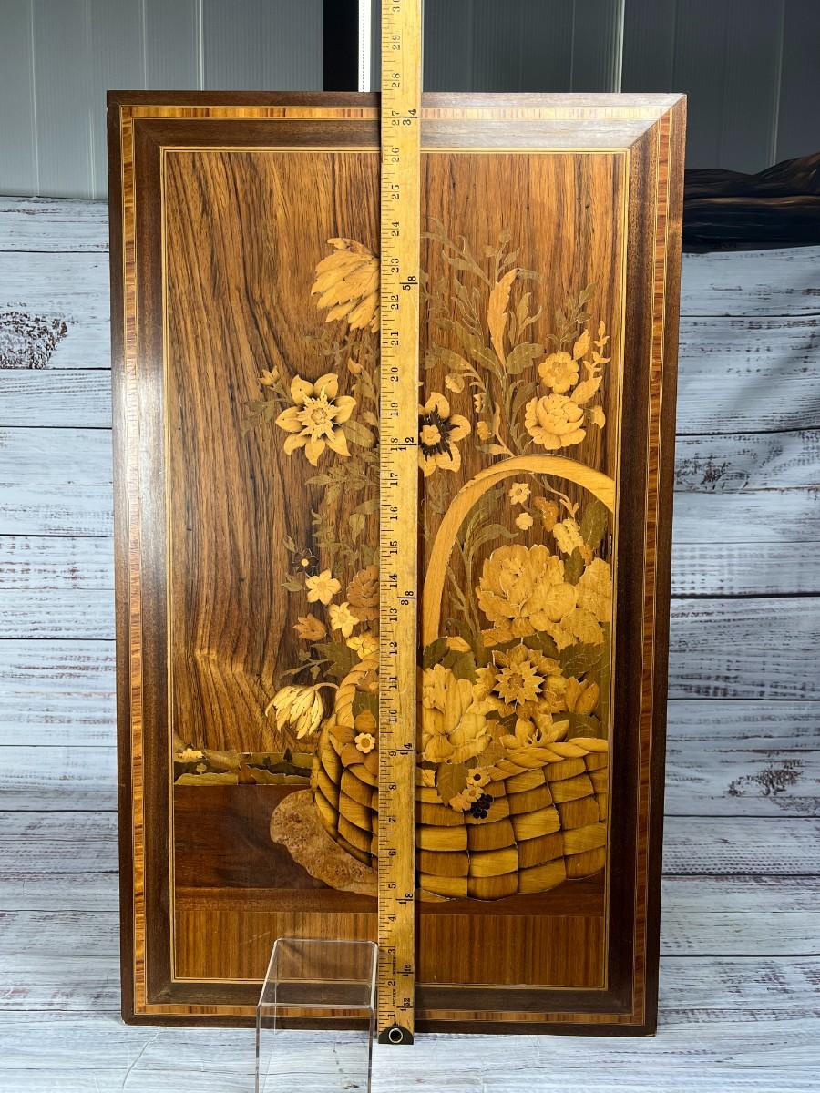 Vintage Decorative Wood Panel Various Flowers in Baskets, there is no significant damage to the wood panel and is in good displayable condition. Check pictures for more details and for sizing.