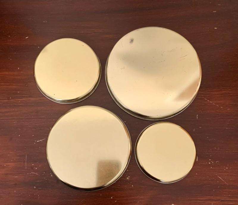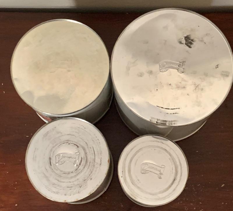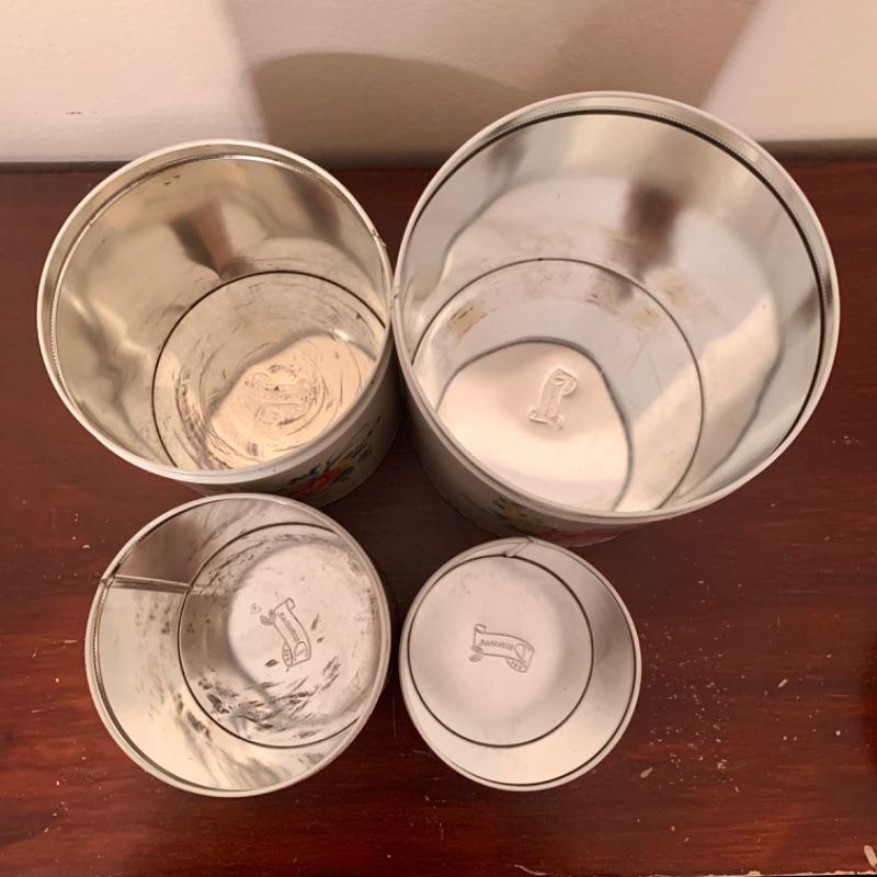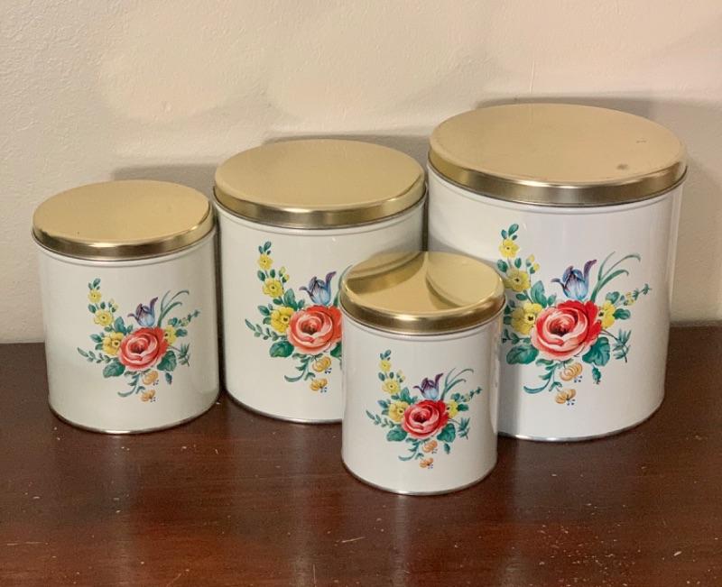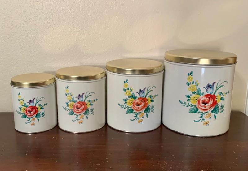 Set of 4, Decoware canisters. Excellent condition for age, with typical surface wear. Measures 5 1/4,” 6,” 6 3/4” and 7 3/4”.