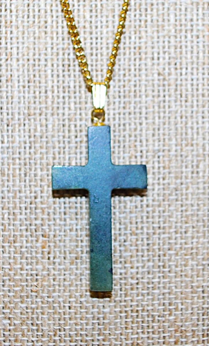 VINTAGE Deep Green "Marble" Style CROSS (1½" x ¾") on a Gold Tone Necklace Chain 24" L
