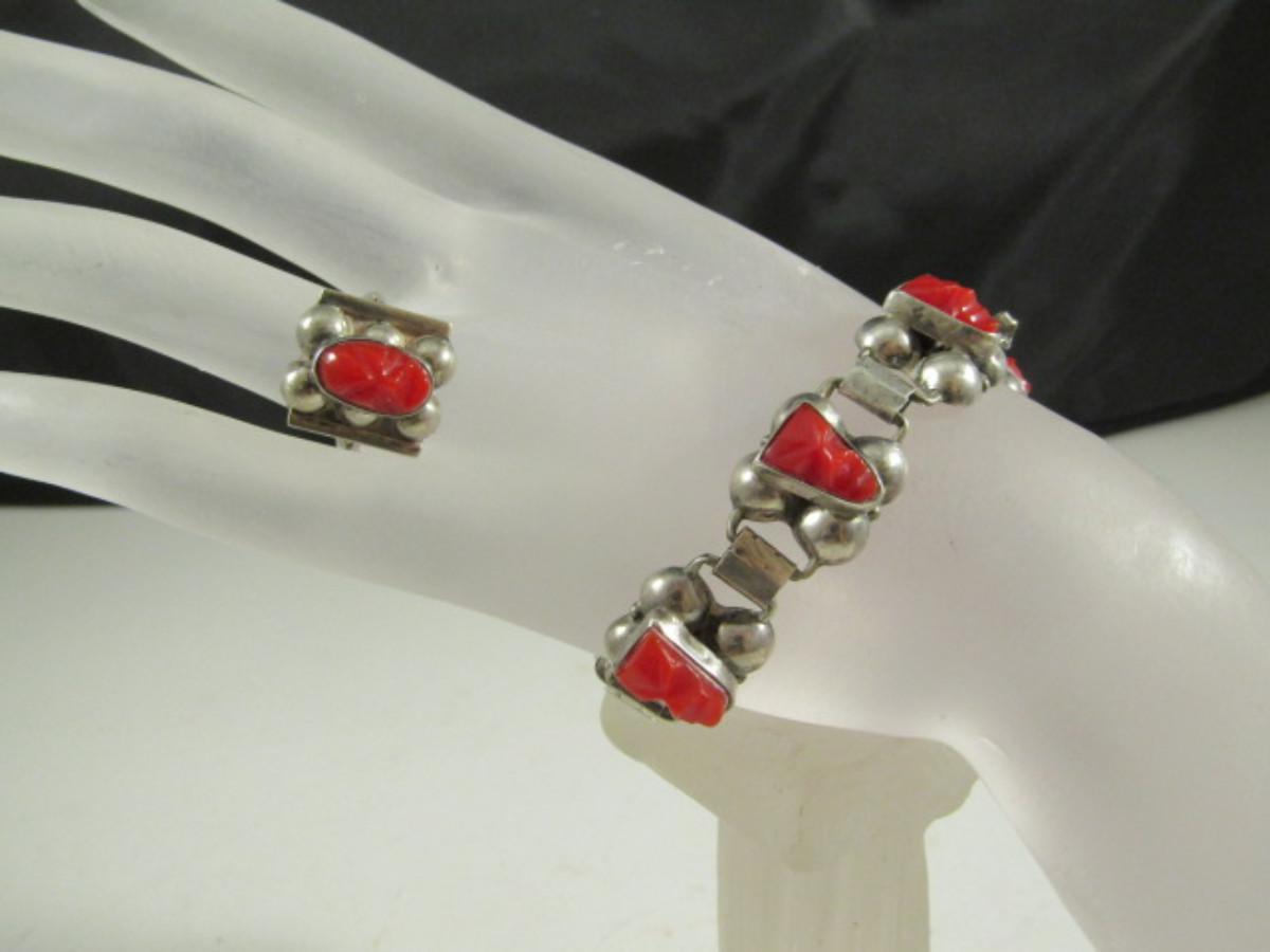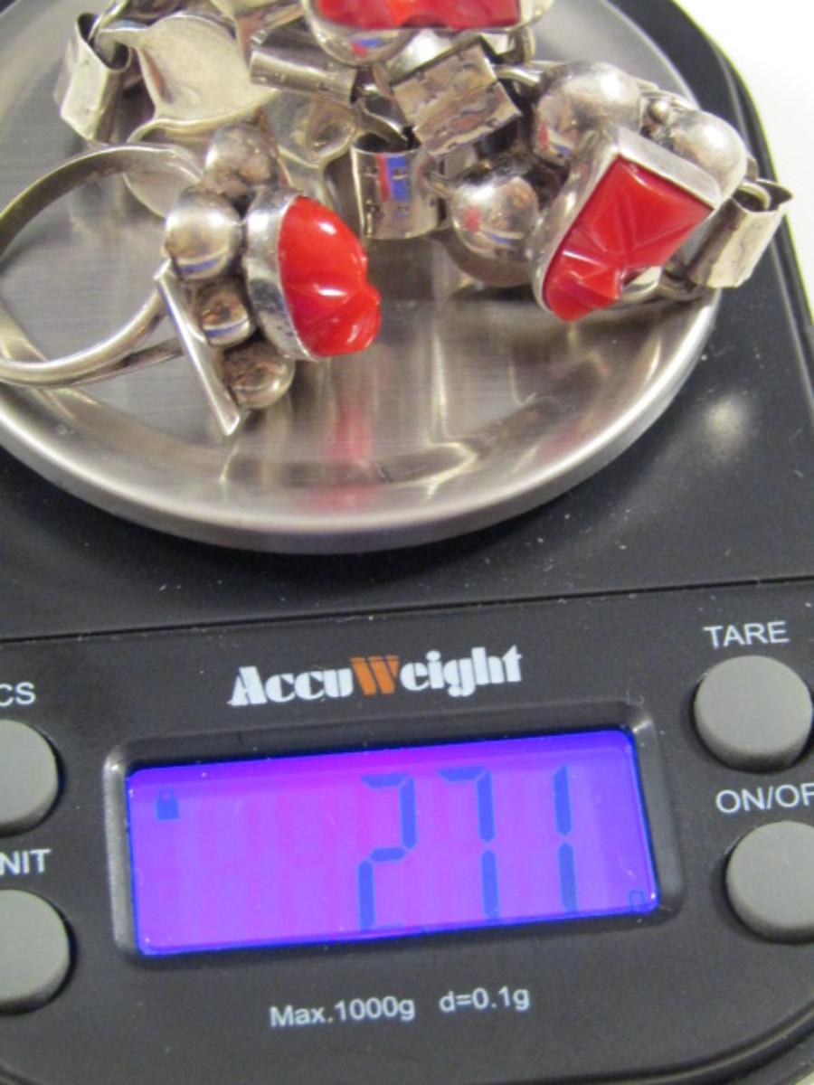 Vintage Del Rio Sterling Silver and Red Jasper Aztec Mask Design Bracelet and Ring Set- Approx 27.1 Grams (#22)