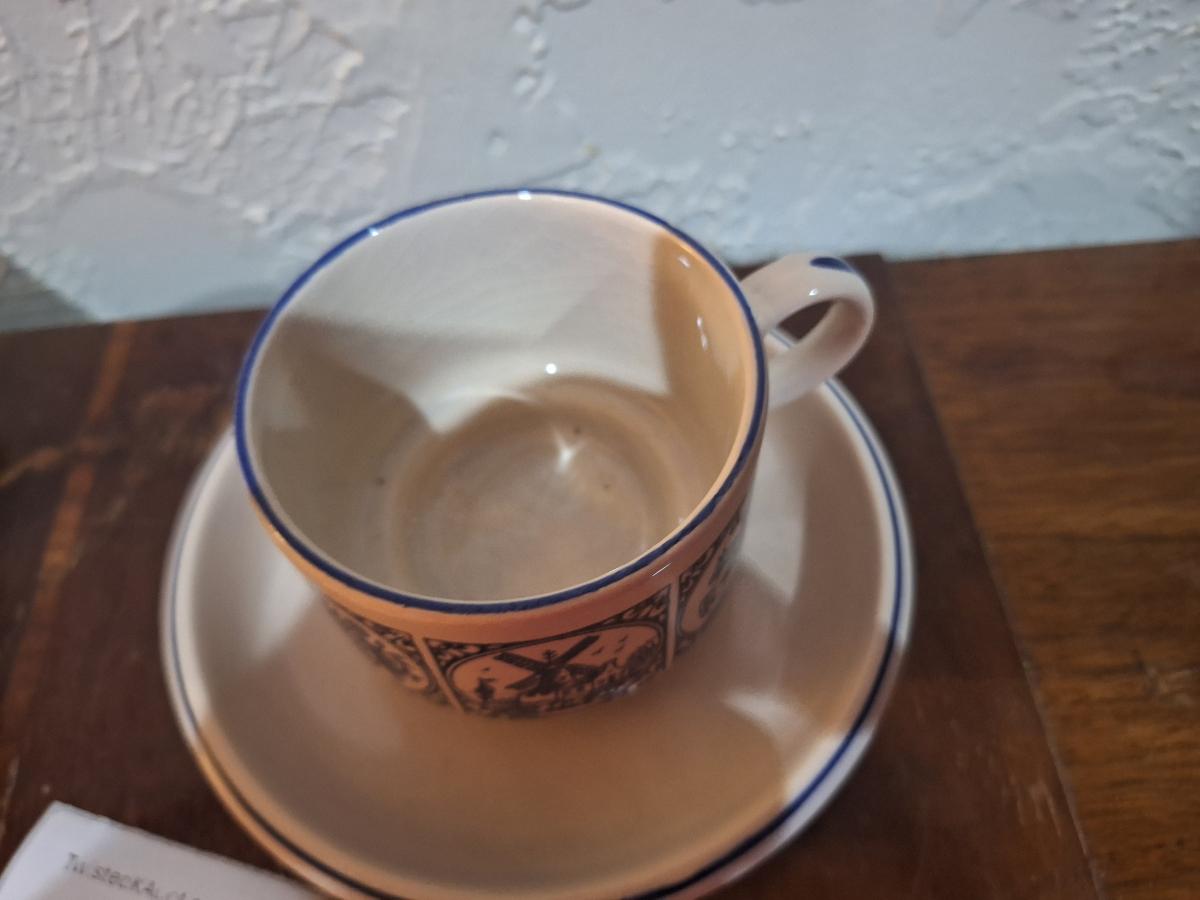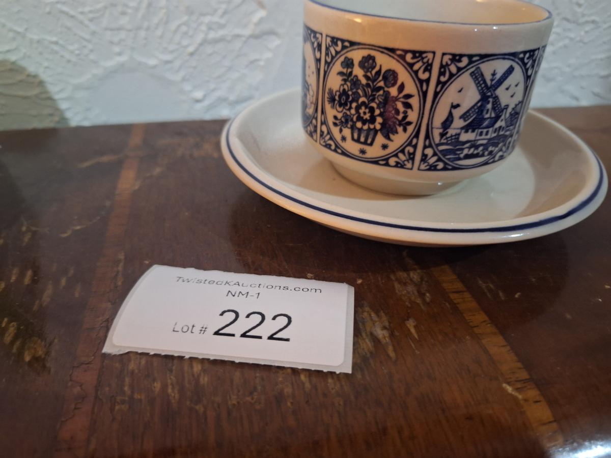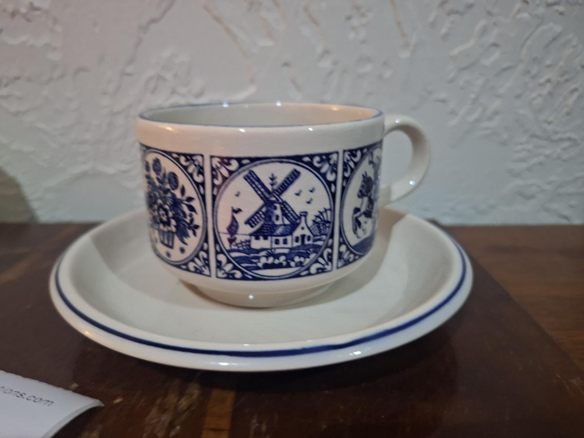 vintage Delft Blue ceramic teacup and saucer set, featuring a classic Dutch windmill and floral design