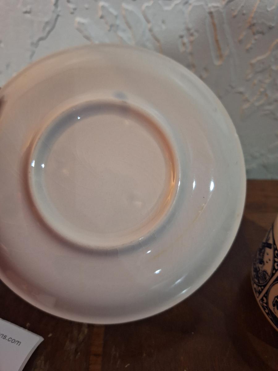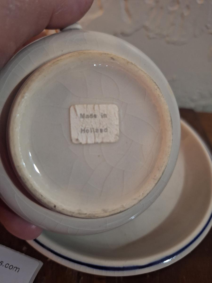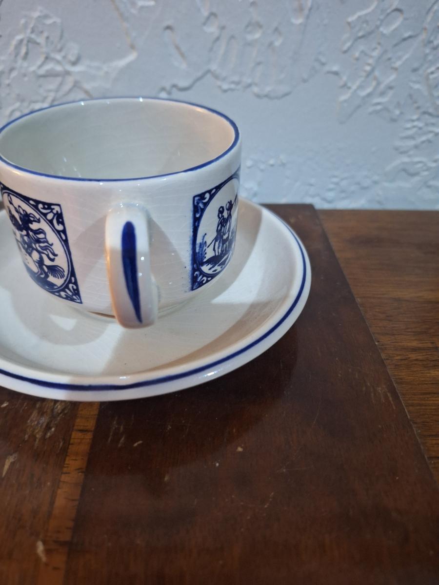 vintage Delft Blue ceramic teacup and saucer set, featuring a classic Dutch windmill and floral design