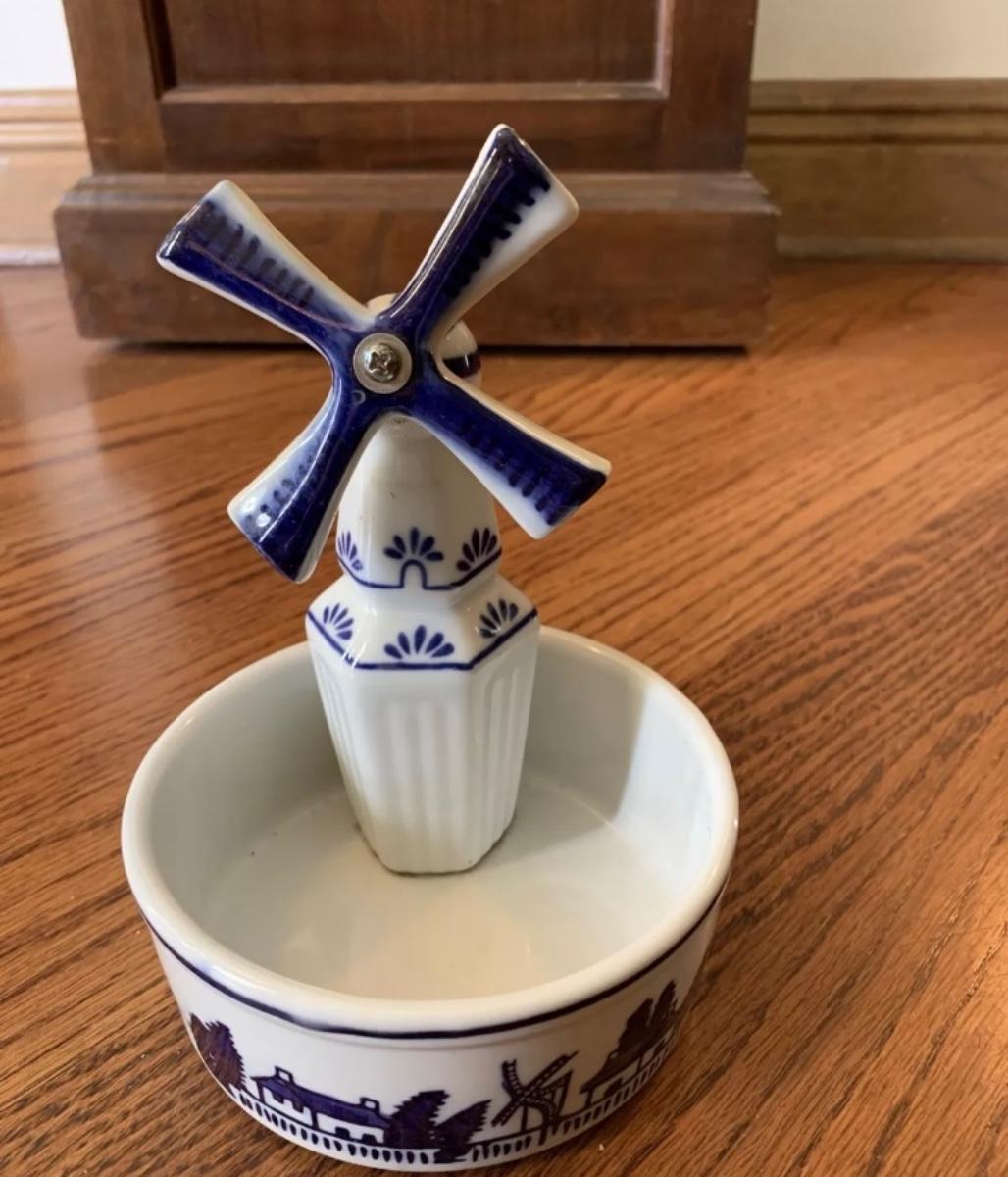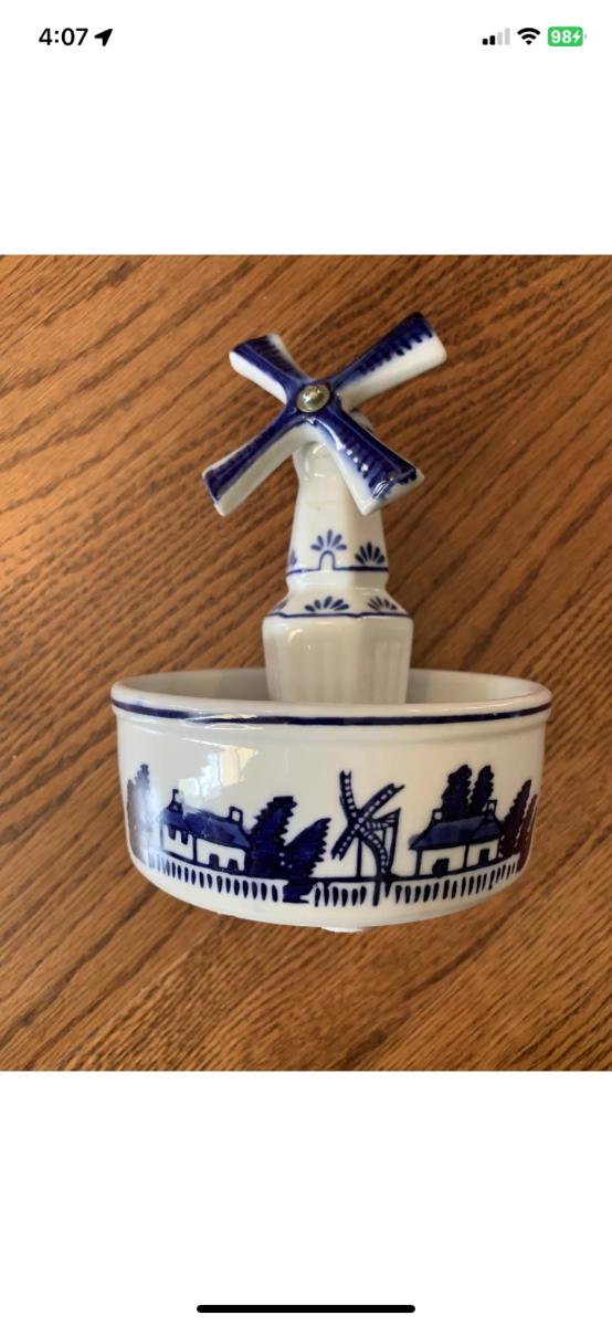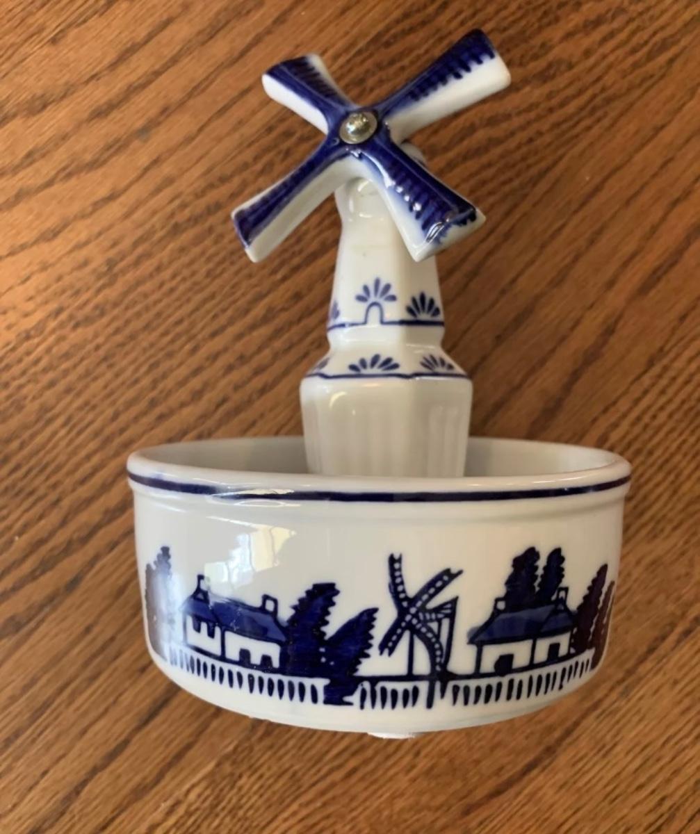 Vintage Delft HP blue-white porcelain windmill dish, Holland. Windmill turns
