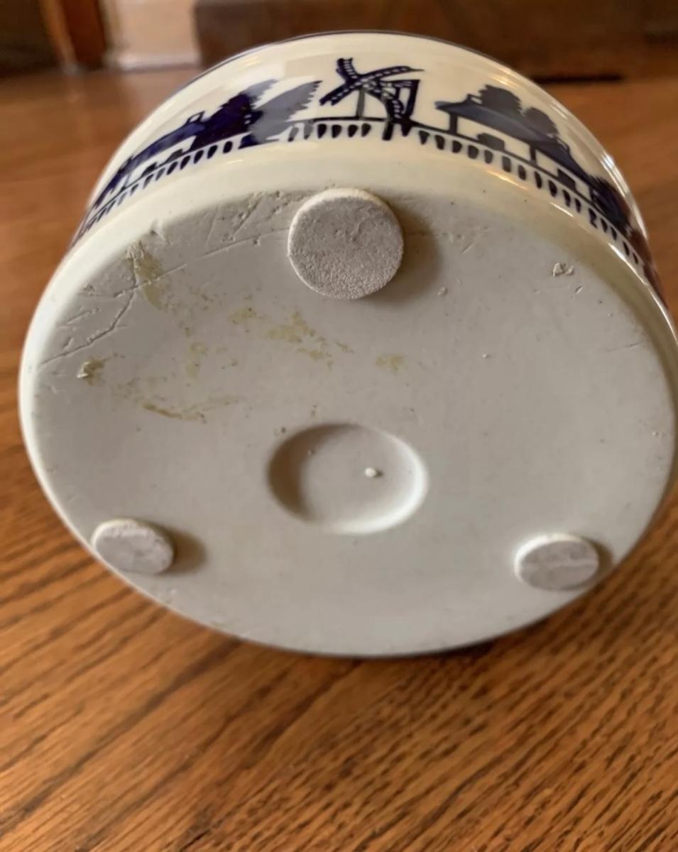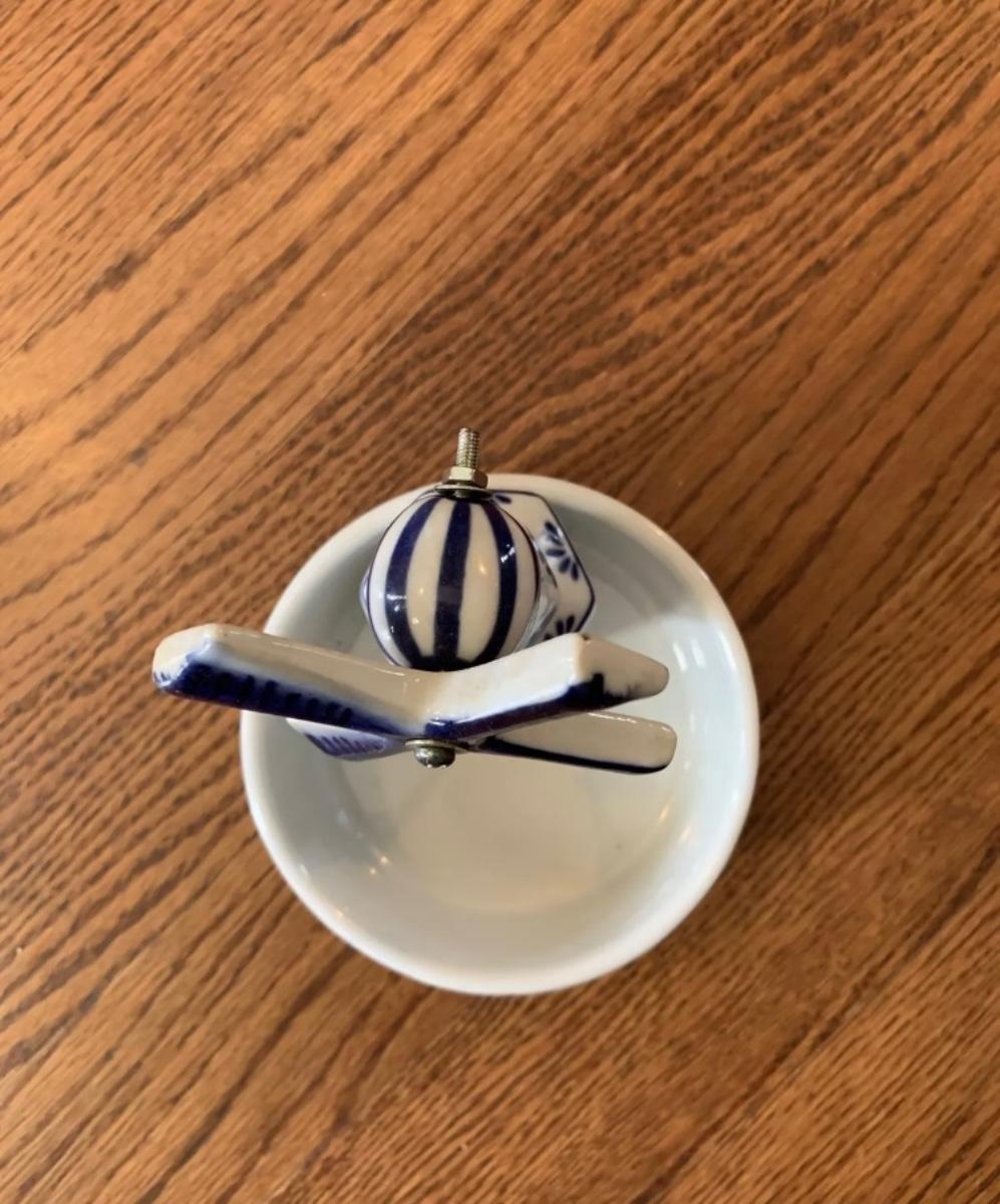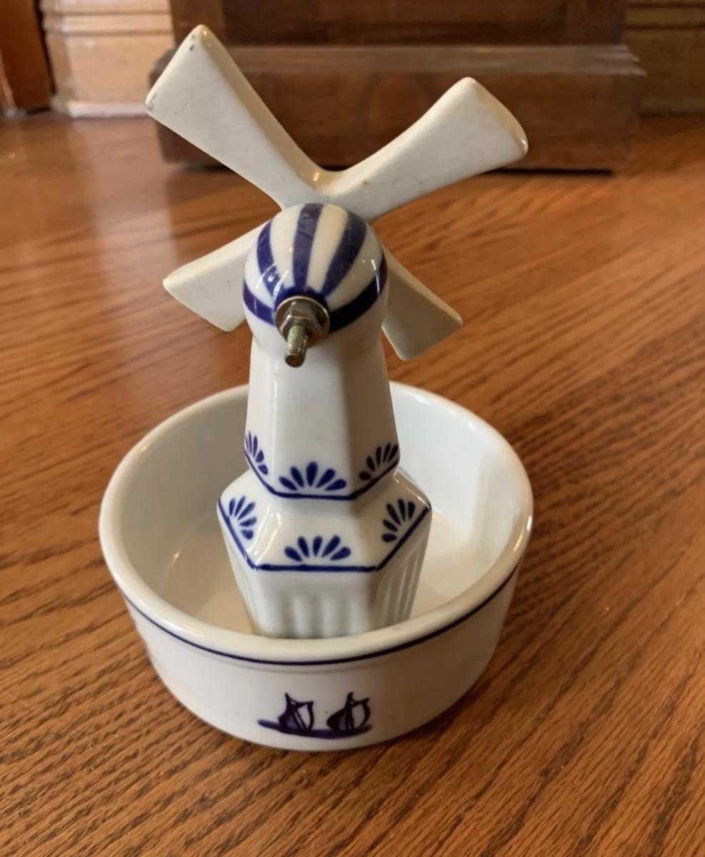 Vintage Delft HP blue-white porcelain windmill dish, Holland. Windmill turns