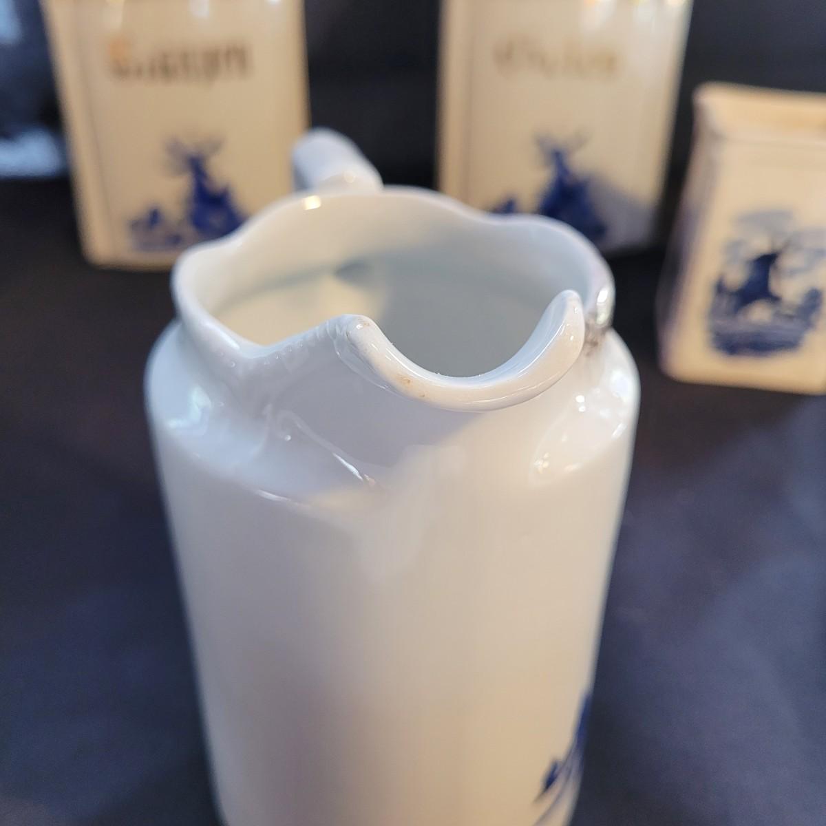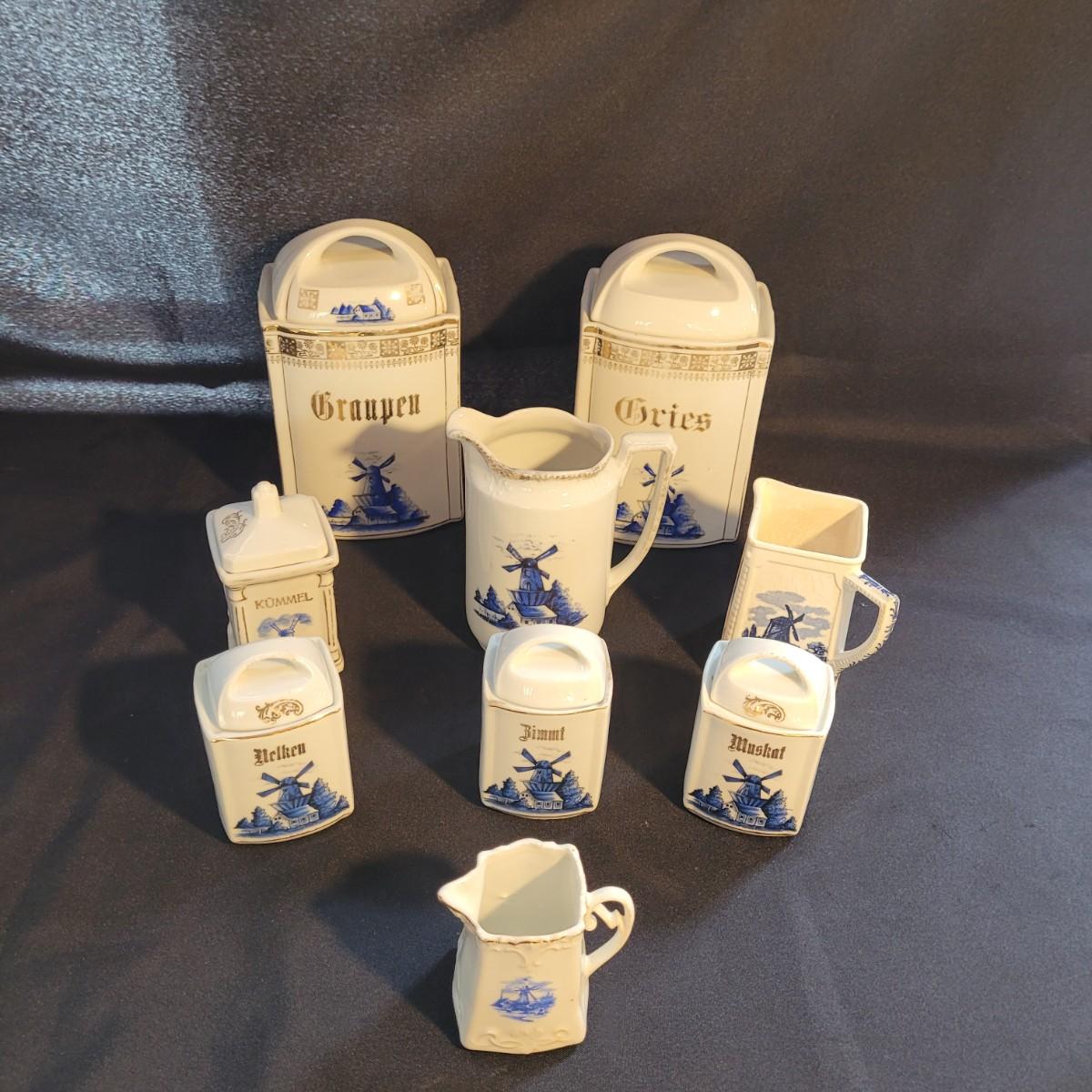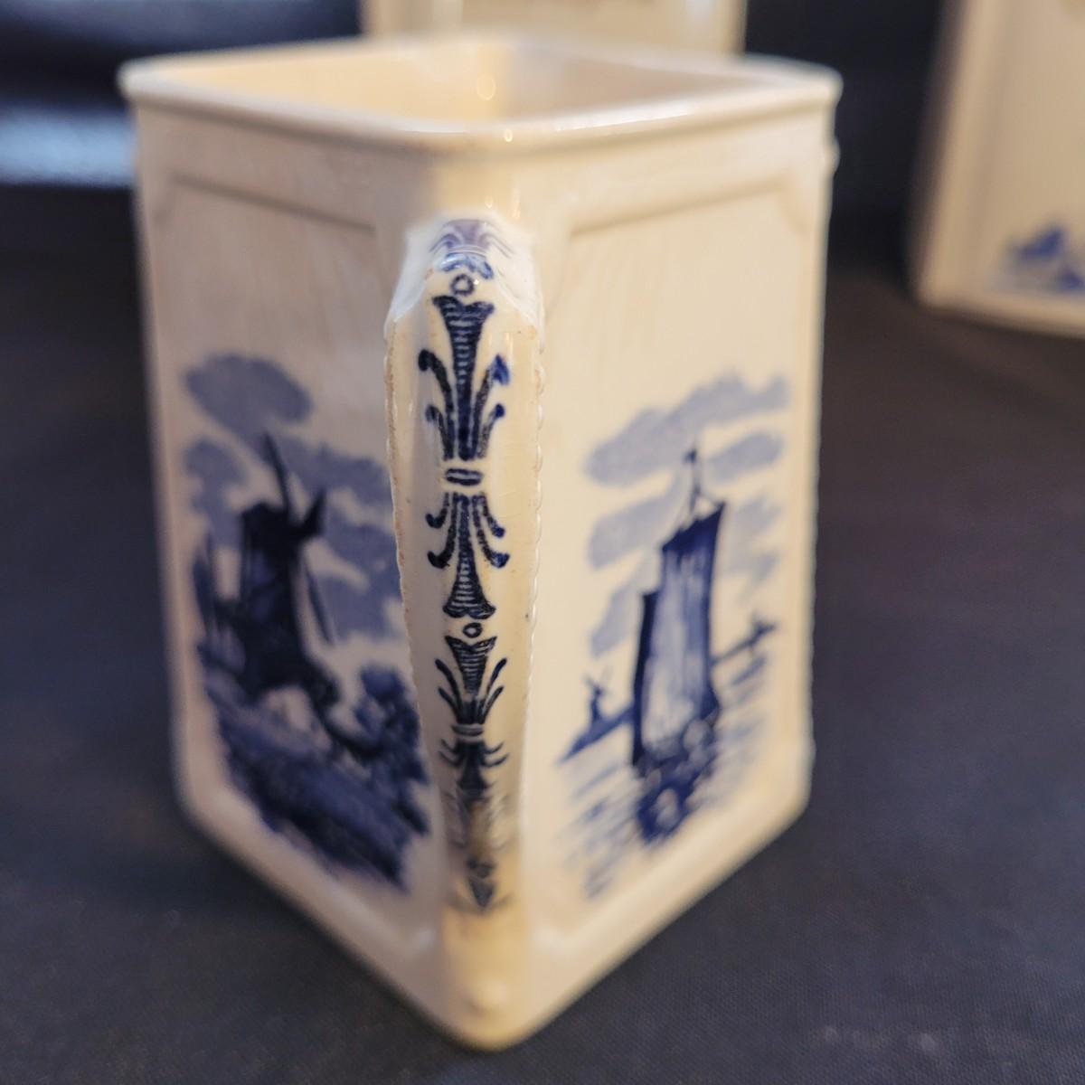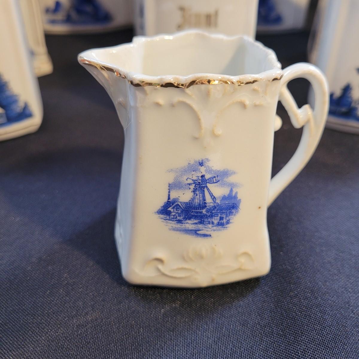 This Delft style collection of ceramic containers includes large and small lidded jars and creamers. Large lidded jars measure approximately 4.5” x 3.5” x 9”H. Some overall wear due to age. Please see photos for details. Shipping available.