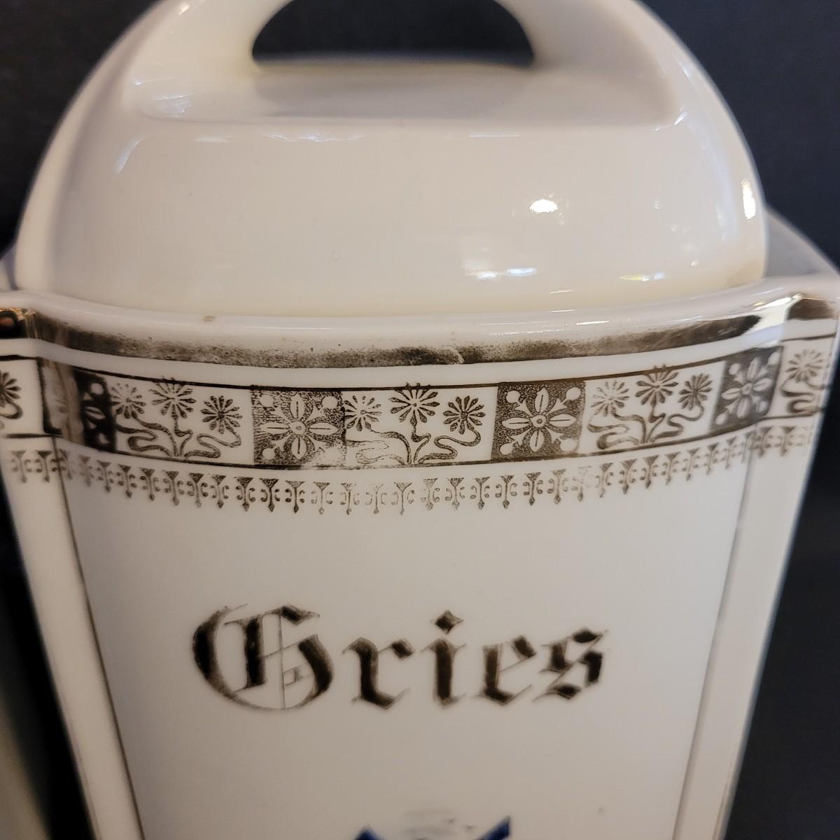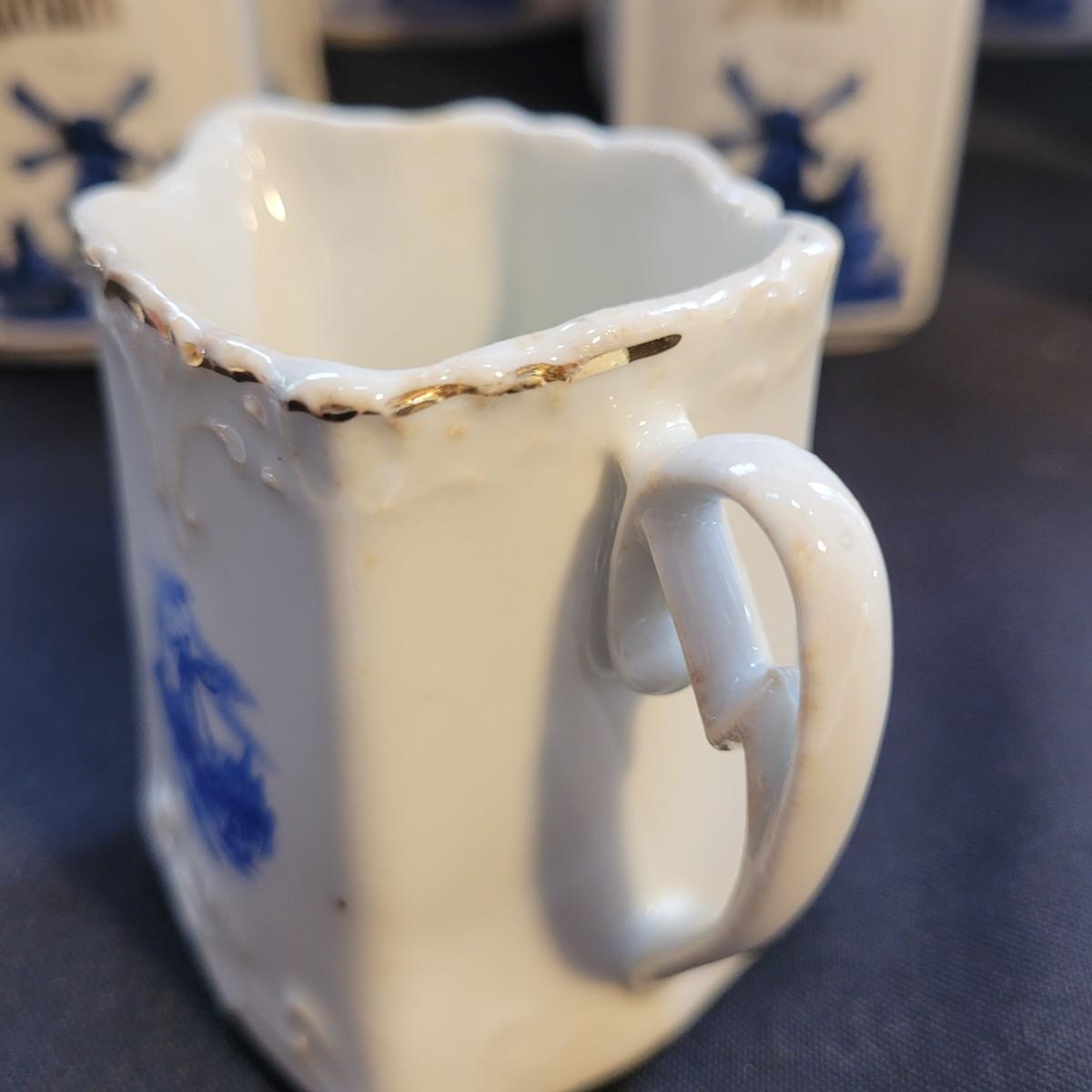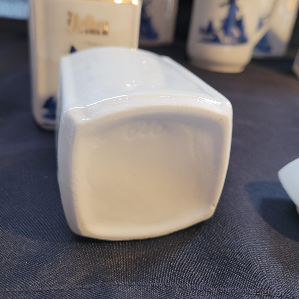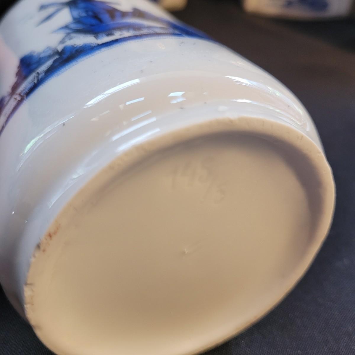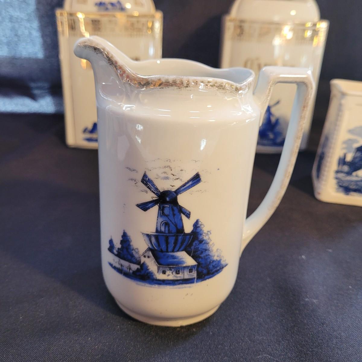 This Delft style collection of ceramic containers includes large and small lidded jars and creamers. Large lidded jars measure approximately 4.5” x 3.5” x 9”H. Some overall wear due to age. Please see photos for details. Shipping available.