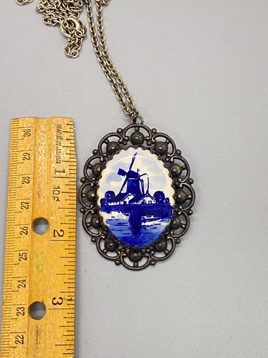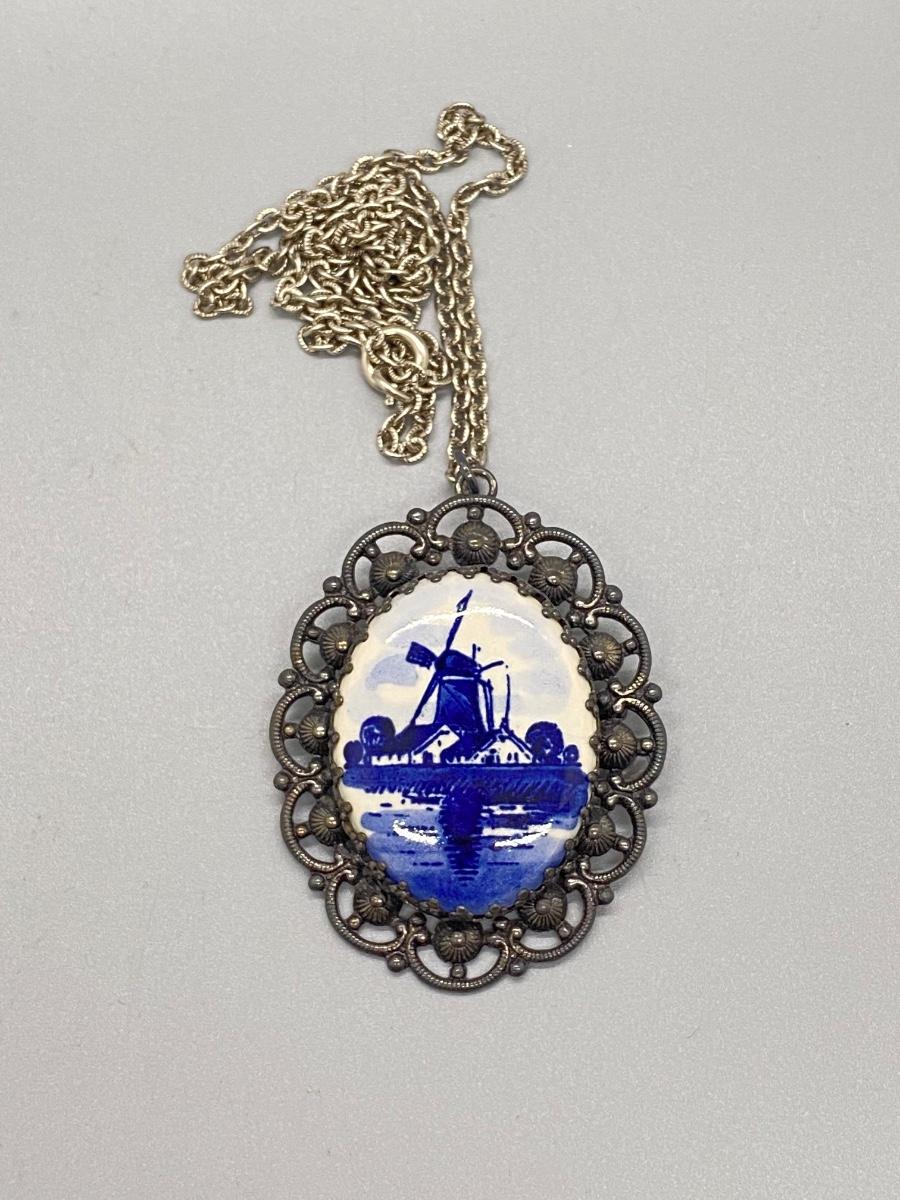 Vintage Delft medallion pendant necklace. Ceramic medallion with a windmill scene painted on it. Good vintage condition. Metal has discolored from age. Can be worn on a chain or as a pin.