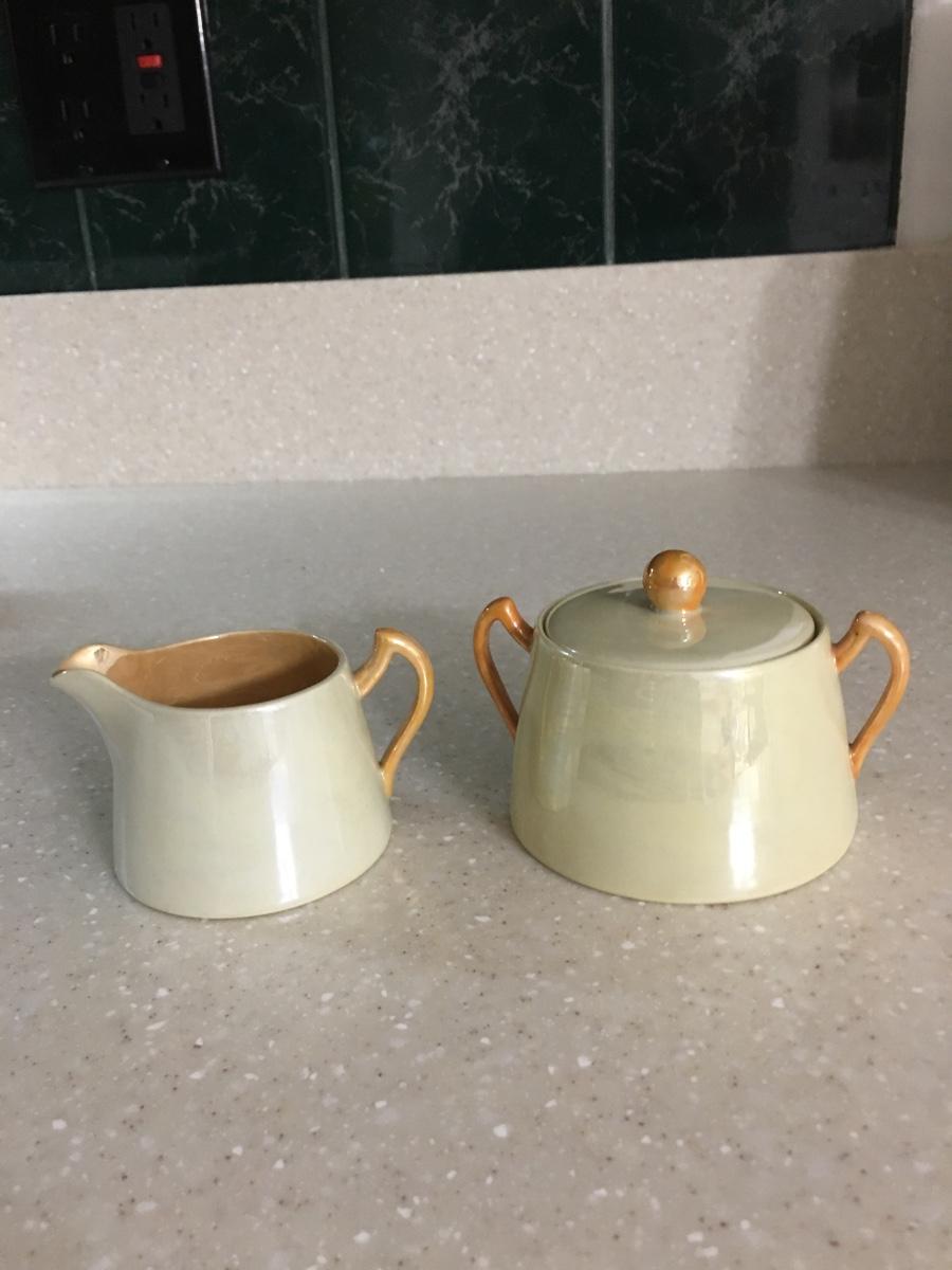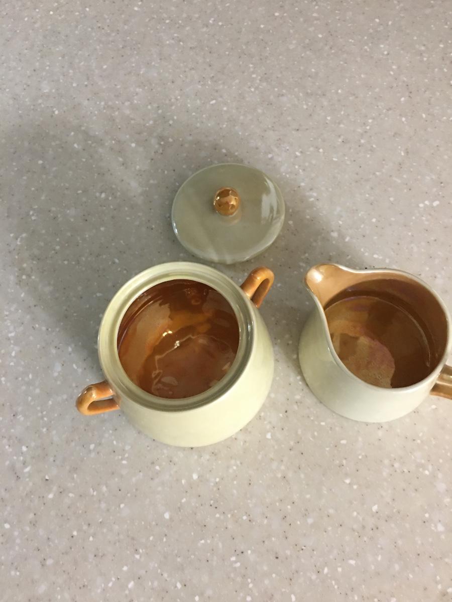 Vintage demitasse sugar and creamer set gold with iridescent ceramic glaze