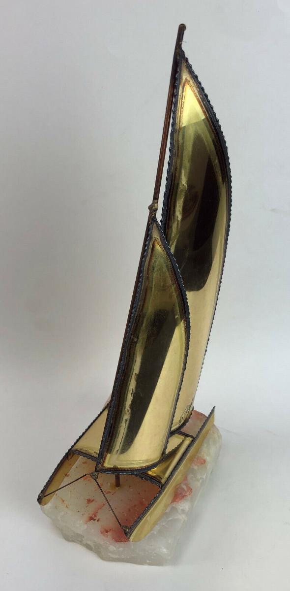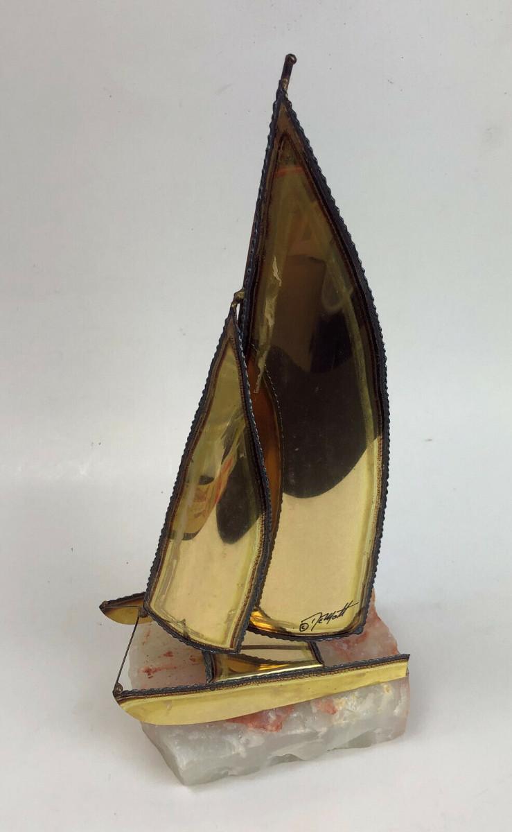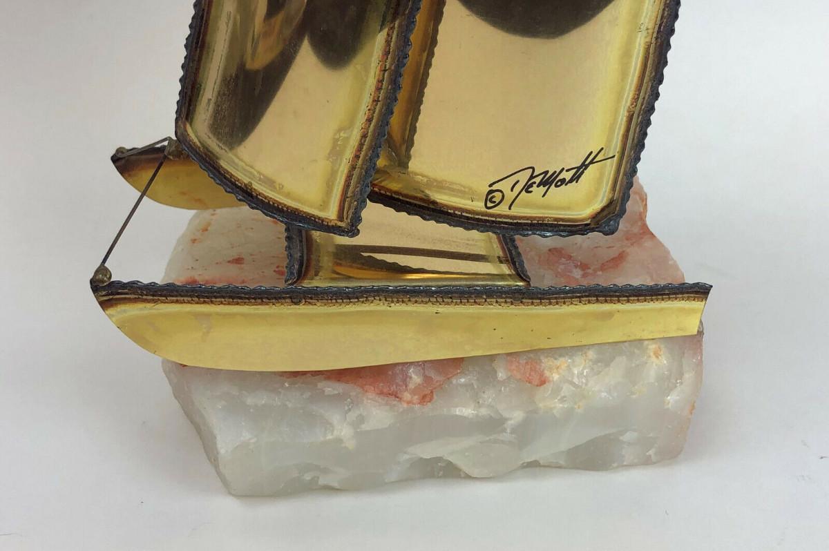 Here is a signed Brass Sailboat Sculpture on an Onyx base from brothers Jon and Don DeMott...13"h...6" base..Circa 1970's-80's...Very good condition...This original is offered with no reserve...