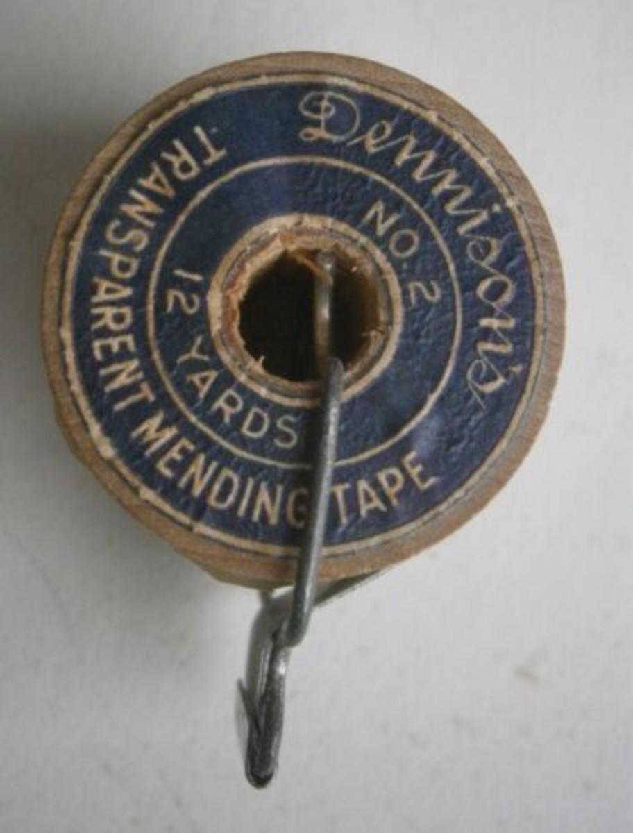 Vintage Denison's Adhesive Transparent Tape in Wood Dispenser from the early 1900's, tape on wood spool with wire holder, never used (tape no longer good), nice early desktop item.