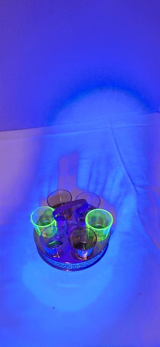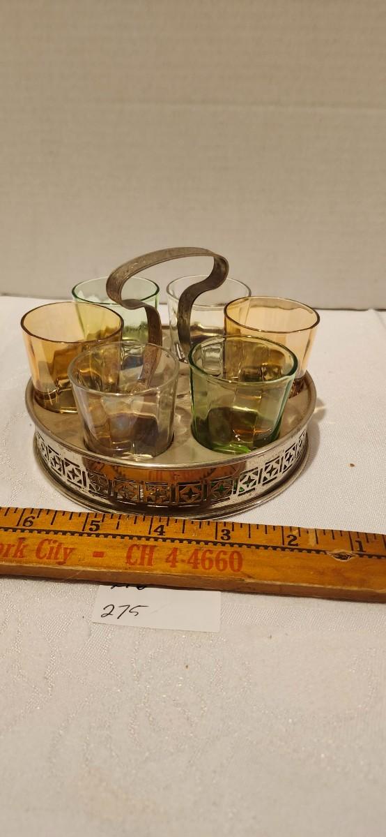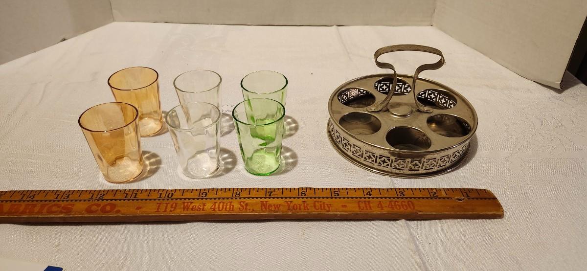 Vintage Depression Colored Shot Glasses with Silverplated Serving Tray, with Uranium grass