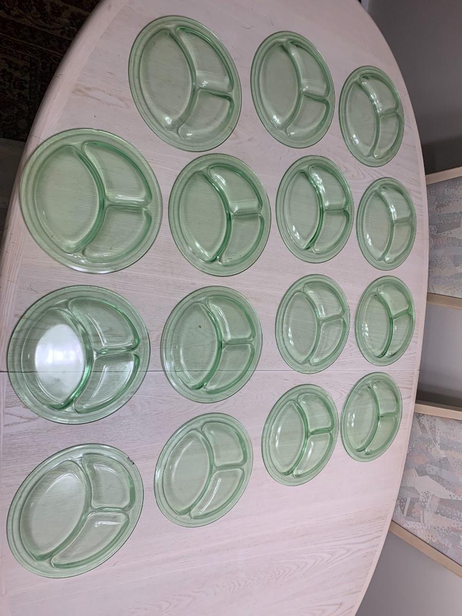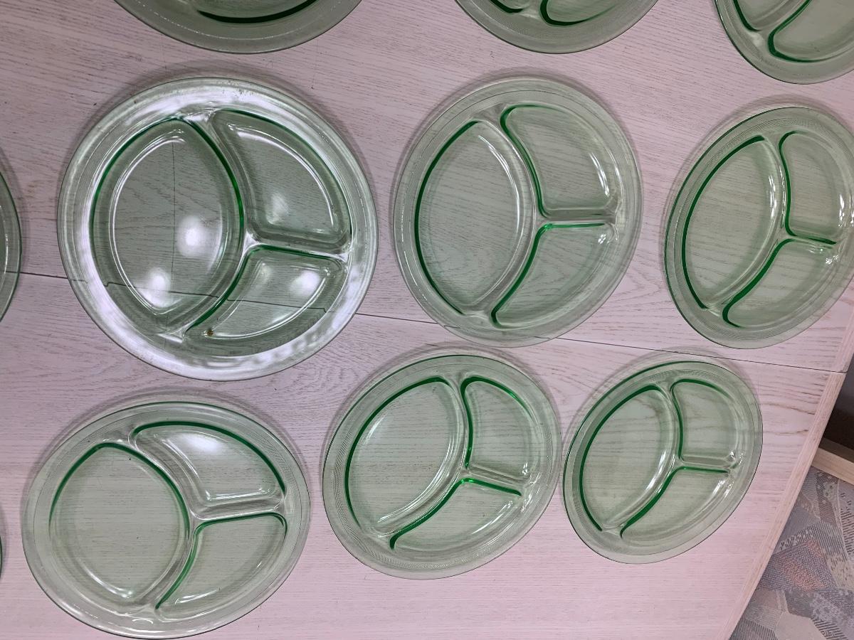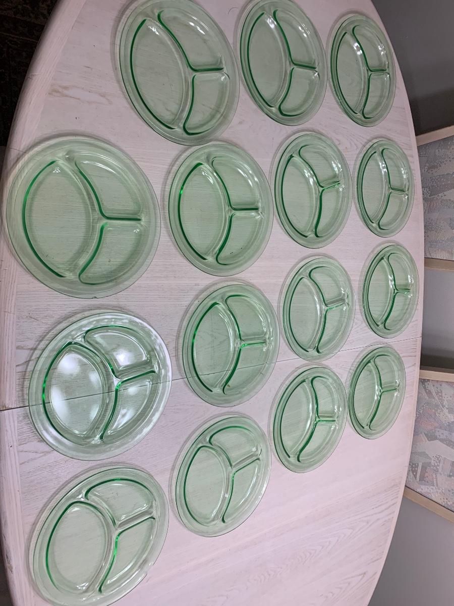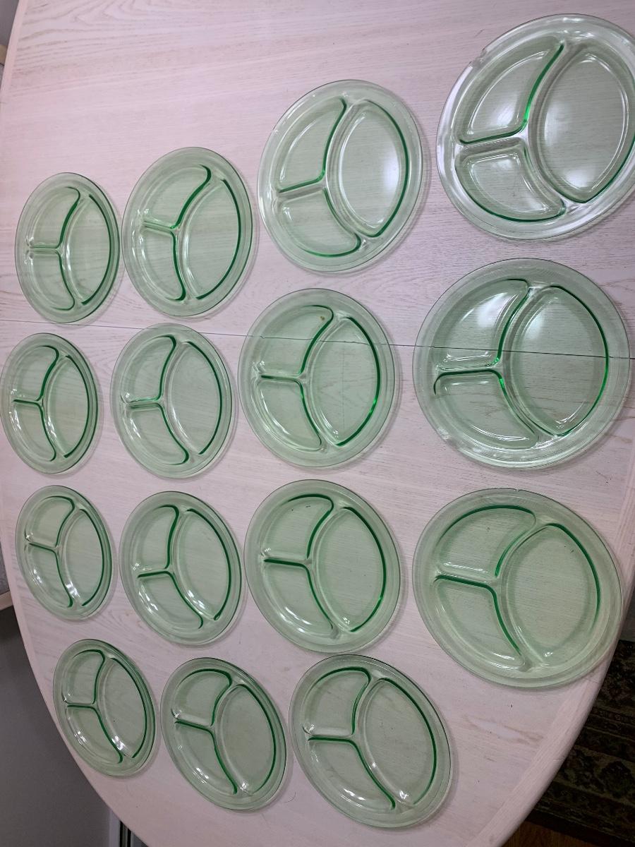 Here is a set of 15 vintage Depression green glass 9” plates. They are uranium plates. The plates are in good condition except for 3 of the plates which have chips in them as shown in the photos.