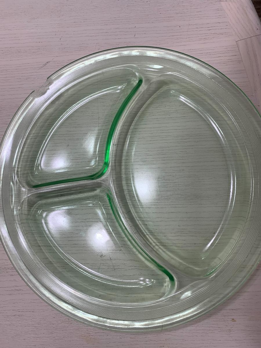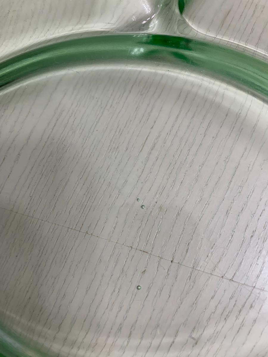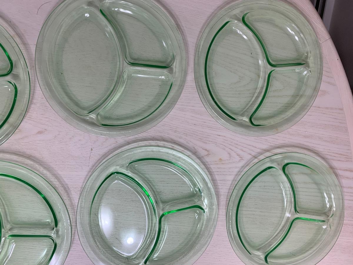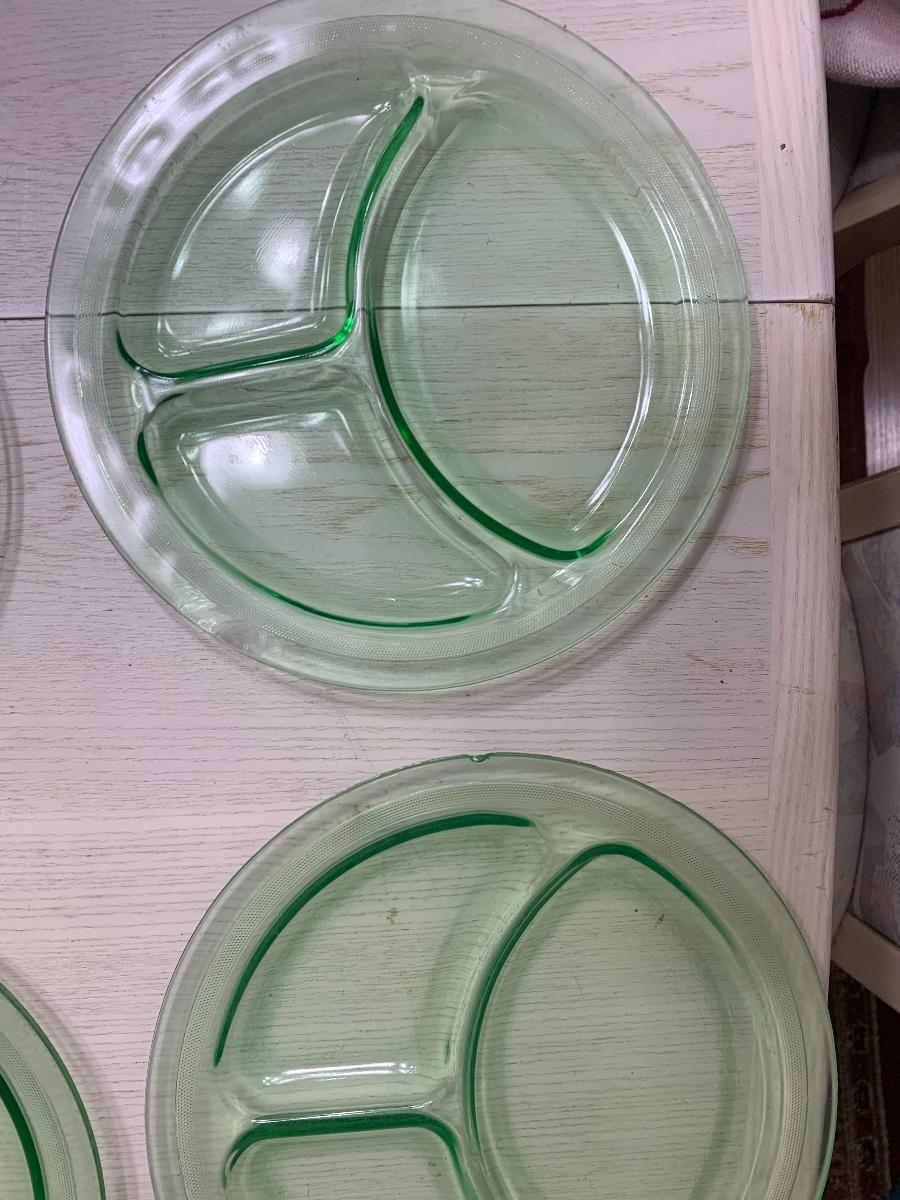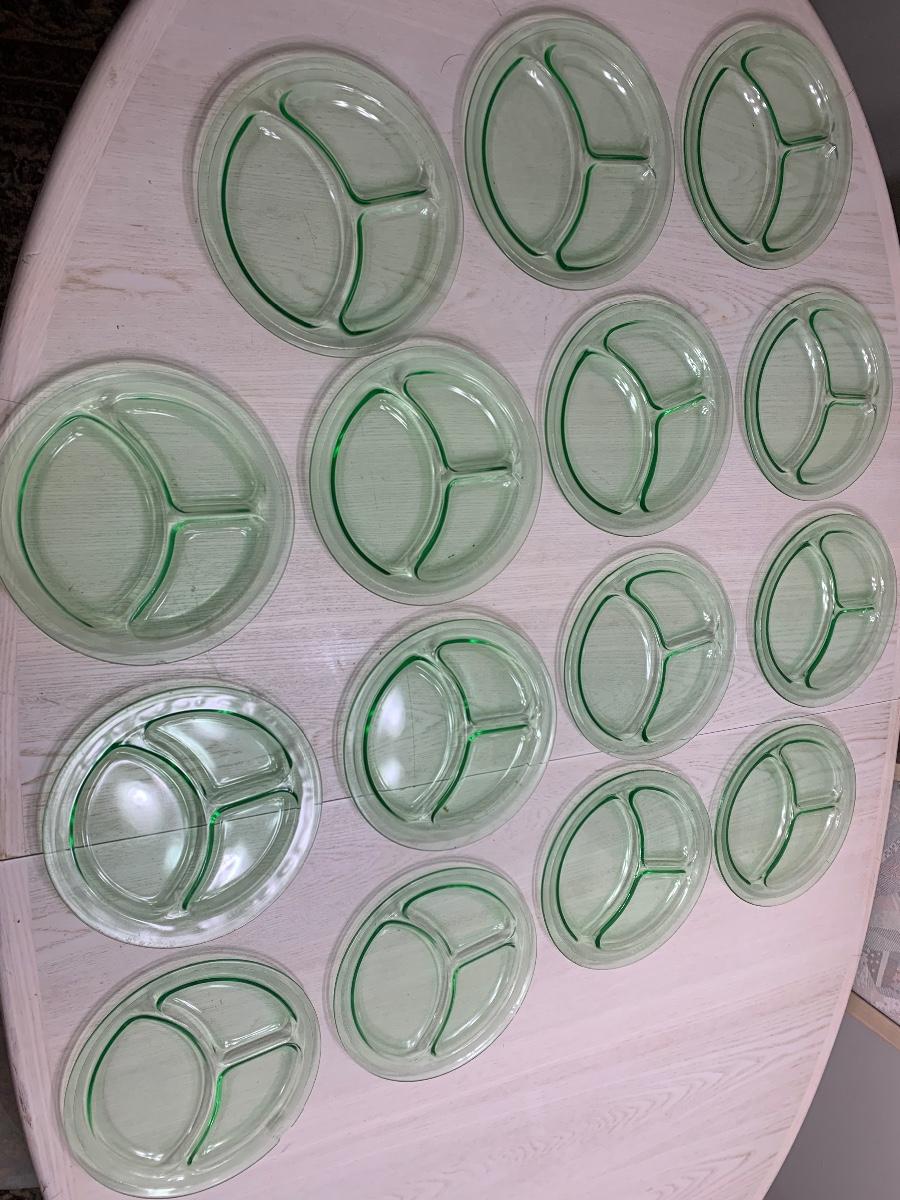Here is a set of 15 vintage Depression green glass 9” plates. They are uranium plates. The plates are in good condition except for 3 of the plates which have chips in them as shown in the photos.