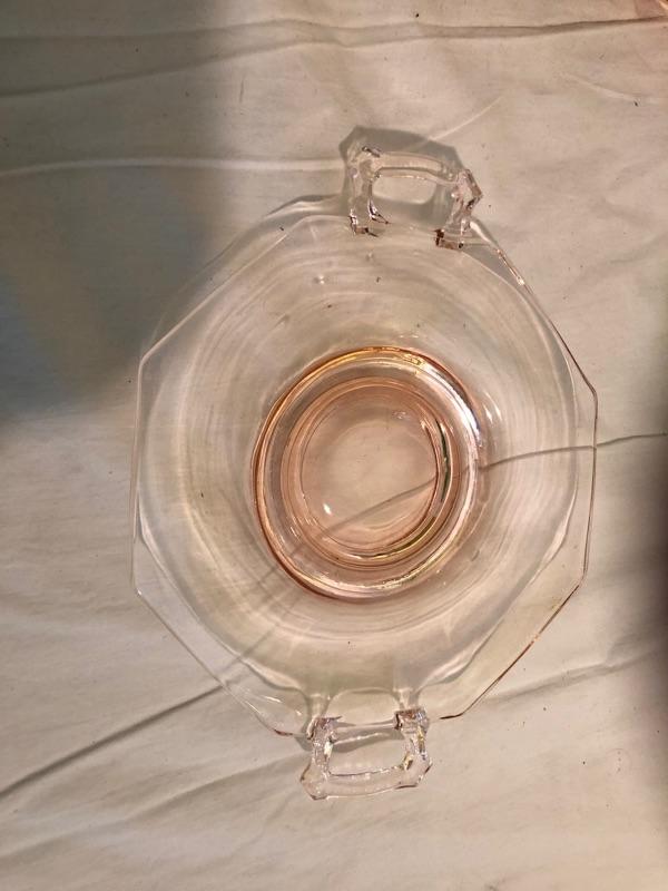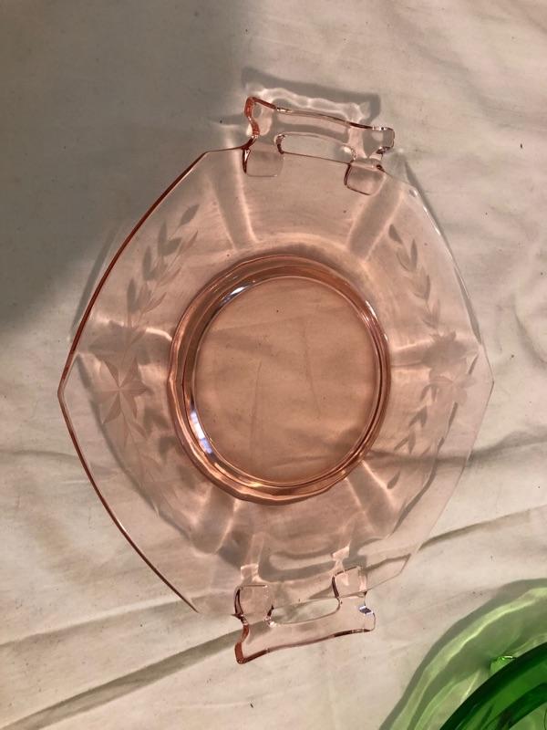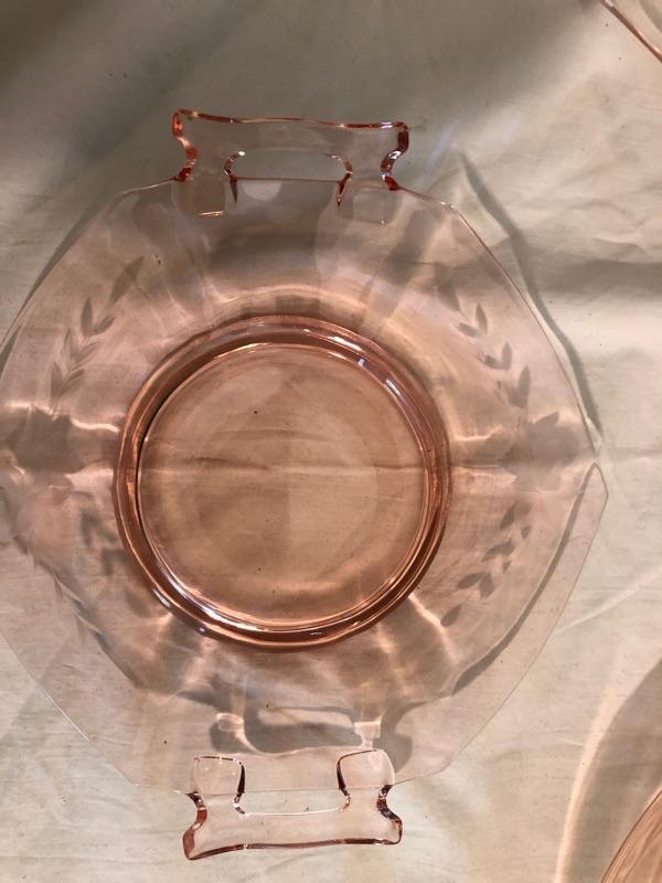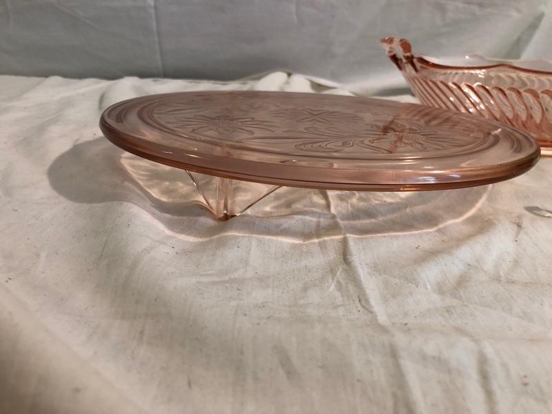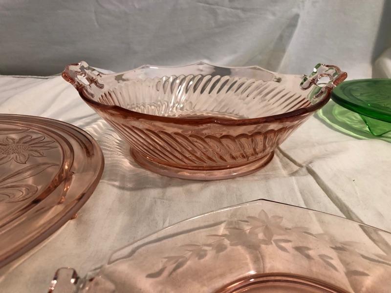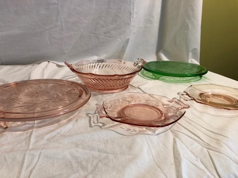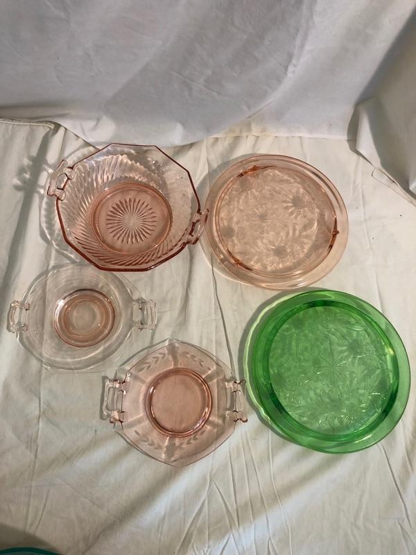 Vintage  depression glass cake plates, serving bowl and plates in pink and green