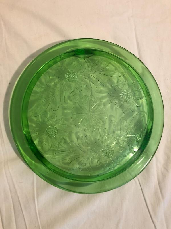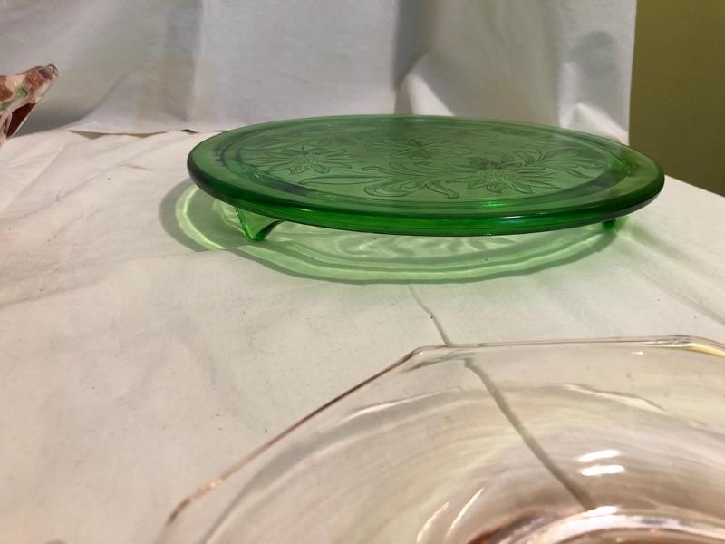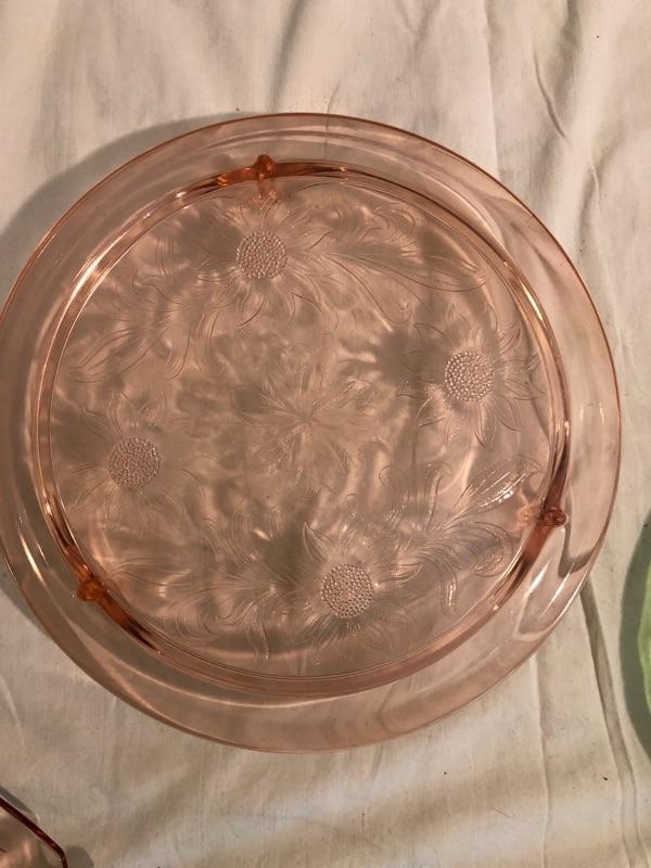 2 matching cake plates in vintage pink and green depression glass floral design along with a vintage pink glass serving bowl and 2 plates Cake plates are 10in in diameter and serving is 8.5in diameter and small plates are 7in diameter