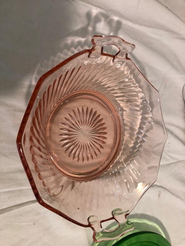 Vintage  depression glass cake plates, serving bowl and plates in pink and green