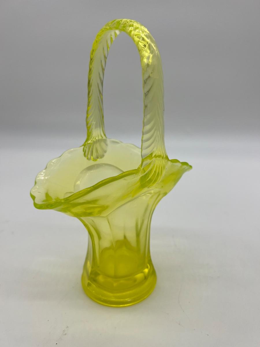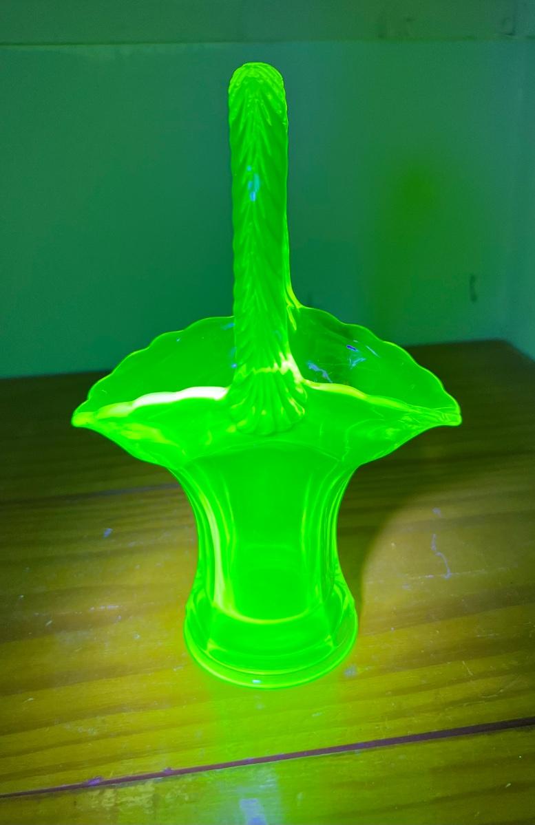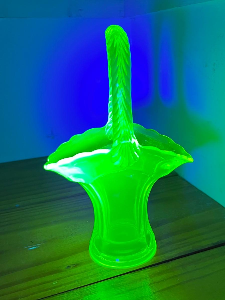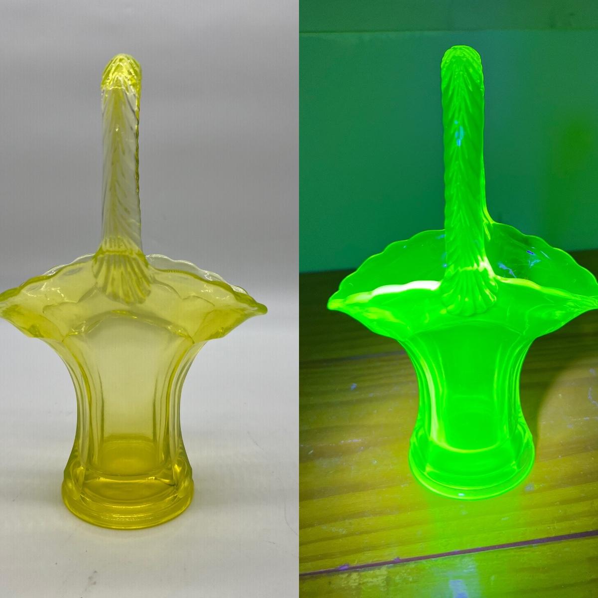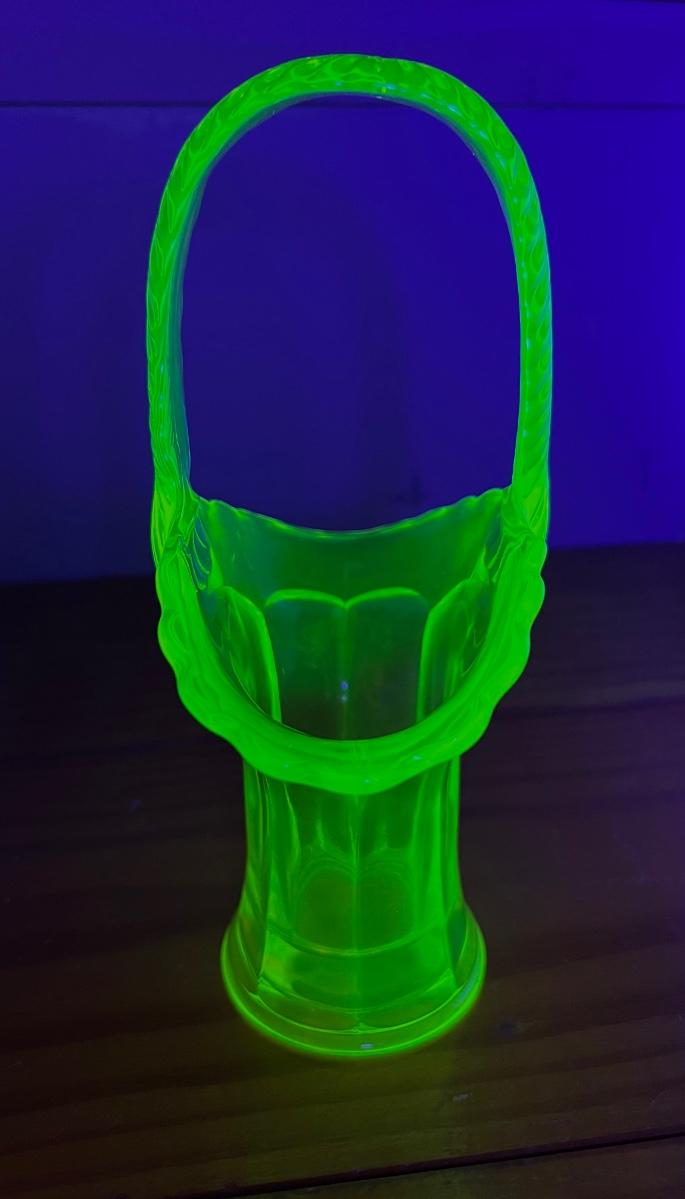 Vintage Green depression Uranium Glass Basket with handle UV Reactive measures 8 1/2 inches tall and 5 1/2 inches wide.